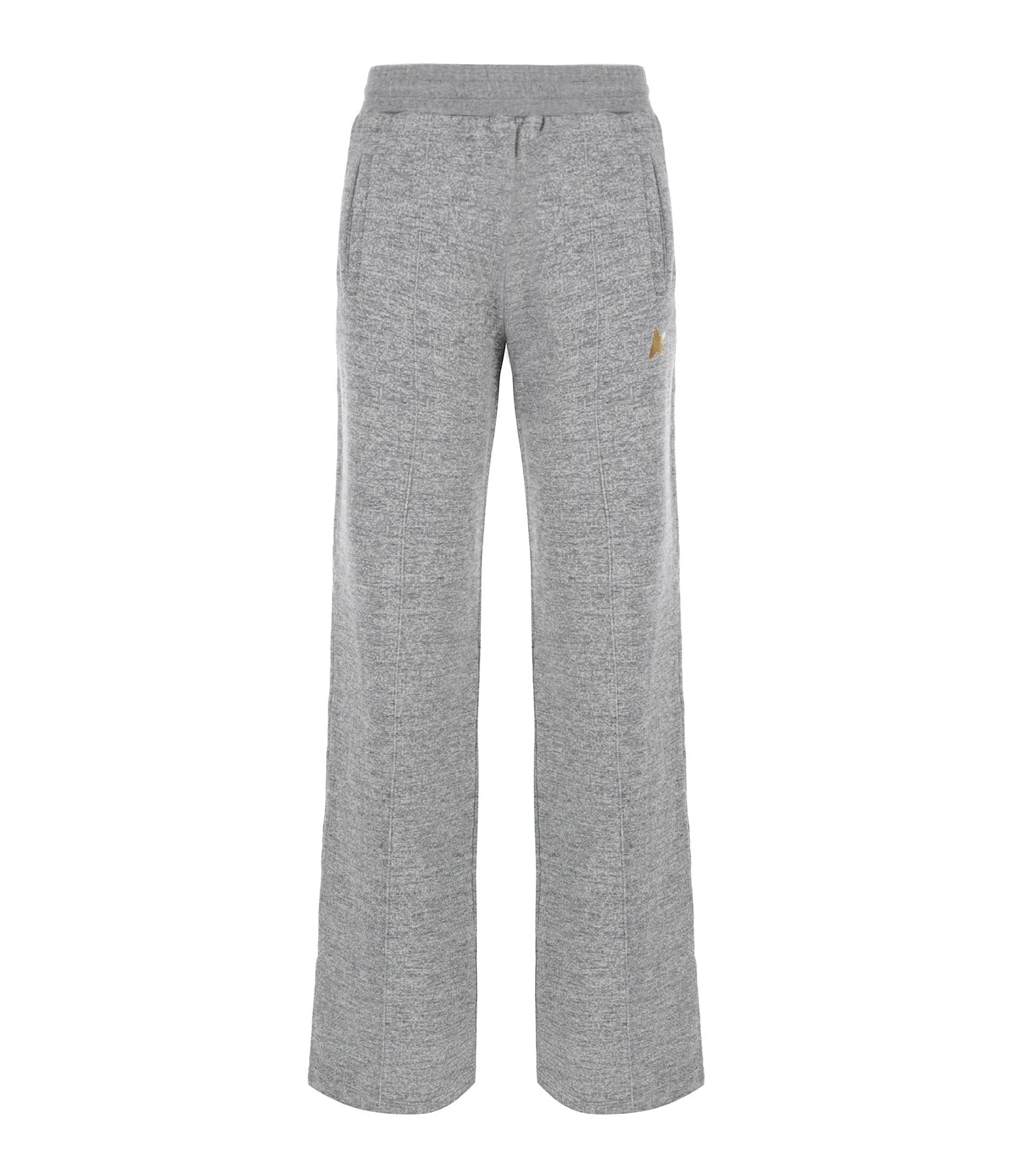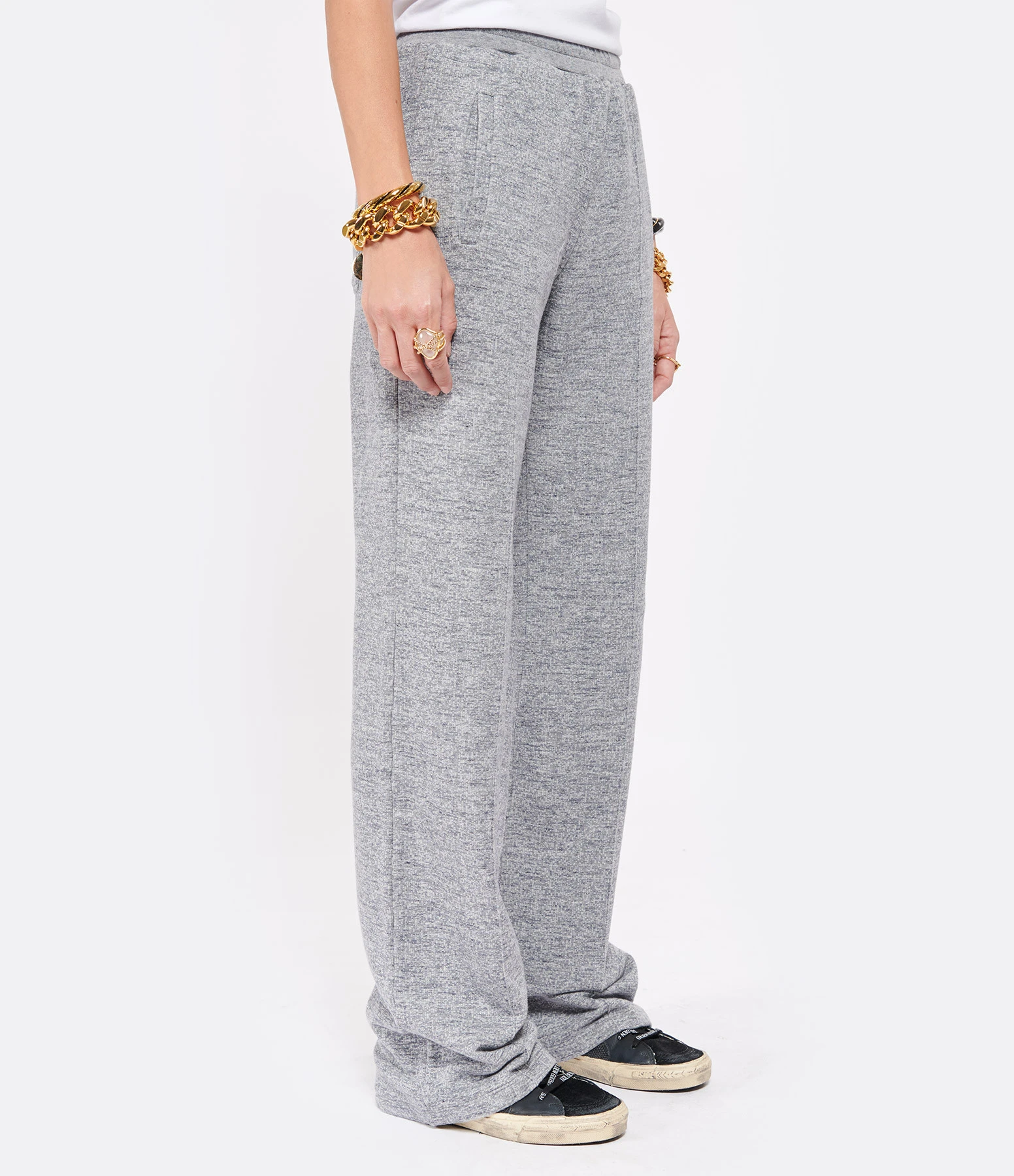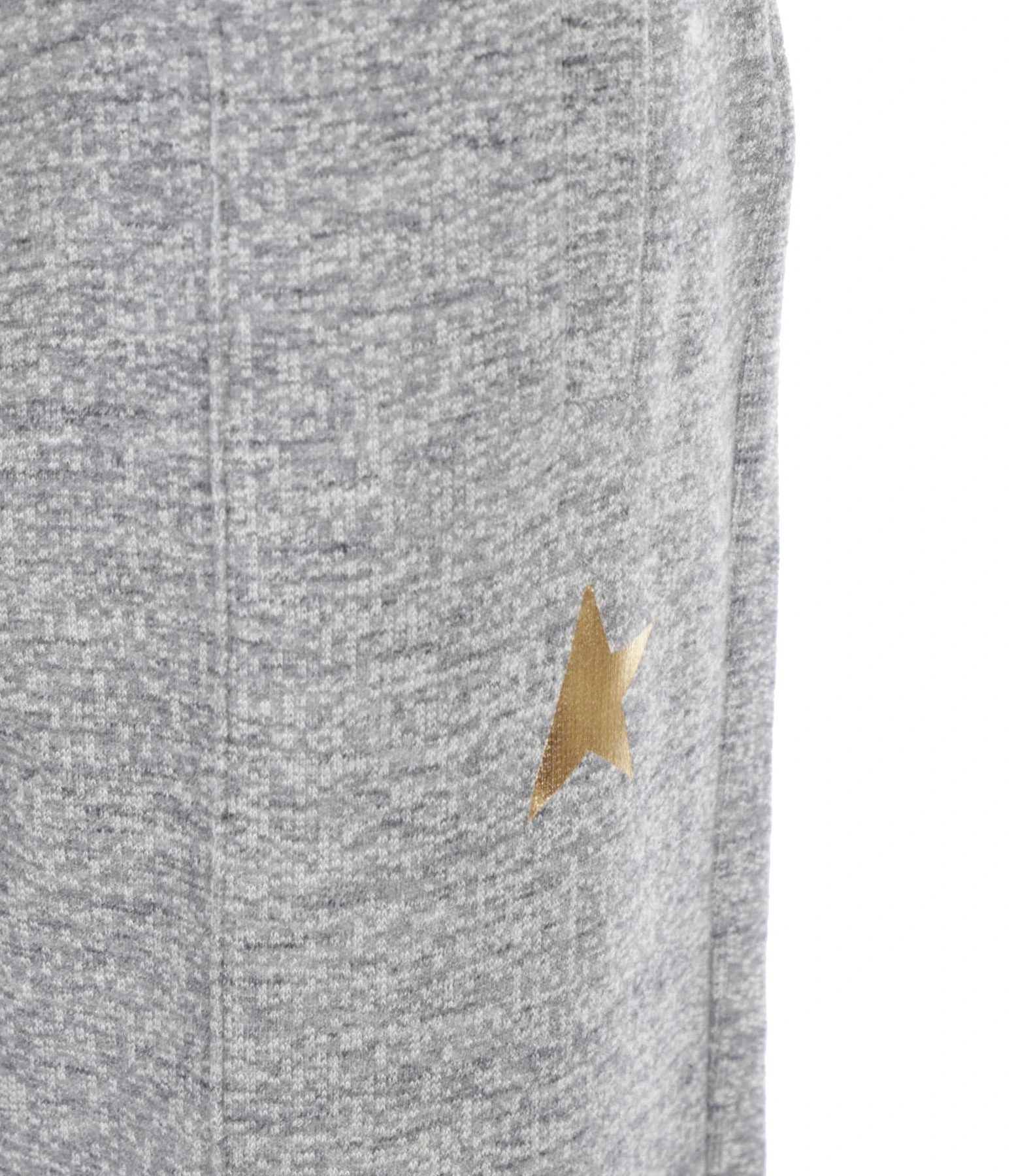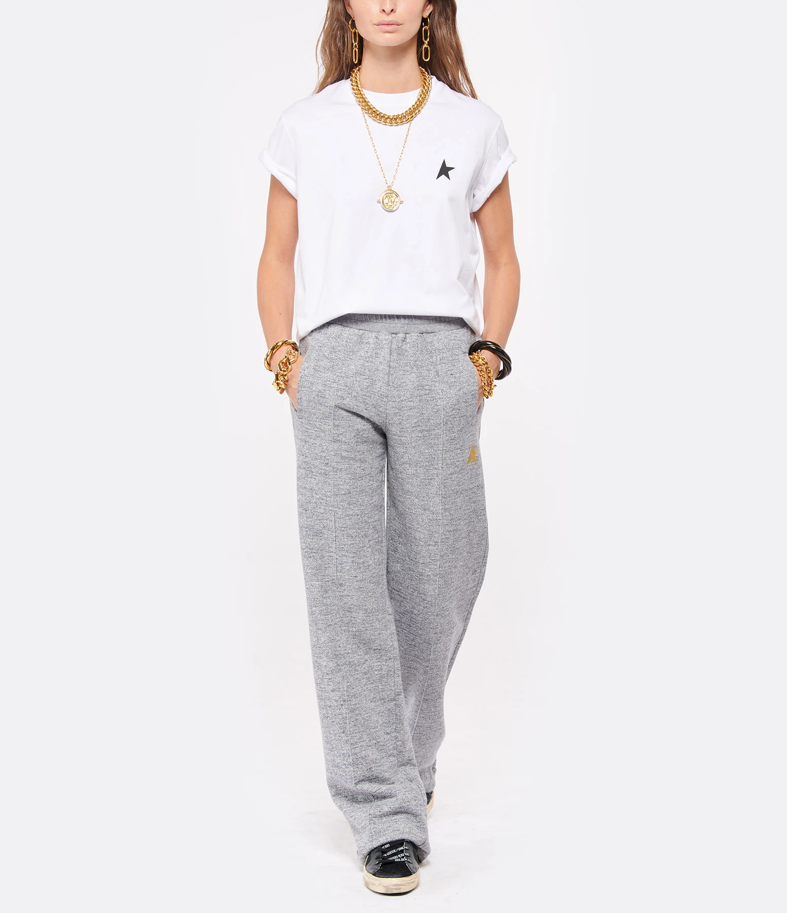 Pantalon de jogging gris chiné. Étoile doré à l’avant. Taille élastiquée. Lien de serrage à l’intérieur. Deux poches fendues et une poche plaquée à l’arrière.