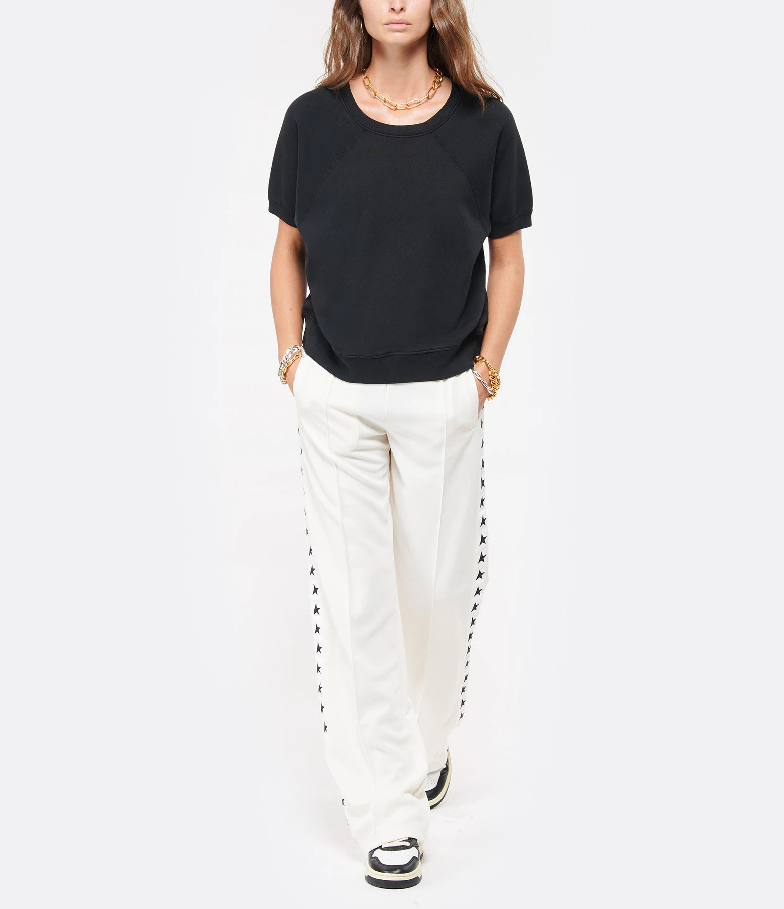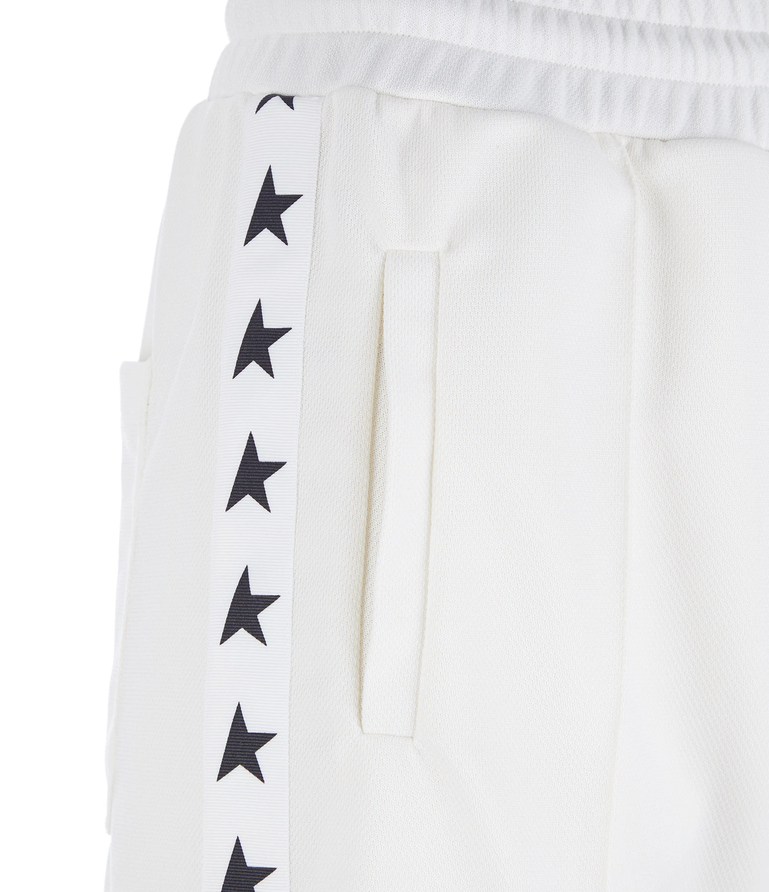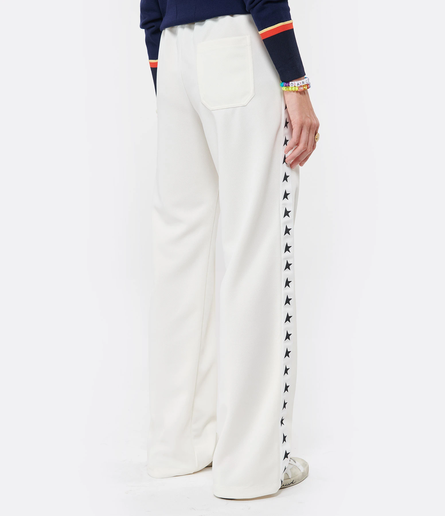Pantalon de jogging blanc. Série d’étoiles sur les côtés. Taille élastiquée. Lien de serrage à l’intérieur. Deux poches fendues et une poche passepoilée à l’arrière.