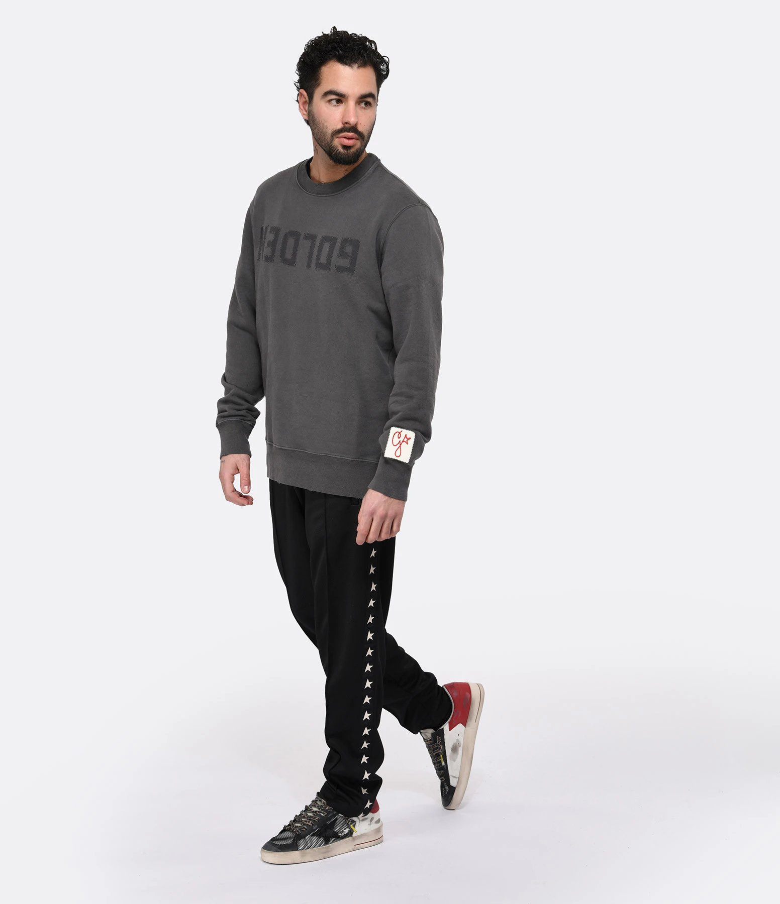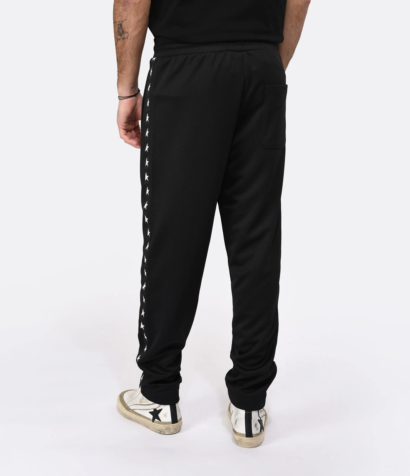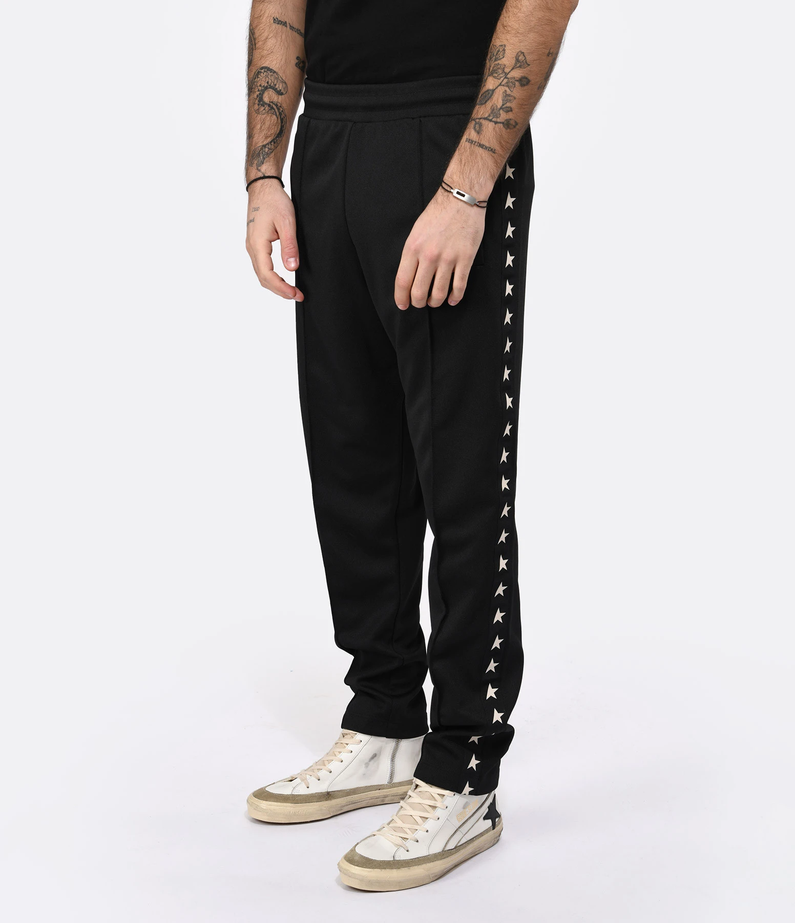 Pantalon de jogging noir. Série d’étoiles sur les côtés. Taille élastiquée. Lien de serrage à l’intérieur. Deux poches fendues et une poche passepoilée à l’arrière.