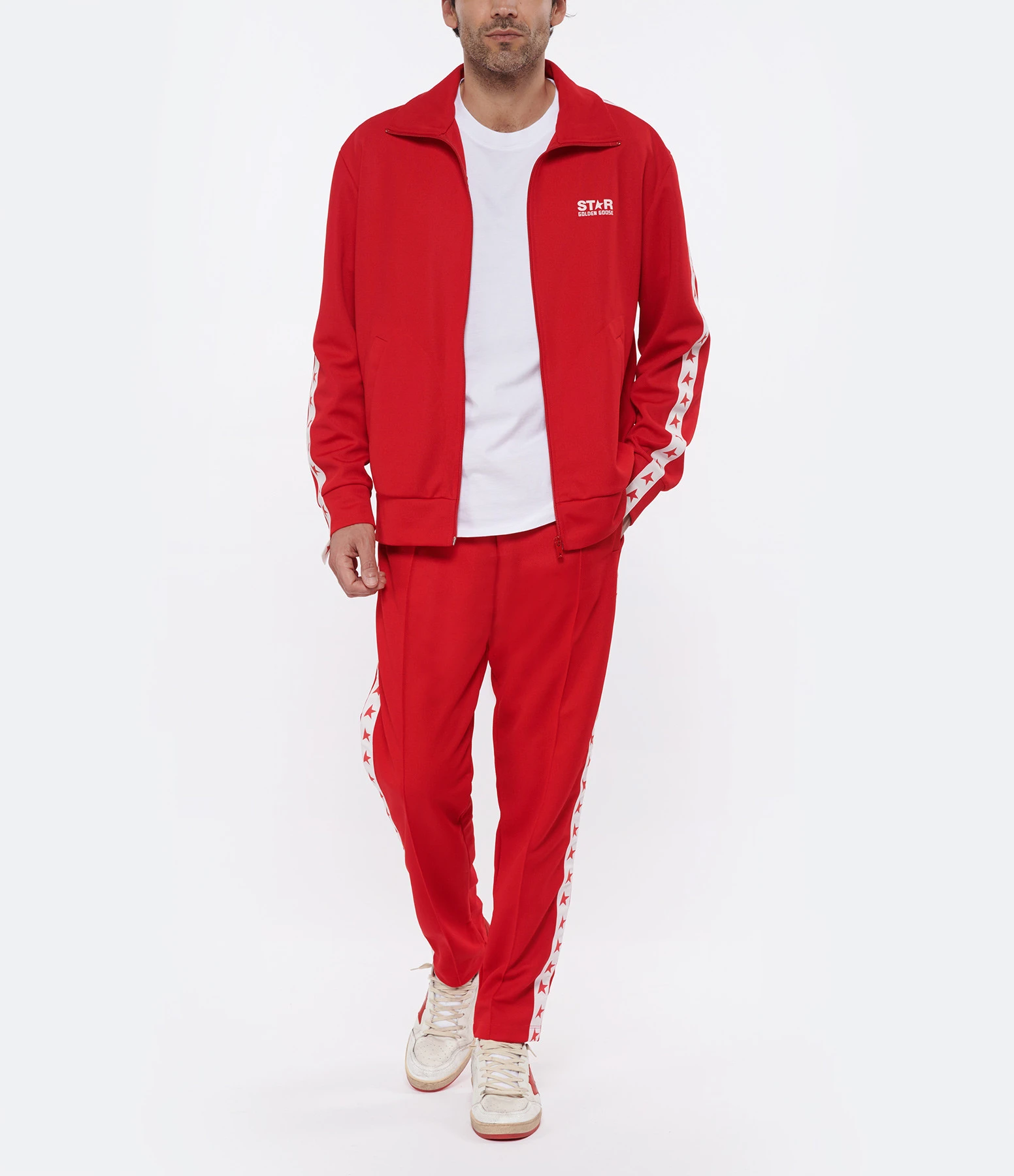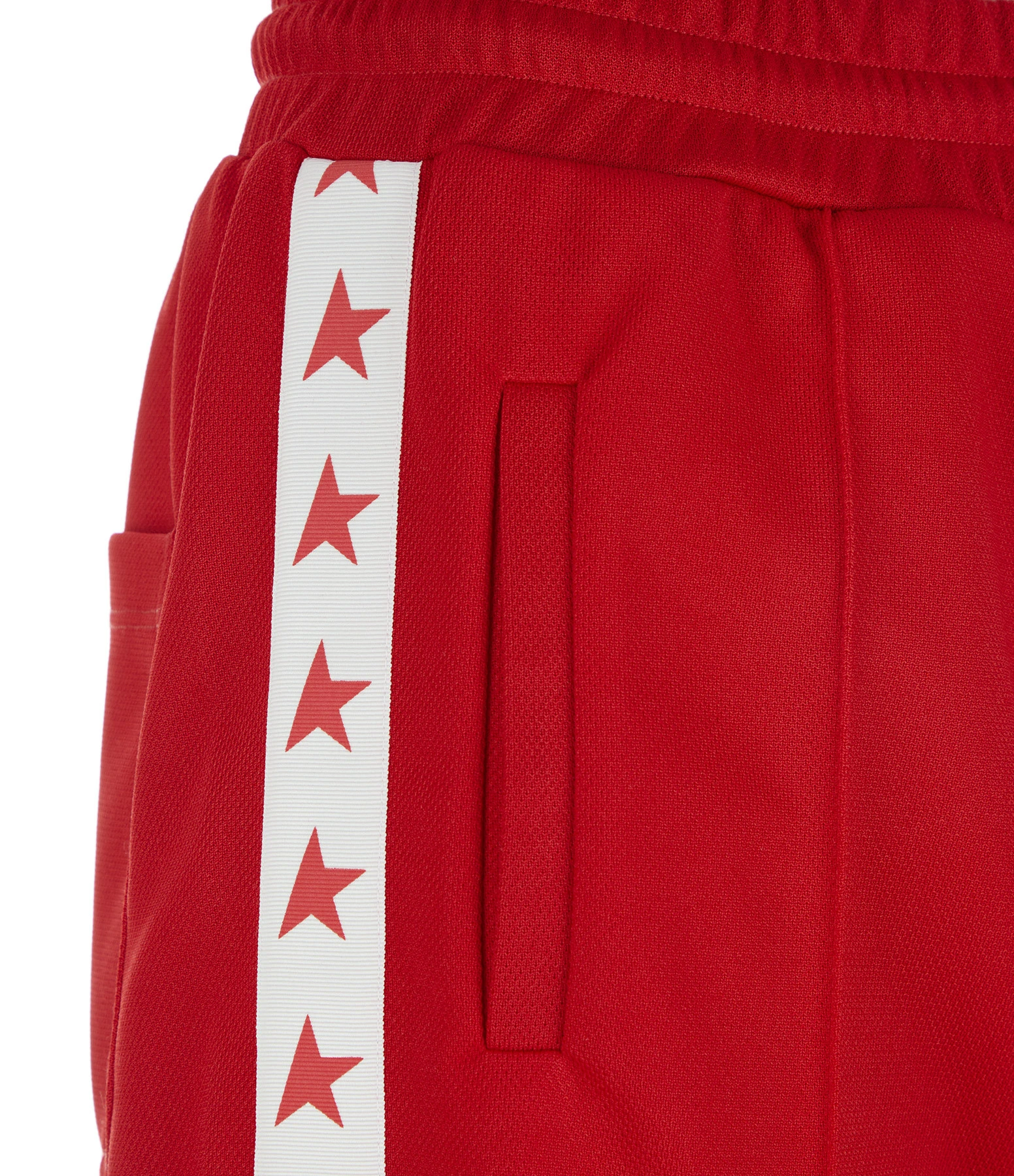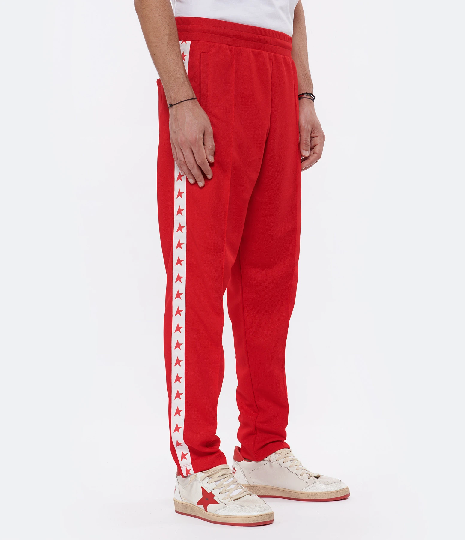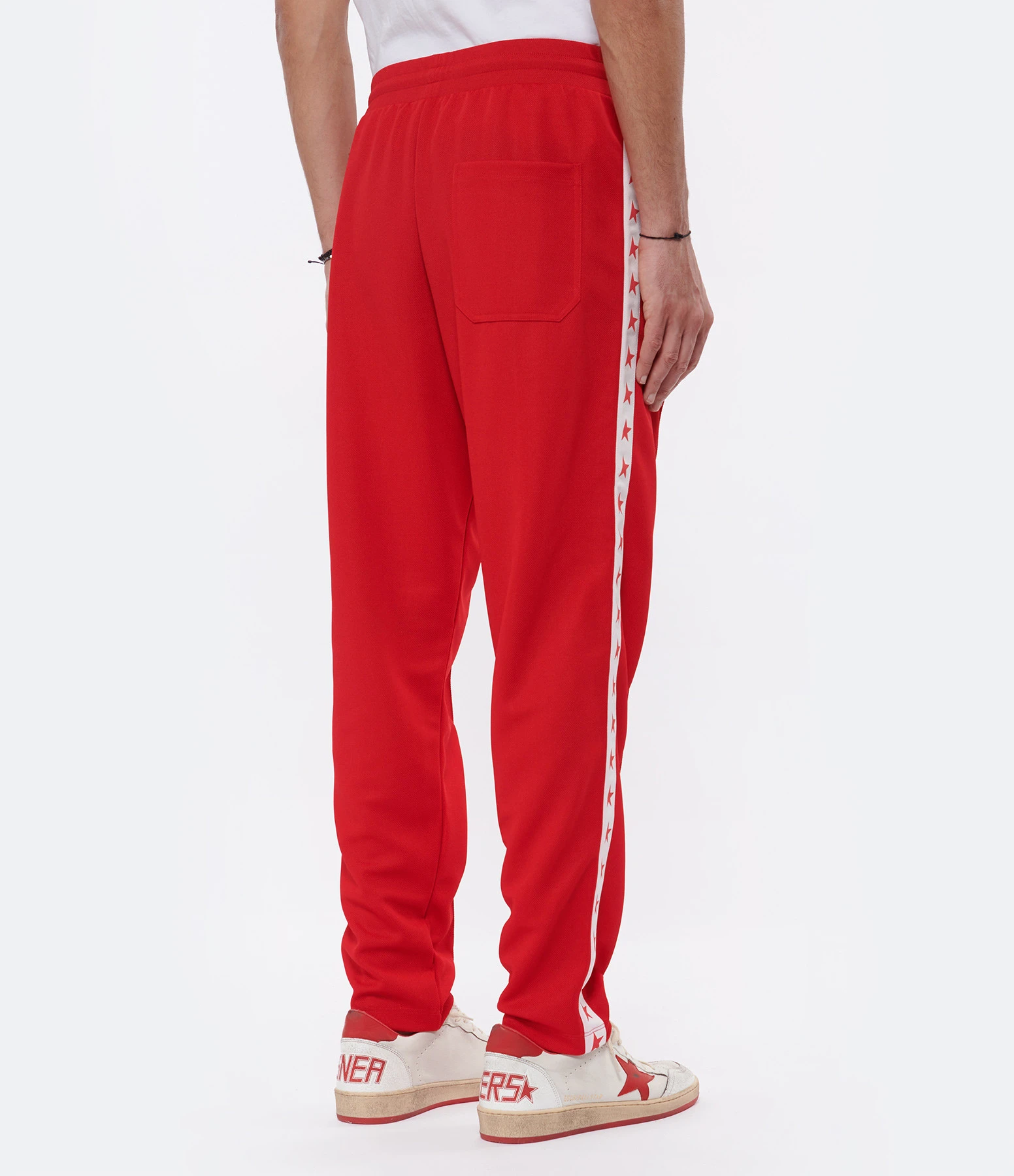 Pantalon de jogging rouge. Bande blanche avec série d’étoiles rouges sur les côtés. Taille élastiquée. Lien de serrage à l’intérieur. Deux poches fendues et une poche plaquée à l’arrière.