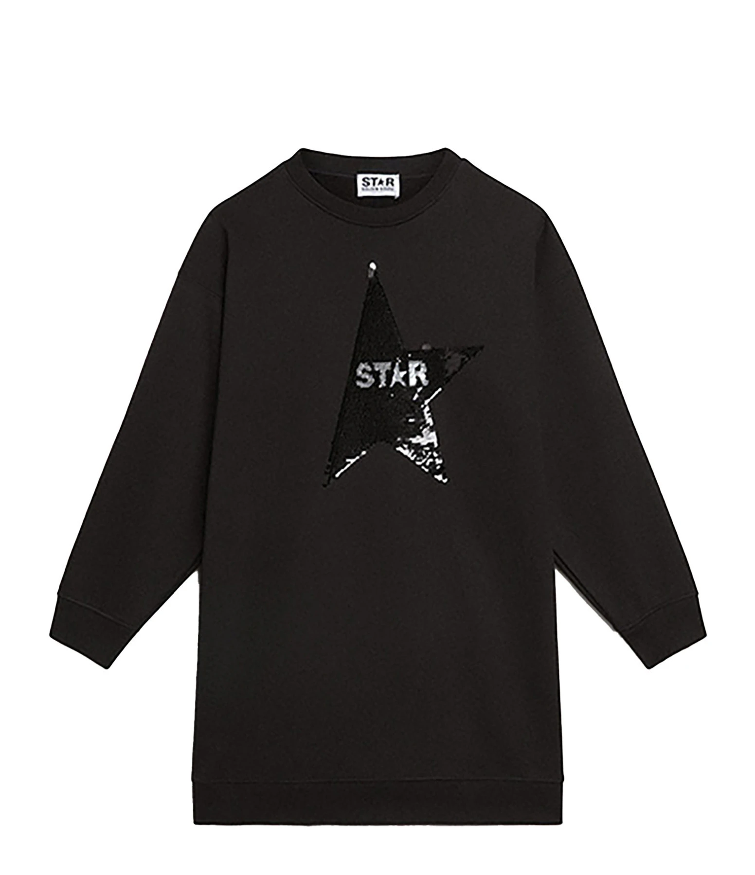 Robe sweatshirt en coton noir. Étoile en sequins noir avec inscription « STAR » en argenté. Col rond. Manches longues. Coupe droite. Base droite. Non doublé.