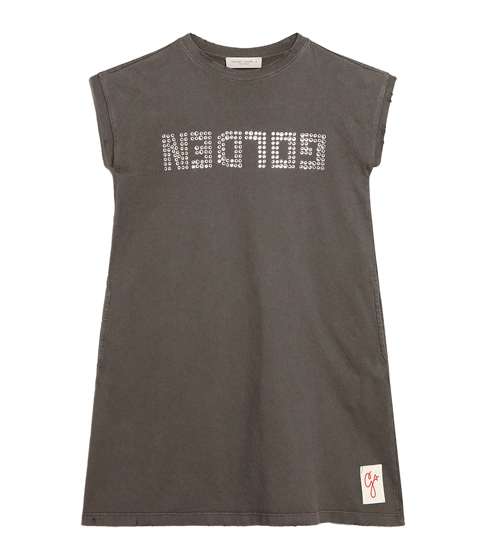 Robe tee-shirt en jersey de coton anthracite avec l’inscription GOLDEN en strass sur le devant. Col rond. Manches courtes. Patch amovible avec la lettre G brodée en rouge sur le devant. Coupe droite. Base droite.