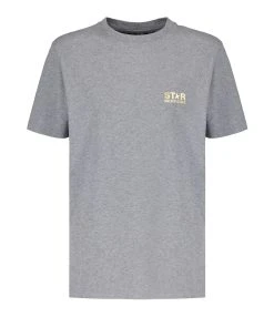 Tee-shirt en coton gris. Inscription poitrine dorée « STAR GOLDEN GOOSE » sérigraphiée. Logo étoile dorée sérigraphié au dos. Col rond côtelé. Manches courtes. Coupe droite. Base droite. Non doublé.