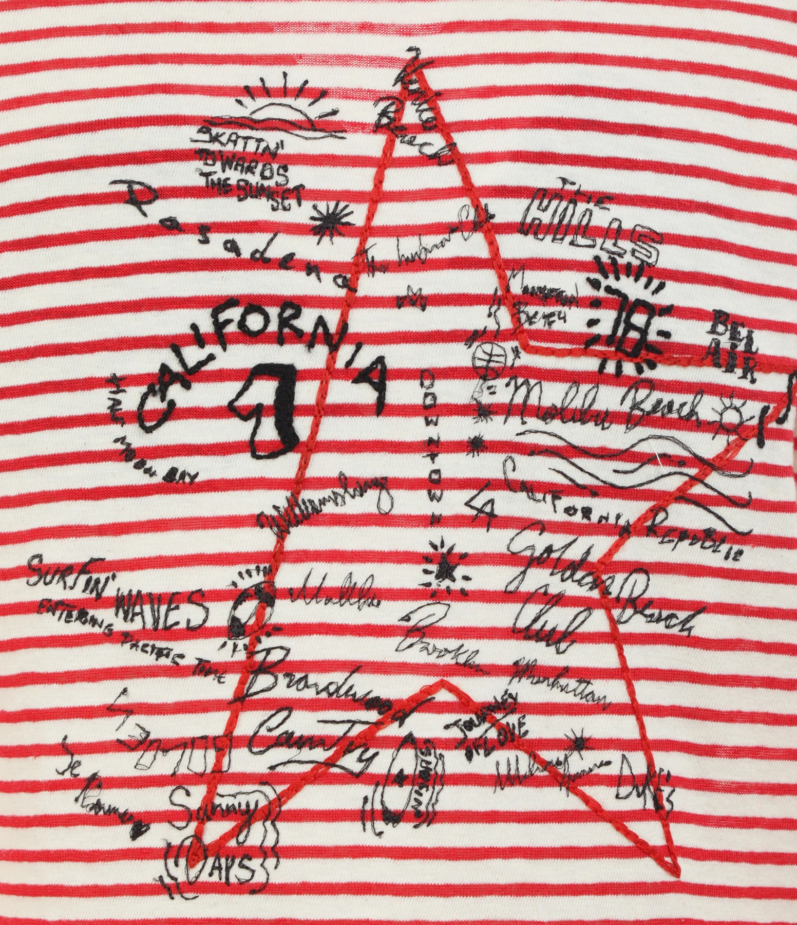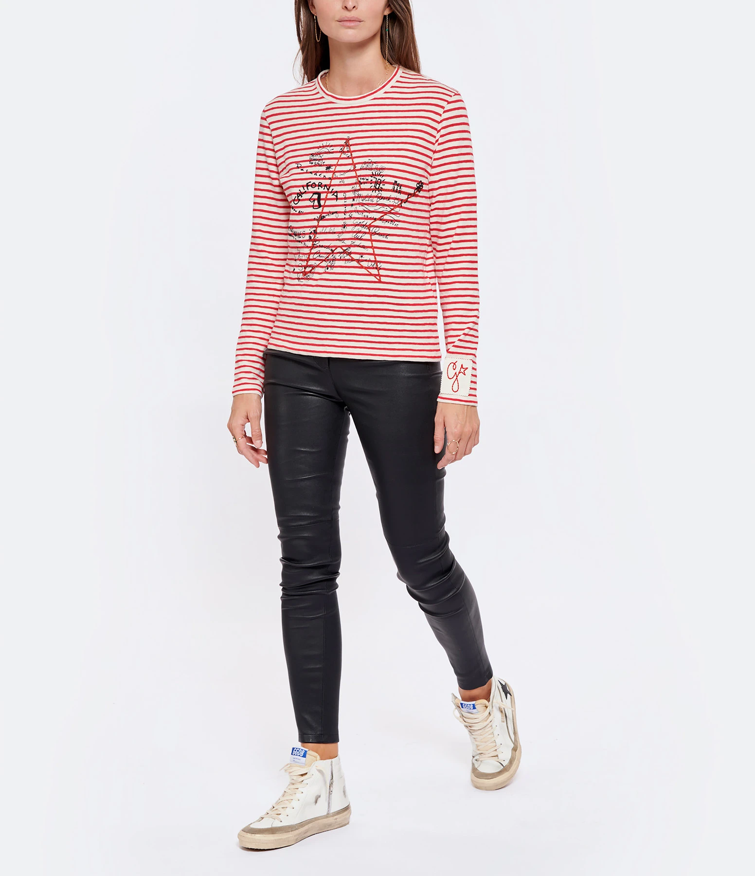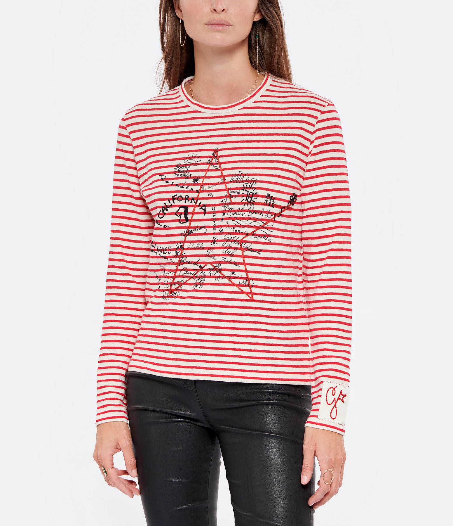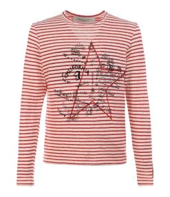 Tee-shirt en coton à rayures rouges et blanches. Broderie à l’avant. Manches longues. Col rond. Coupe droite. Base droite.