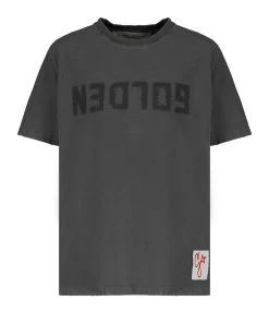 Tee-shirt en coton gris. Col rond. Manches courtes. Inscription gris foncé « GOLDEN » à l’envers sur l’avant du tee-shirt, avec effet troué. Pièce amovible blanche avec lettre G rouge brodée. Double étoile dorée dans le dos. Coupe droite. Base droite. Effet usé volontairement.