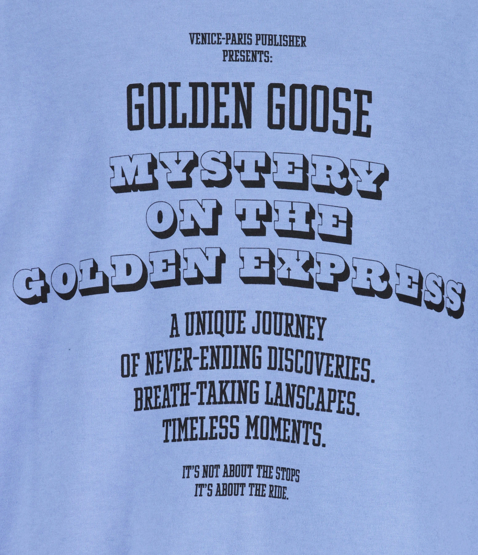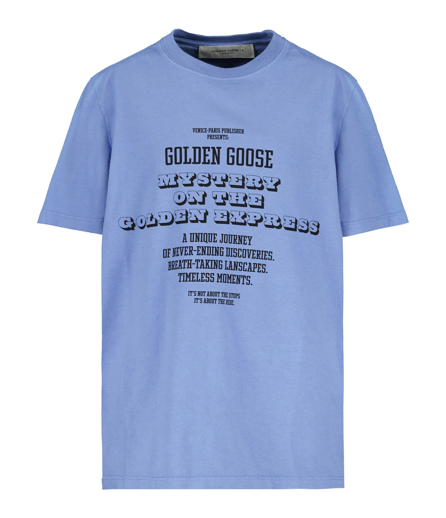 Tee-shirt en coton bleu pour homme avec inscription imprimé noir. Col rond côtelé. Manches courtes. Coupe droite. Base droite.