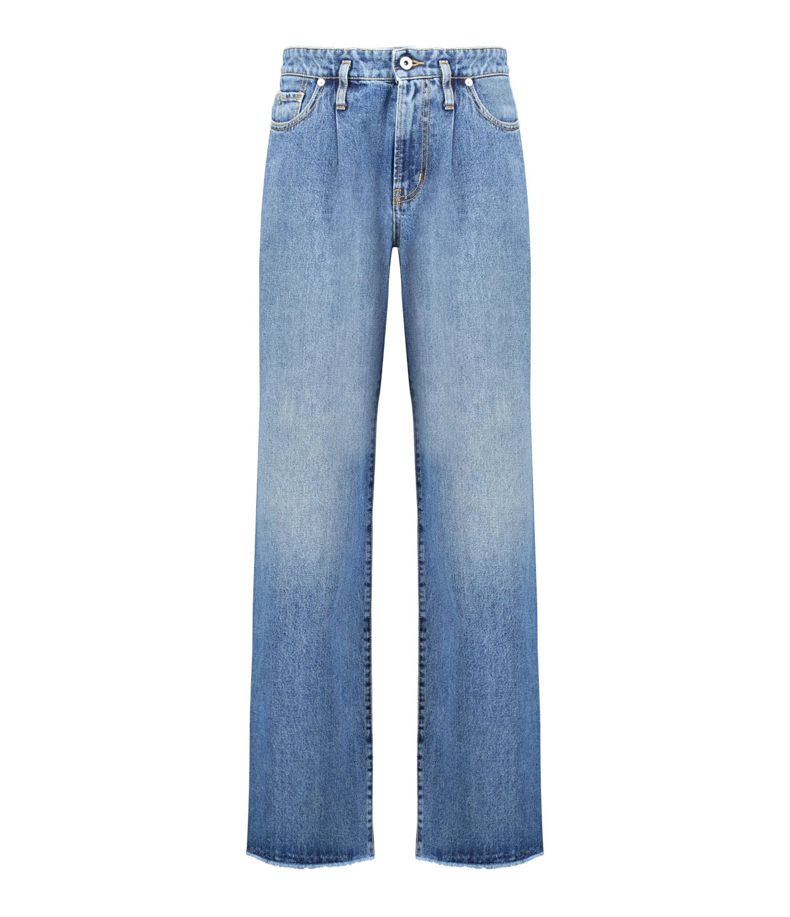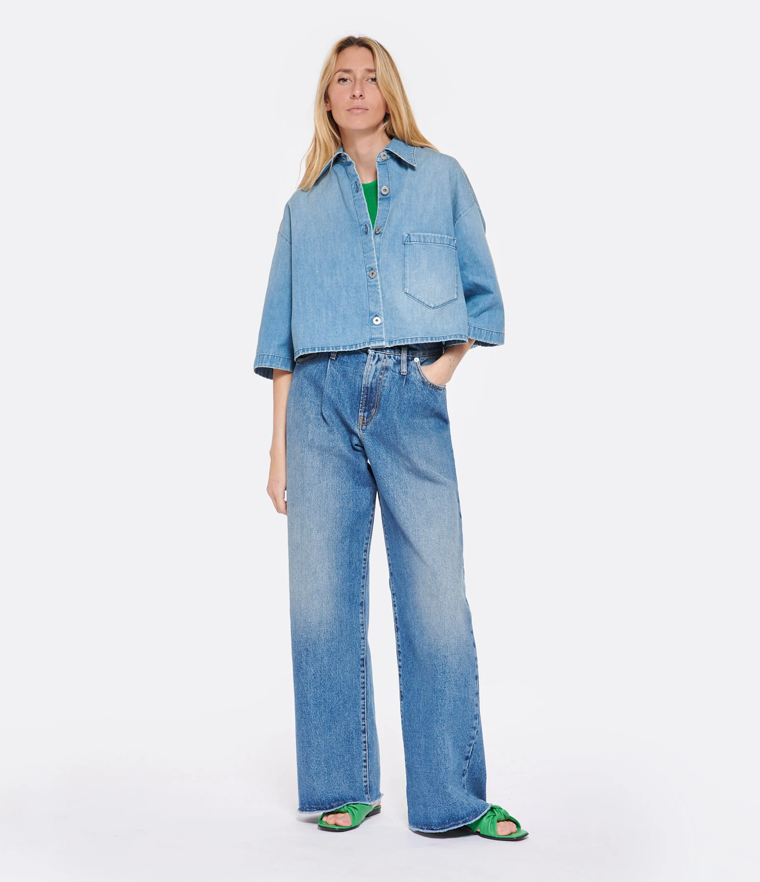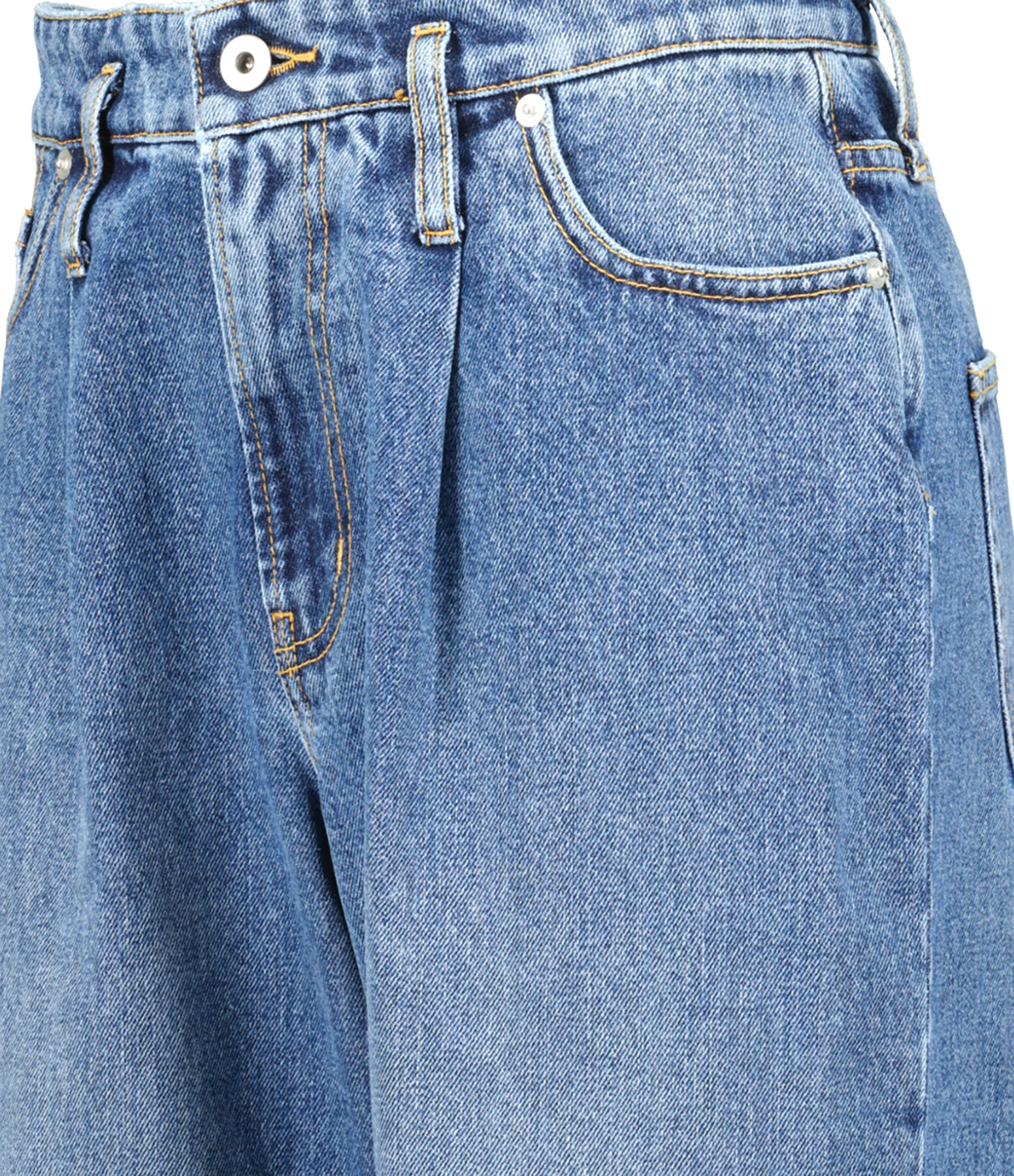Jean en coton denim bleu délavé. Taille haute. Cinq poches. Fermeture par zip et bouton. Effets usés par endroits. Coupe large. Bas de jambe effiloché.