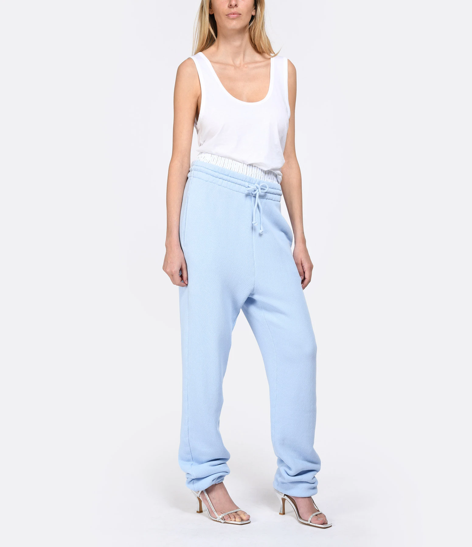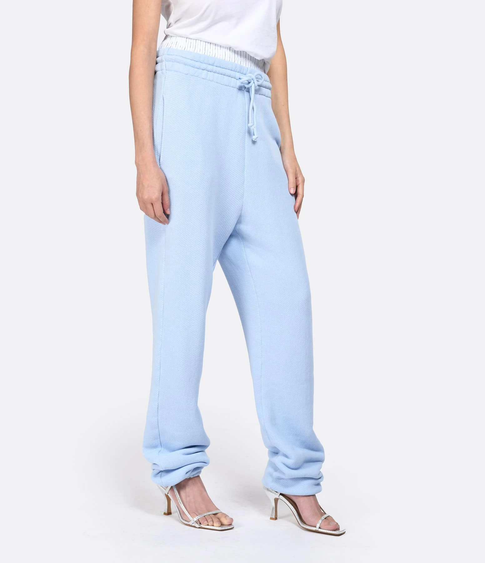 Pantalon de jogging en coton bleu. Effet caleçon blanc à rayures au niveau de la taille. Taille élastiquée avec liens de serrage. Chevilles resserrées et élastiquées. Deux poches italiennes. Non doublé.