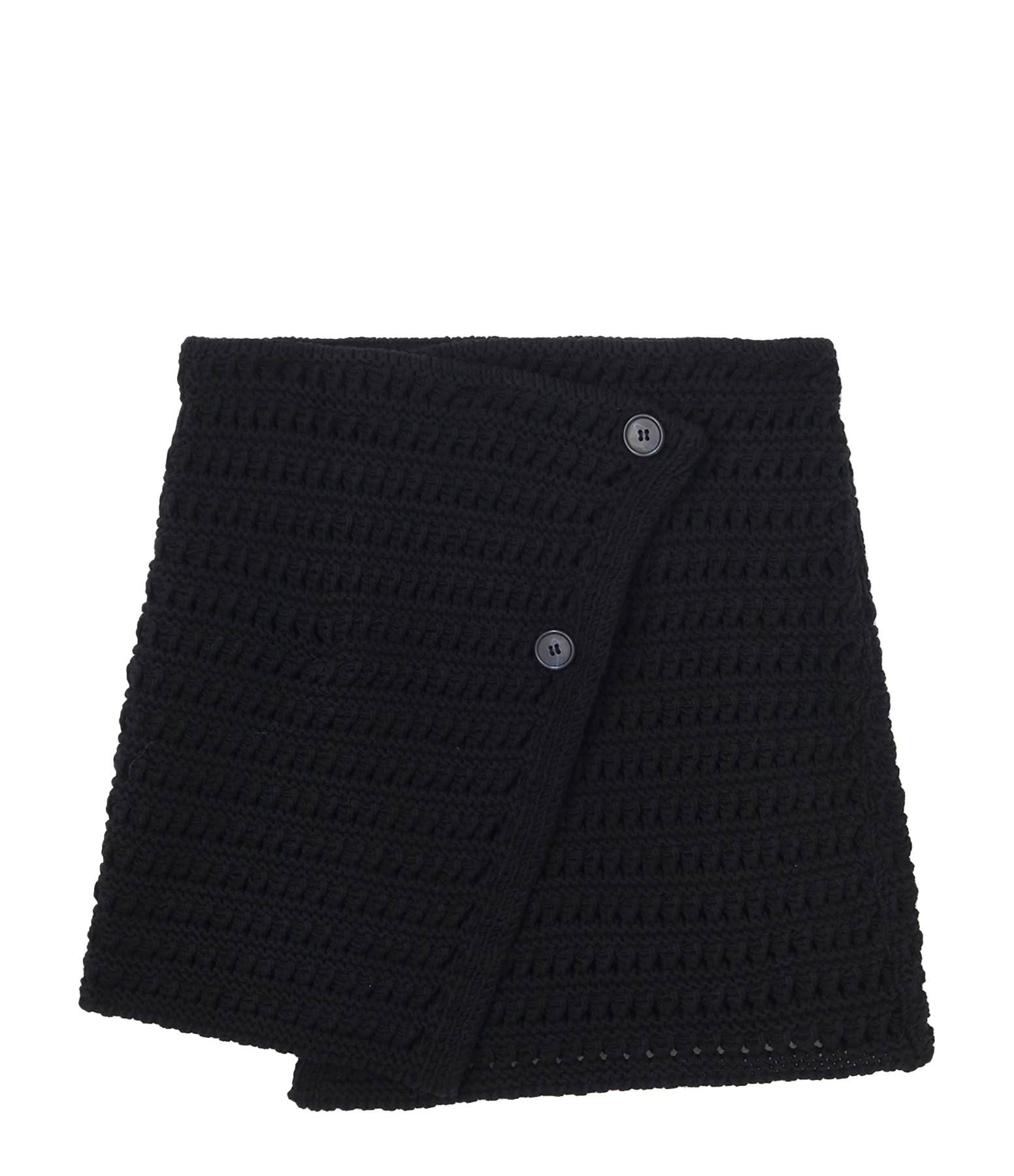 Jupe courte en coton effet crochet noir. Fermeture portefeuille par boutons noirs sur le devant. Coupe droite. Base droite.