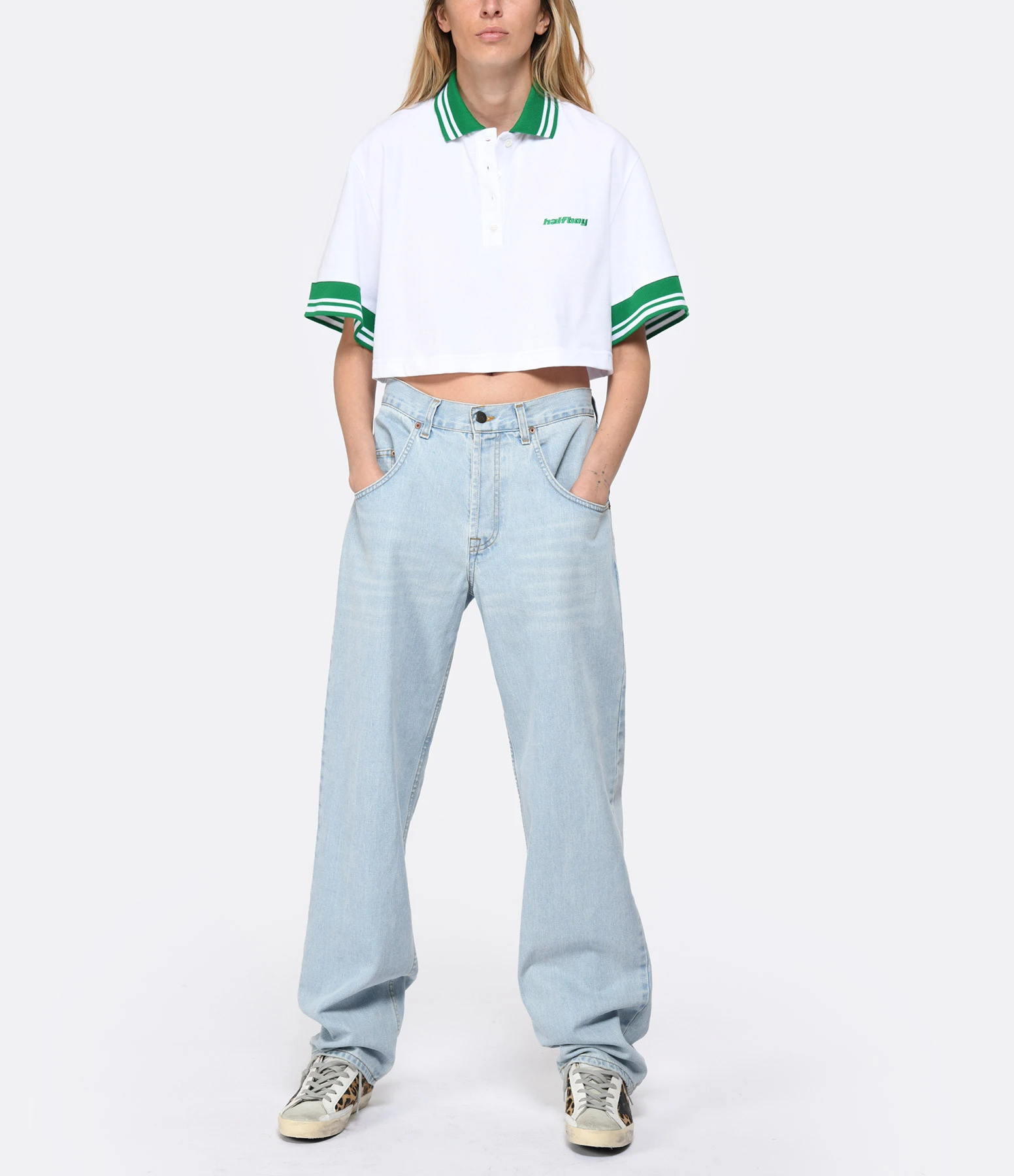 Polo court en coton blanc et vert. Inscription « halfboy » brodée en vert sur le devant côté poitrine. Col polo vert avec bandes blanches. Fermeture par boutons blancs sur le devant. Manches courtes. Coupe droite. Base droite.