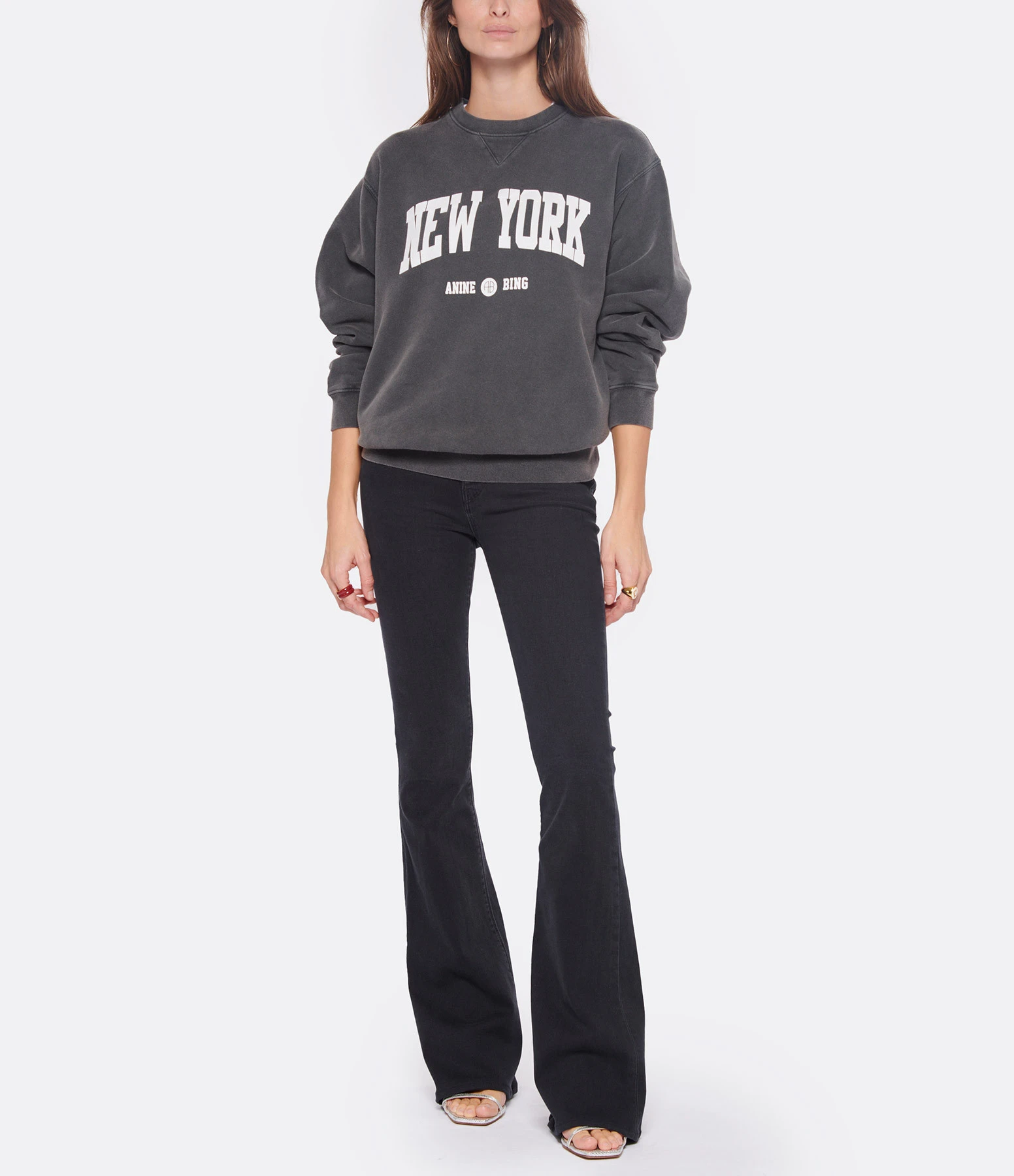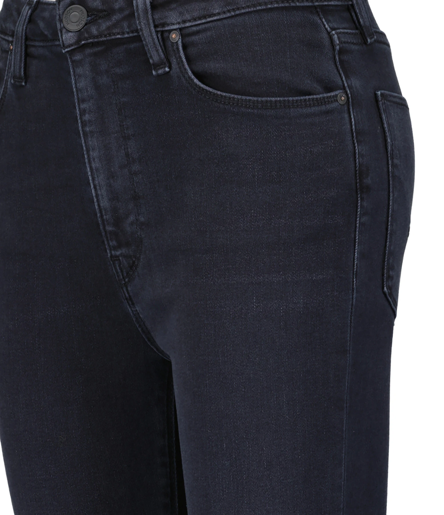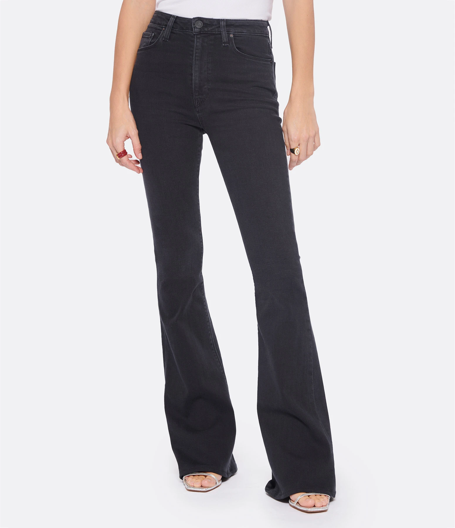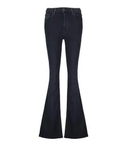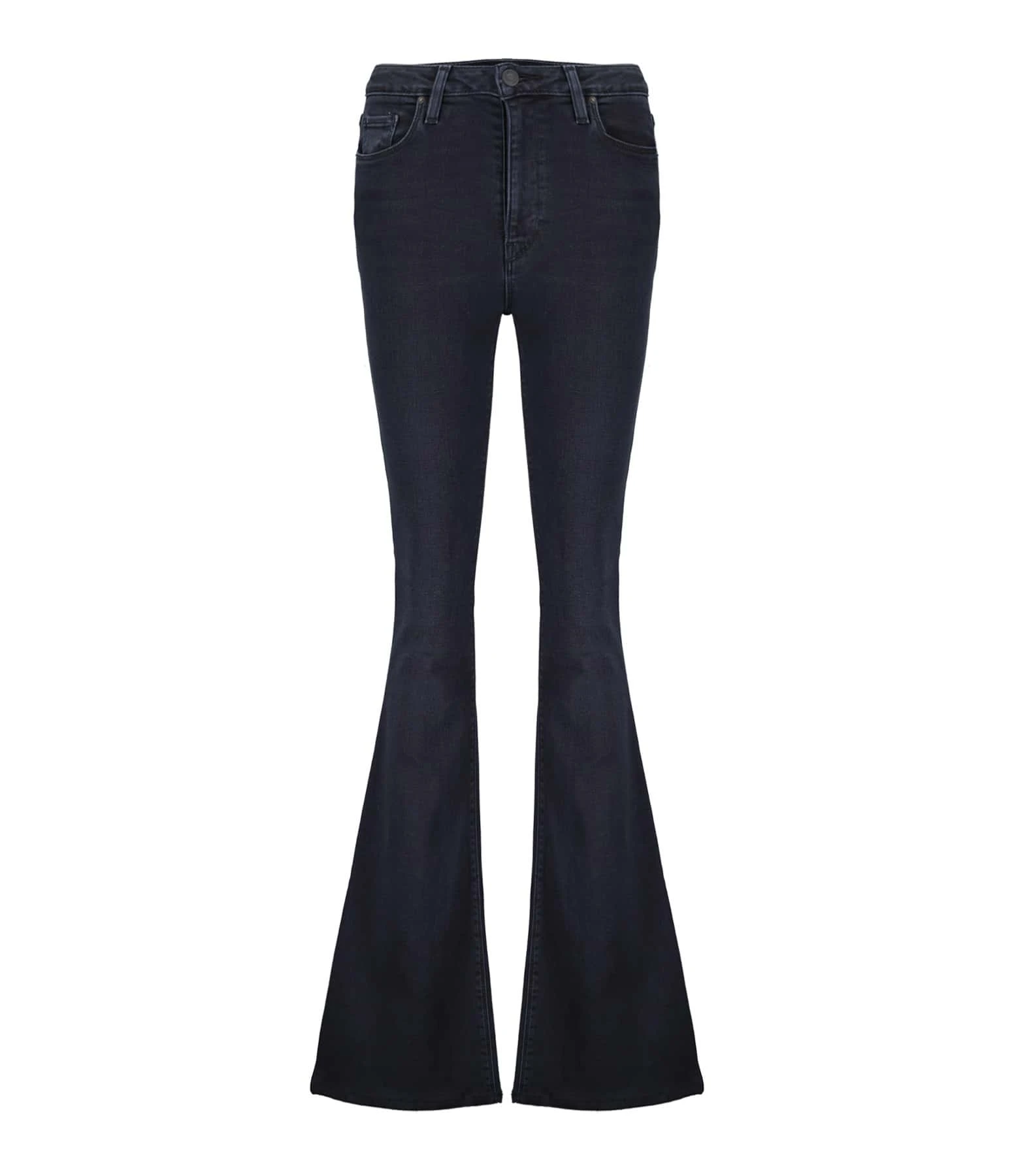 Pantalon en denim de coton stretch noir. Taille haute avec passants pour ceinture. Braguette zippée et bouton. Bouton métallique noir. Deux poches italiennes et une poche à gousset. Deux poches plaquées dans le dos. Coupe flare. Base droite.