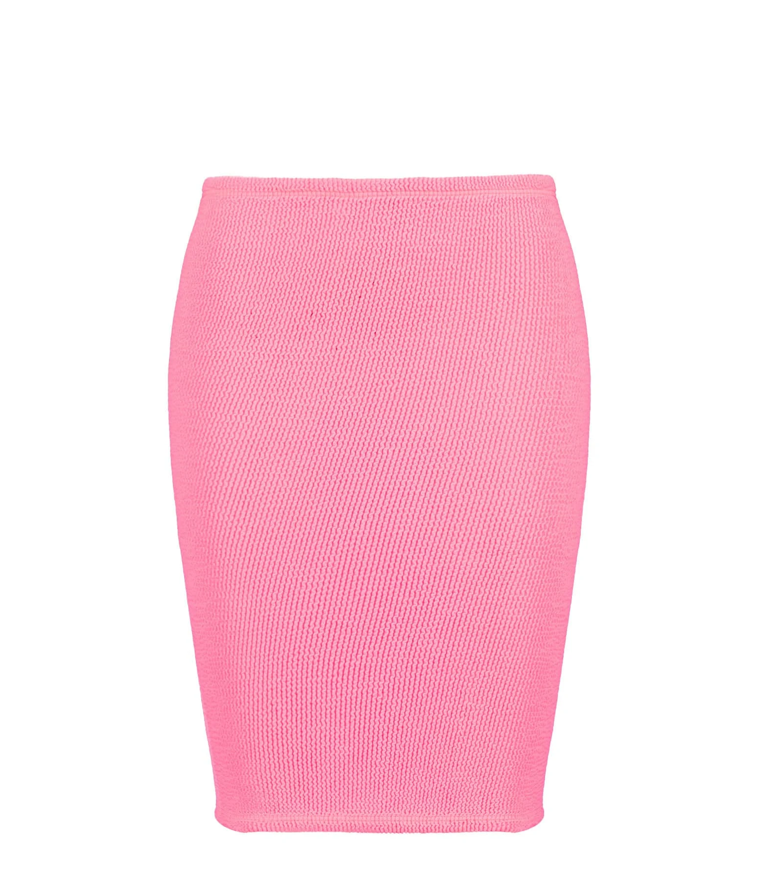 Mini-jupe en crépon extensible rose. Sans couture. Coupe près du corps. Base droite. Non doublée.