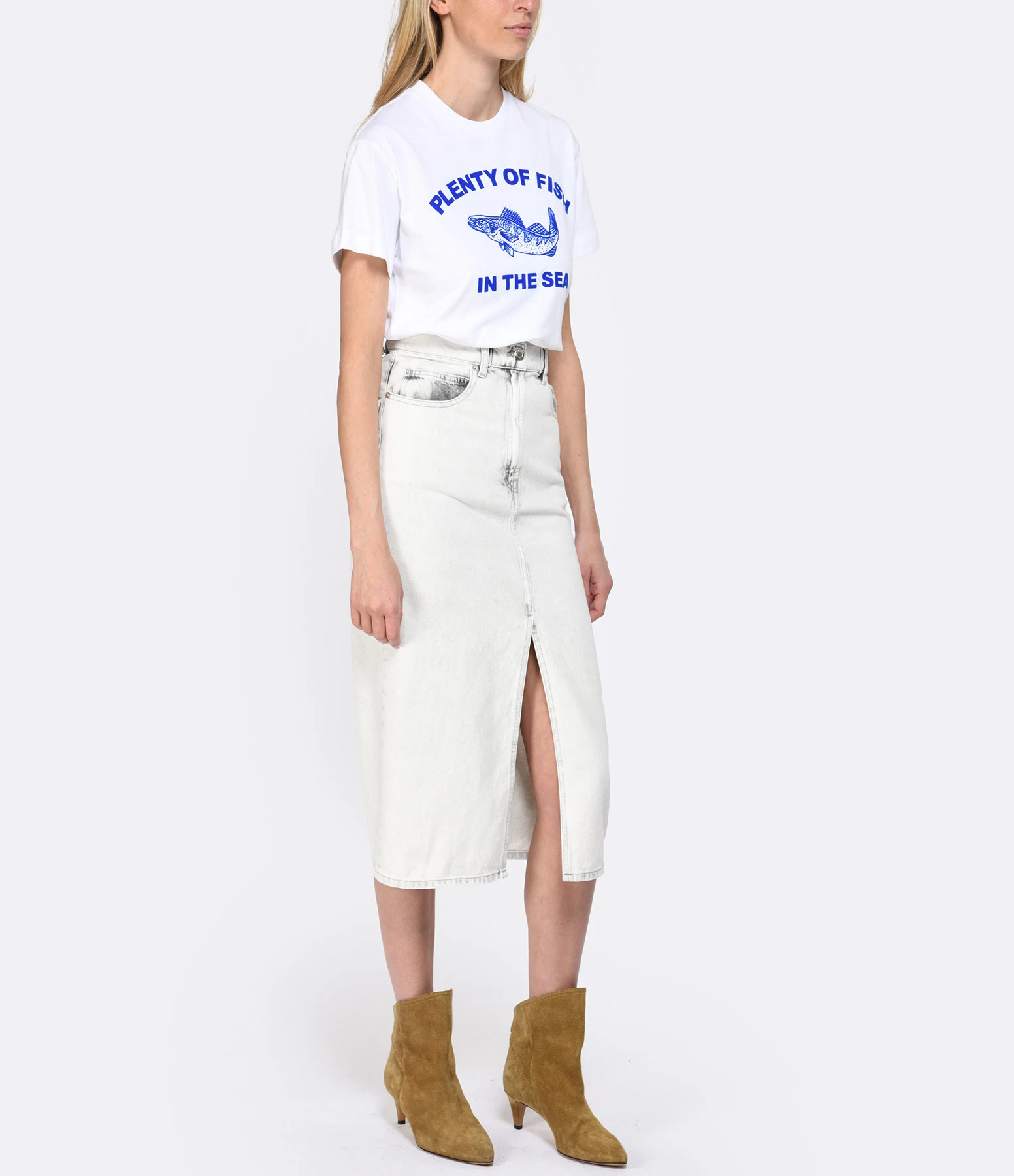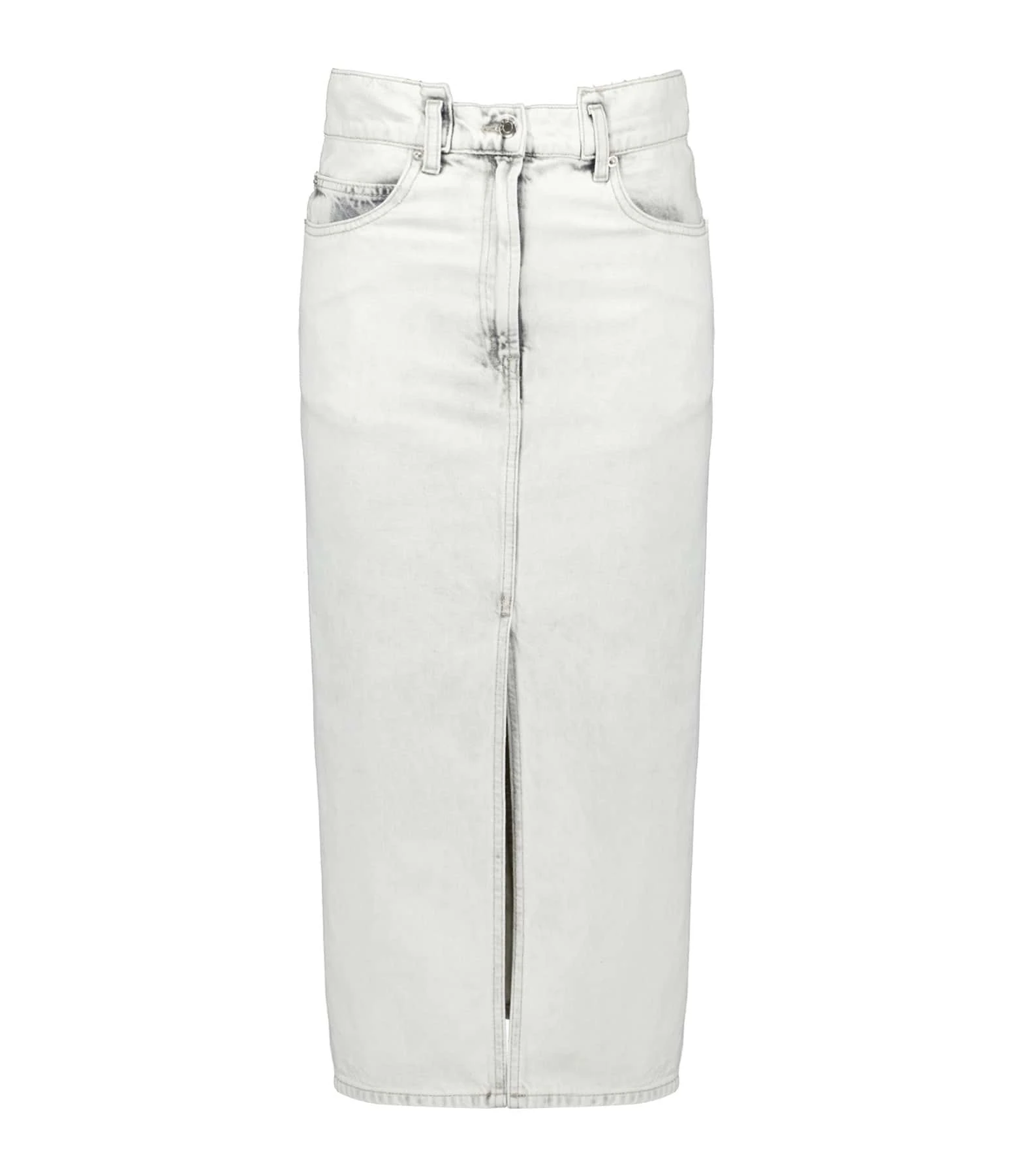 Jupe mi-longue en denim de coton gris clair. Fente centrale sur le devant au bas. Passants pour ceinture. Fermeture par bouton métallique sur le devant. Coupe droite. Base droite.