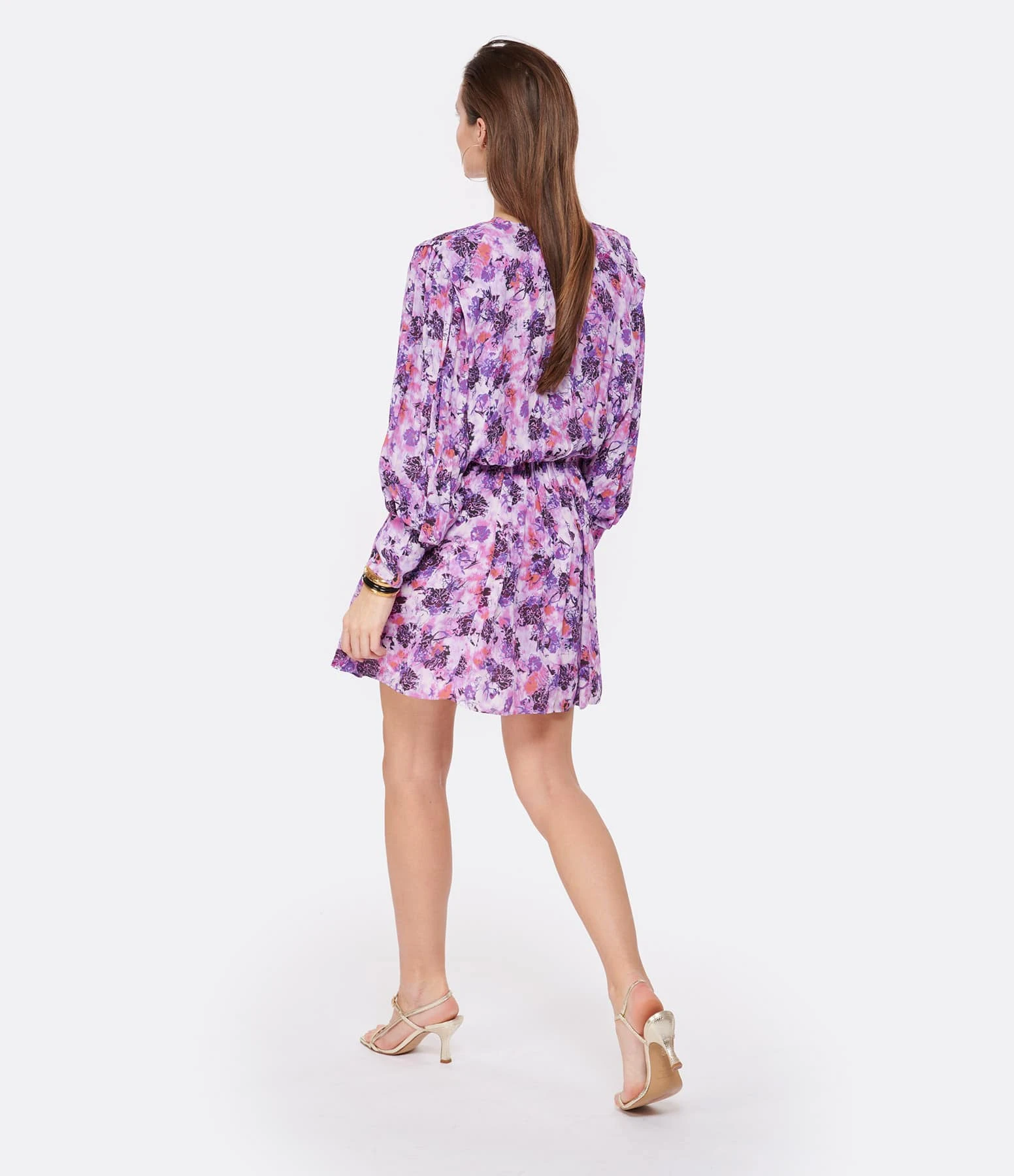 Robe courte à imprimé violet. Manches longues et poignets boutonnés. Epaulettes. Décolleté en V. Volants au niveau de la jupe. Fermeture zippée invisible latérale. Coupe droite. Base asymétrique. Doublée.