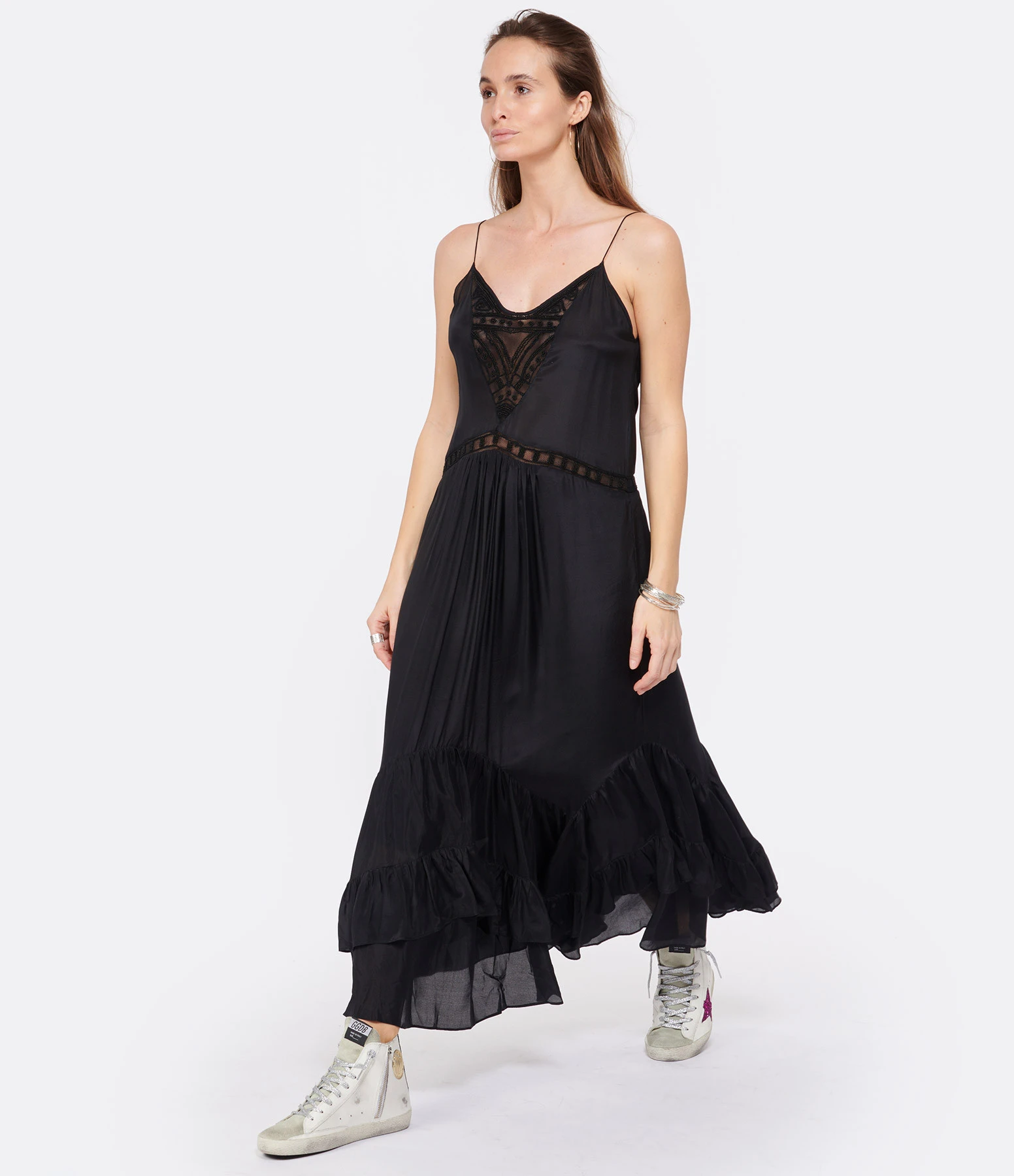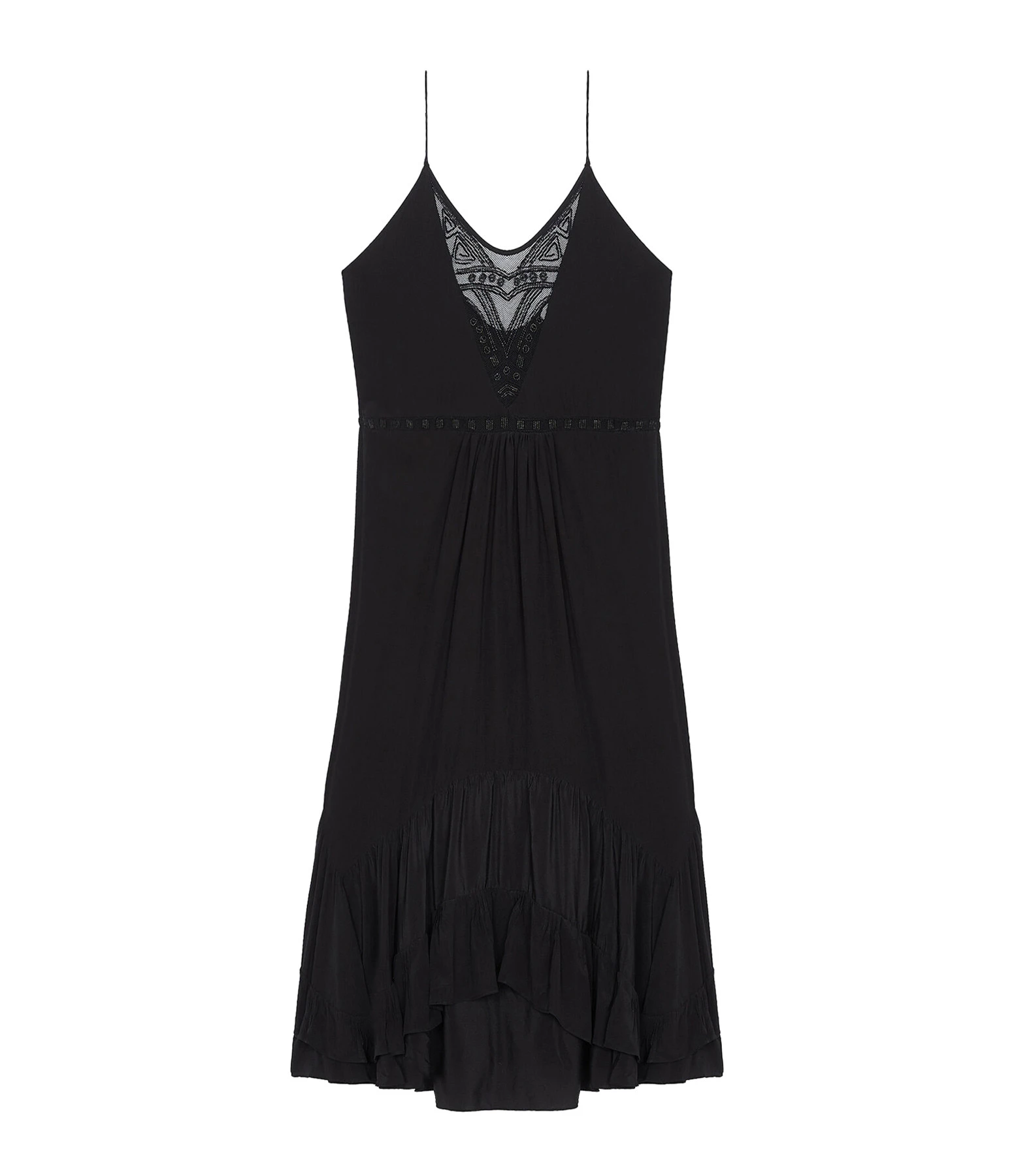 Robe mi-longue en soie noire à fines bretelles. Détails de perles brodées sur le devant et jeu de transparence au niveau du buste. Volants sur le bas. Coupe droite. Base asymétrique. Doublée.