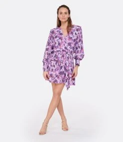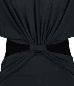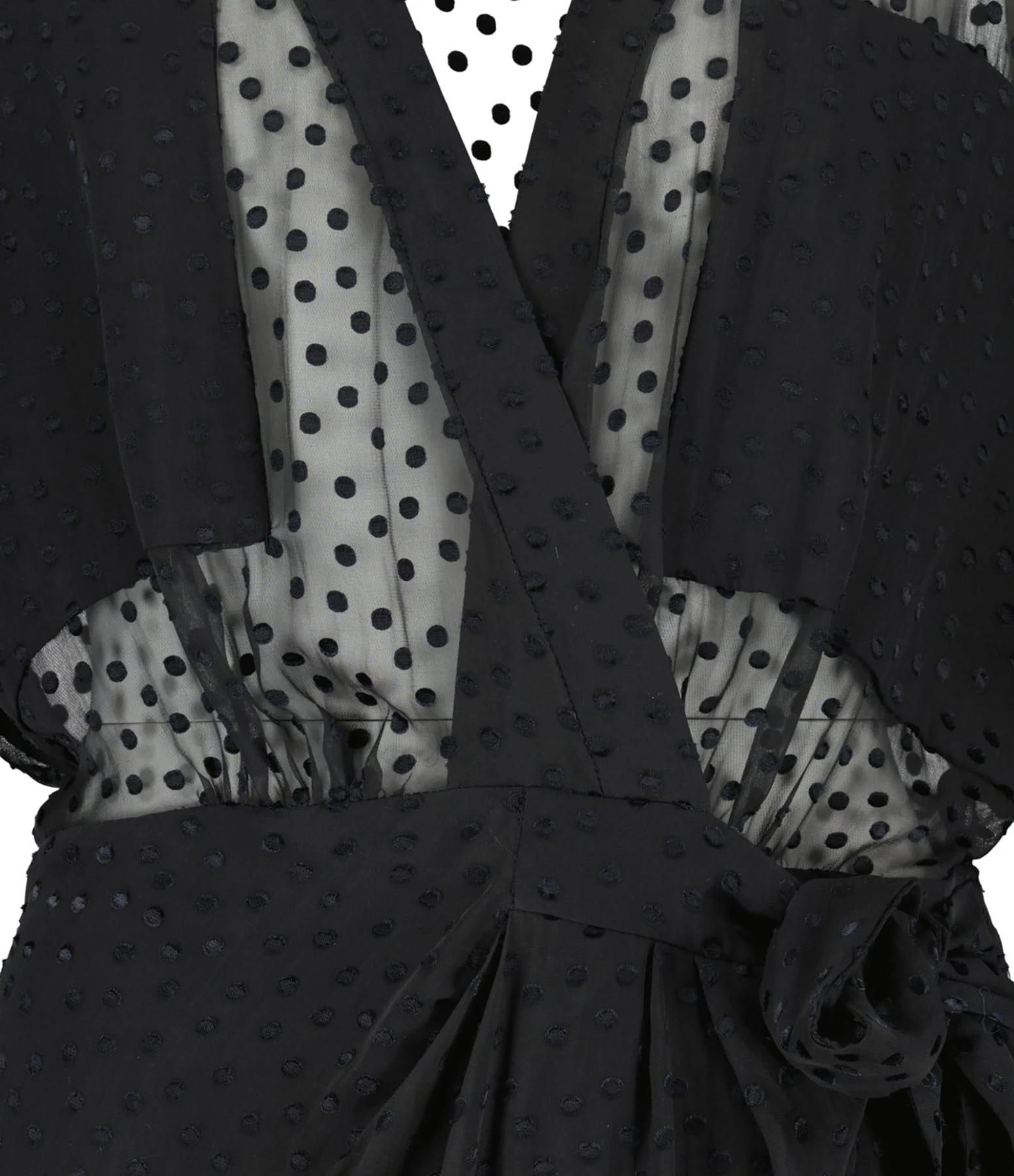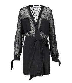 Robe courte en soie noire. Haut à pois transparent. Décolleté plongeant en V. Manches longues. Poignets resserrés par nœuds. Jupe portefeuille fermée par nœud de serrage aux hanches. Jupe doublée. Coupe ample. Base droite.