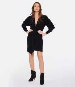 Robe courte en soie à imprimé dans les tons verts. Encolure cache-cœur. Jupe drapée. Sans manches. Fermeture zippée invisible latérale. Coupe droite. Base asymétrique.