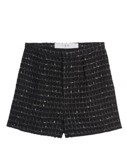 Short taille haute en tweed à carreaux noir et blanc. Fermeture par zip et crochet. Deux poches passepoilées à l’avant et deux poches plaquées à l’arrière. Coupe évasée. Base droite. Doublure en coton et viscose.