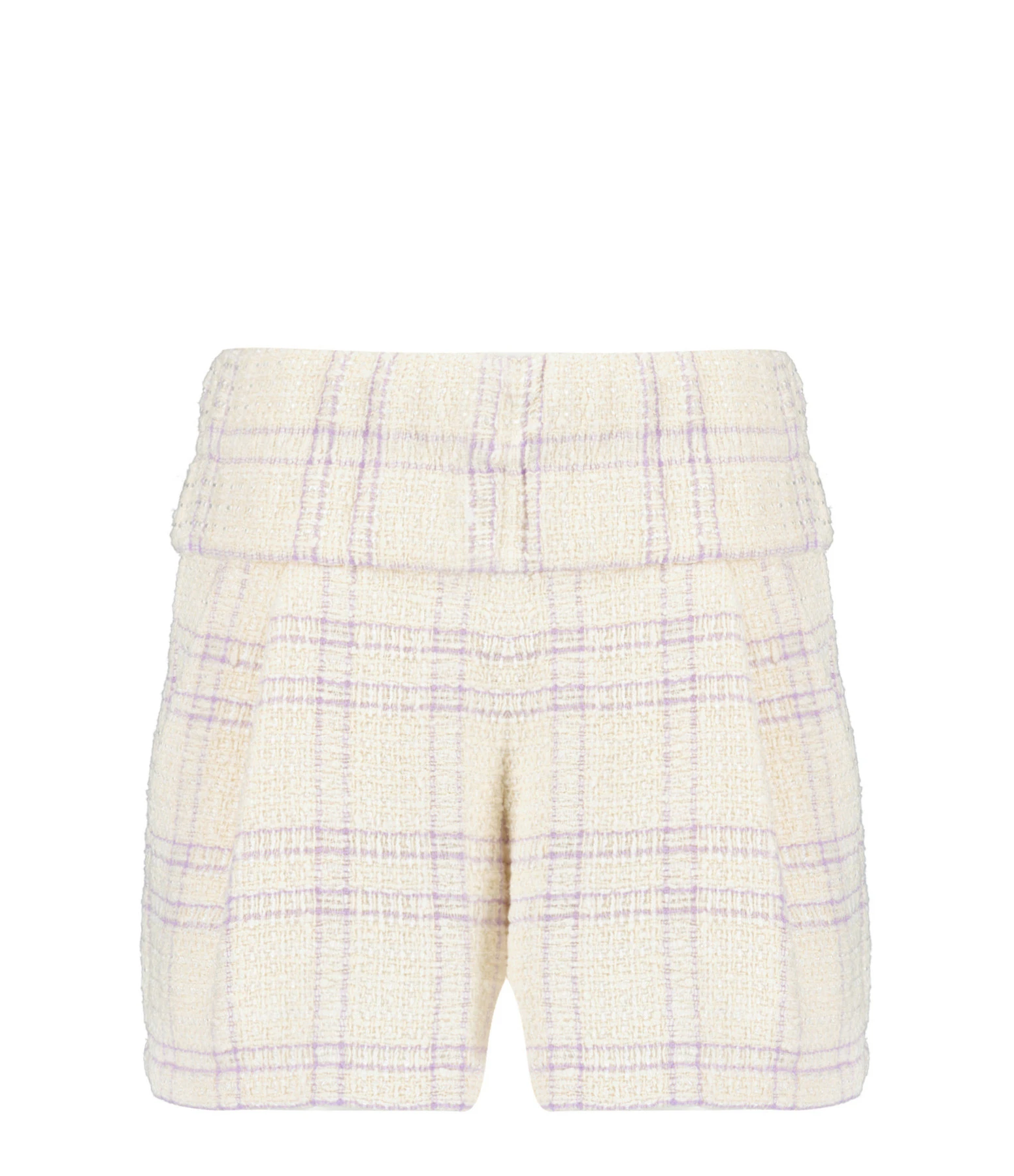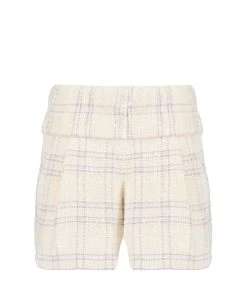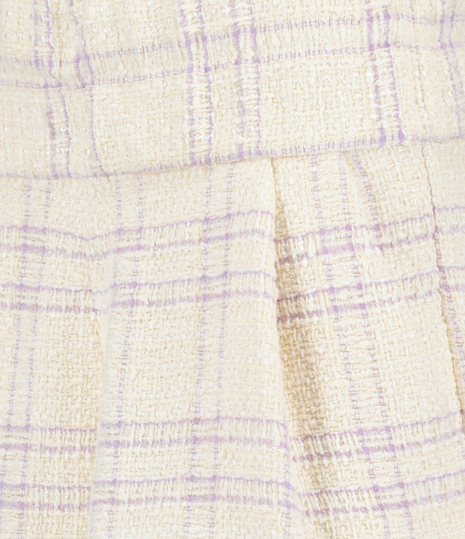 Short à pinces en tweed à carreaux écru et mauve. Taille haute élastiquée. . Deux poches italiennes sur le devant. Coupe évasée. Base droite. Doublé.