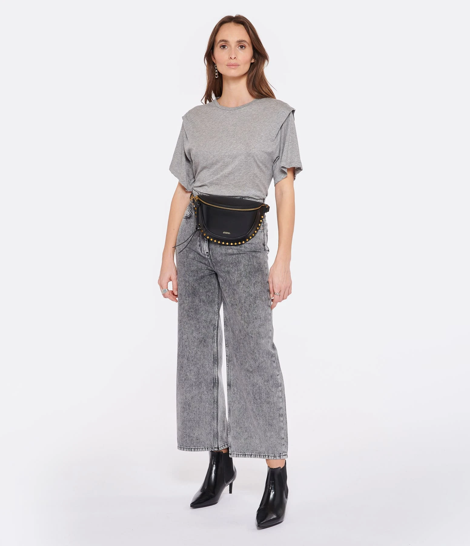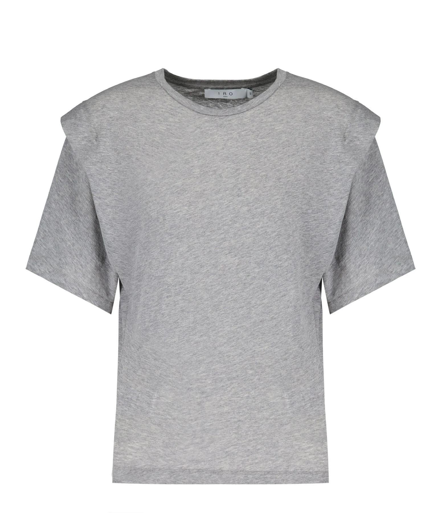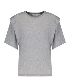 Top gris fluide à volant sur les épaules. Col rond. Manches courtes.