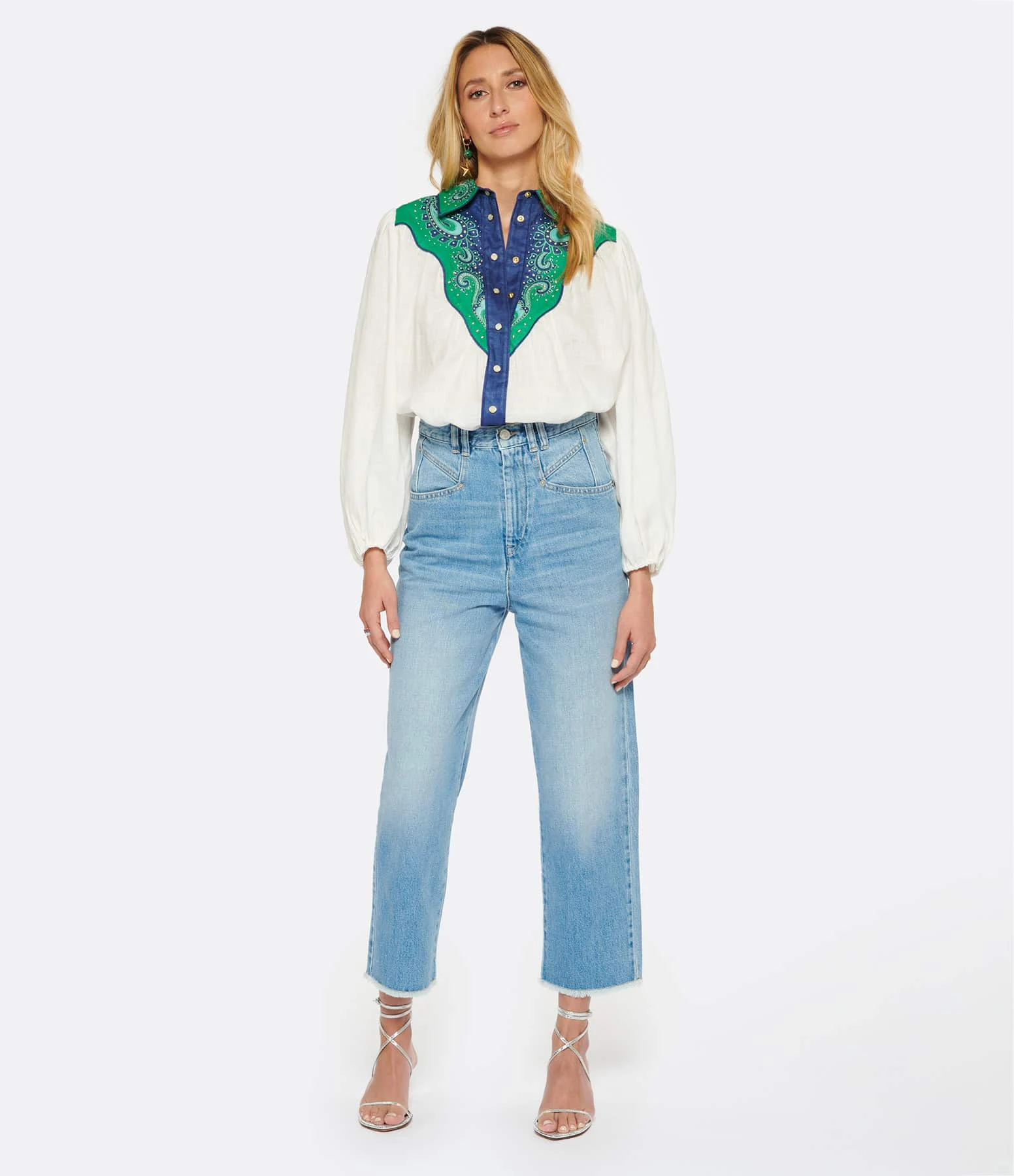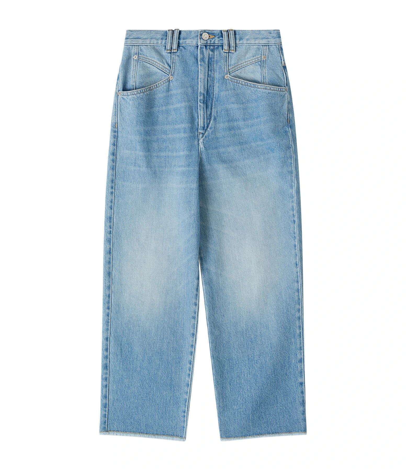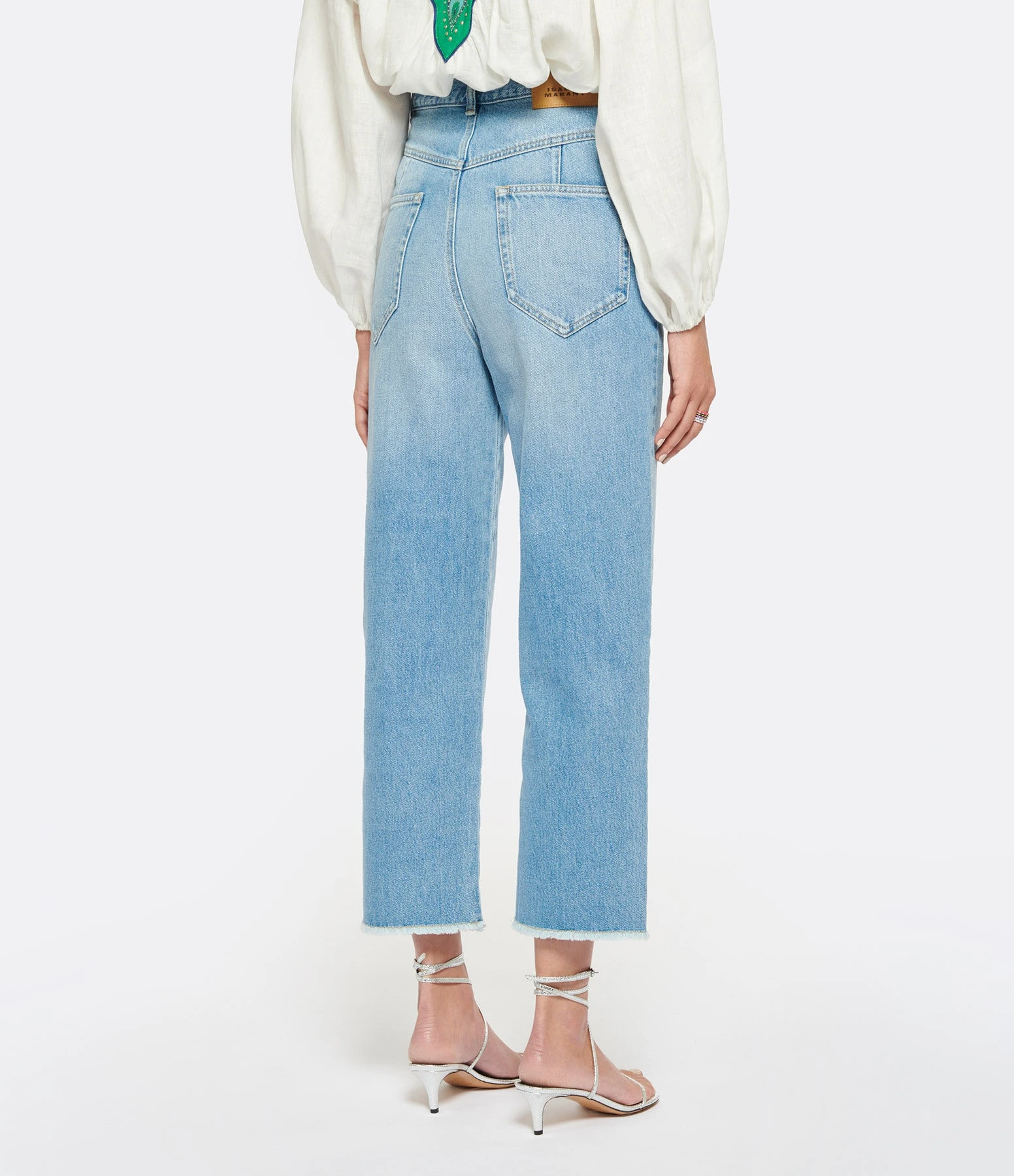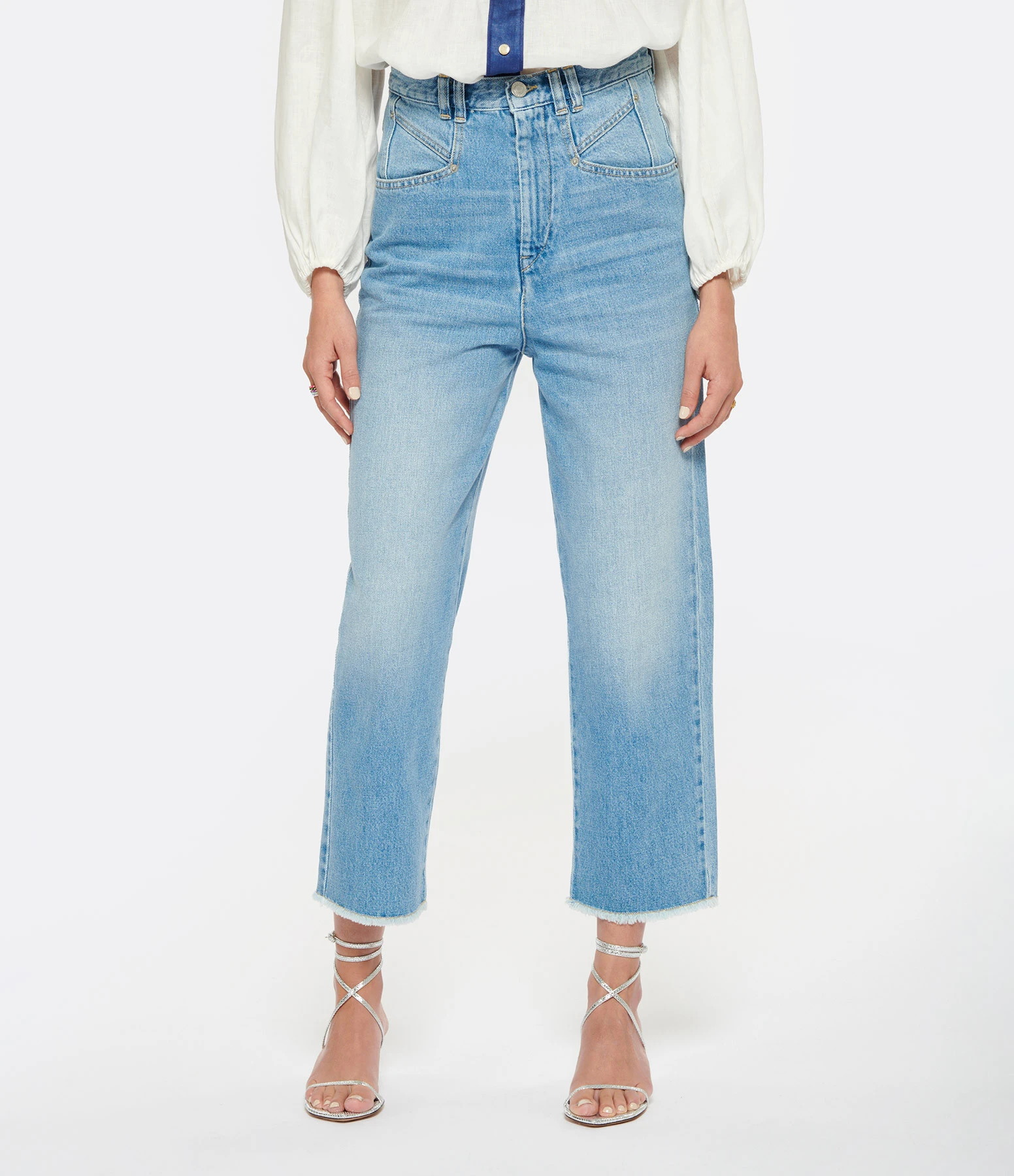 Pantalon en denim de coton bleu clair. Passants pour ceinture. Braguette zippée et bouton métallique argenté. Deux poches italiennes. Deux poches plaquées et jacron dans le dos. Coupe droite. Longueur raccourcie. Base coupée à cru.
