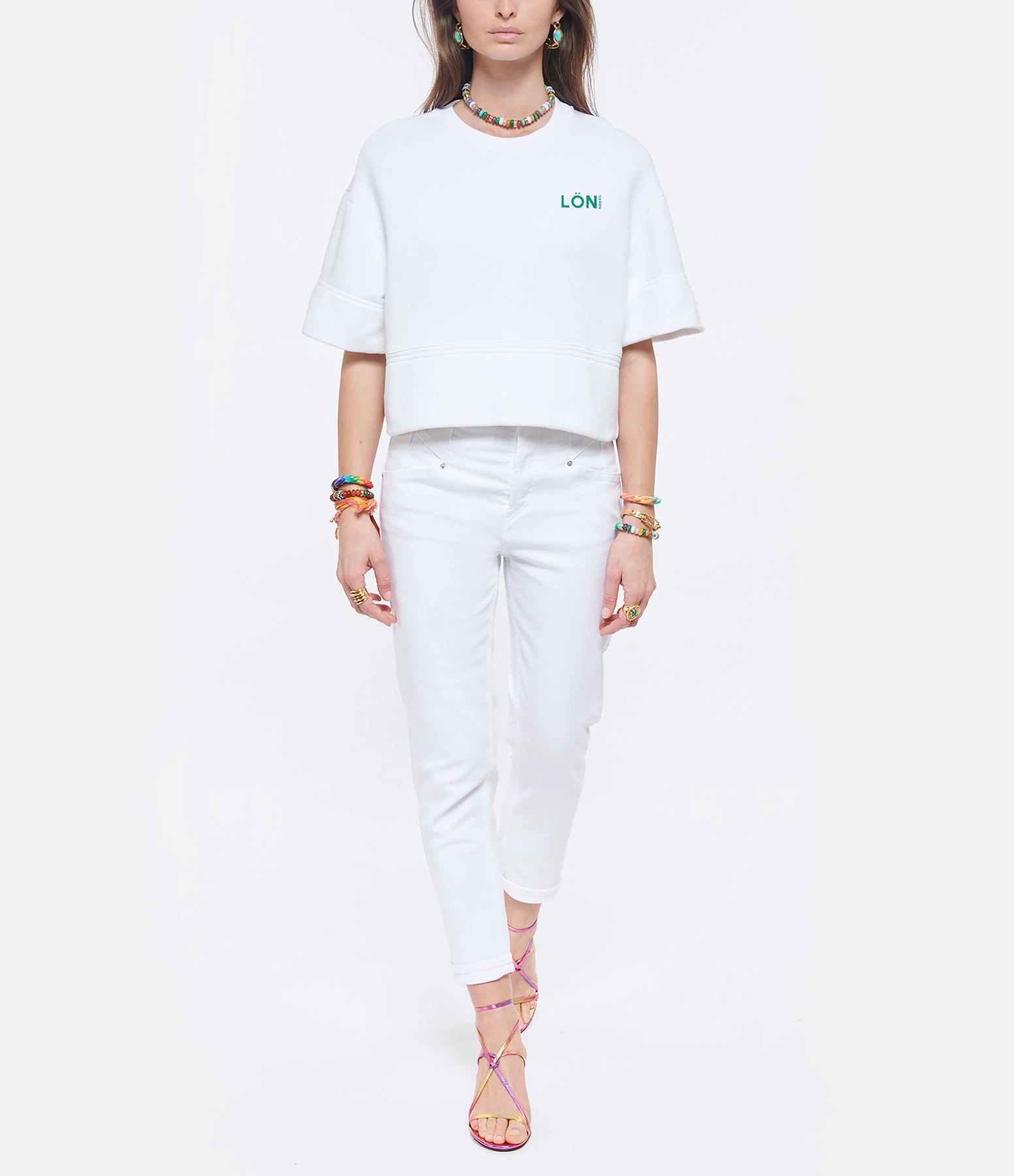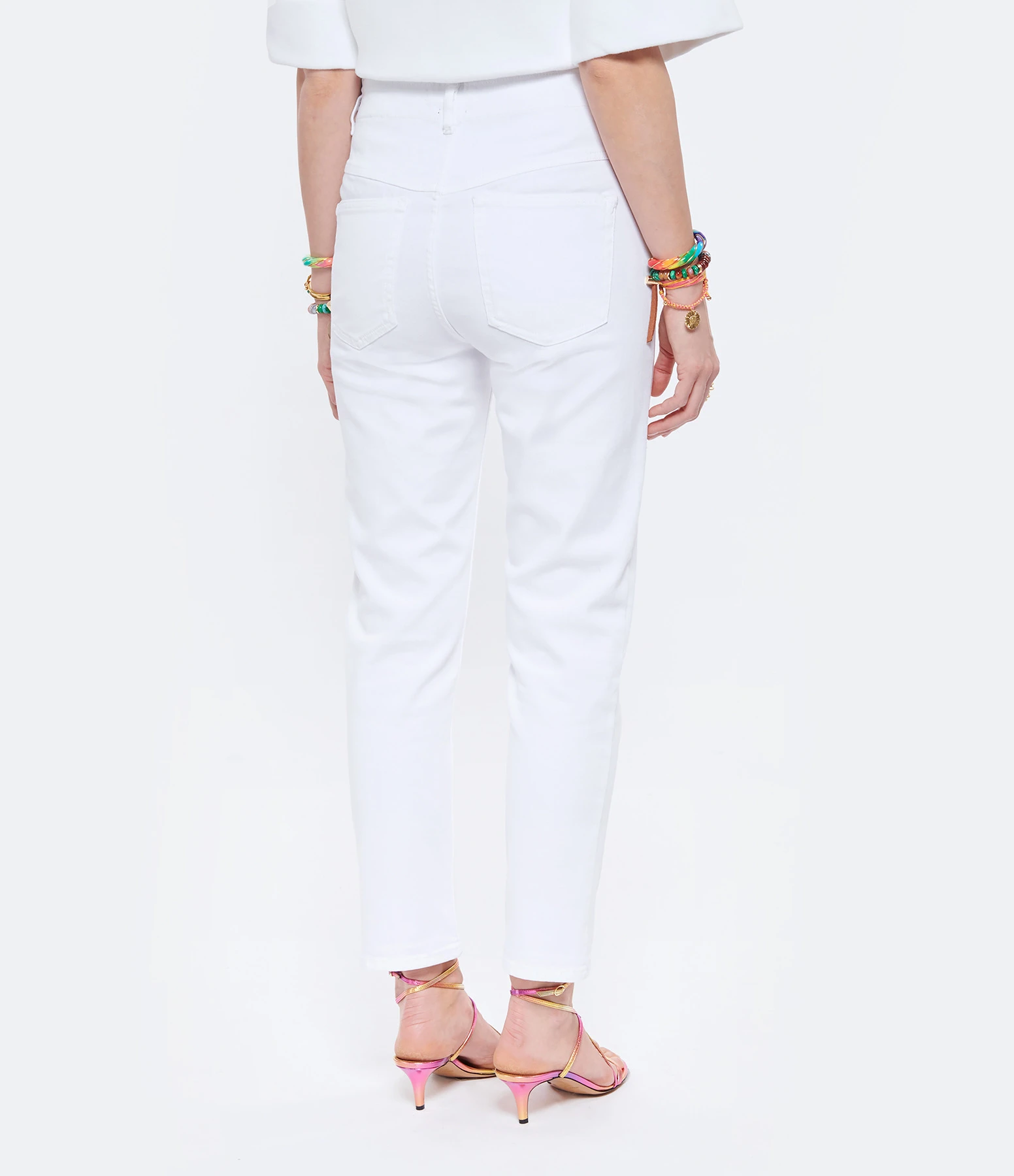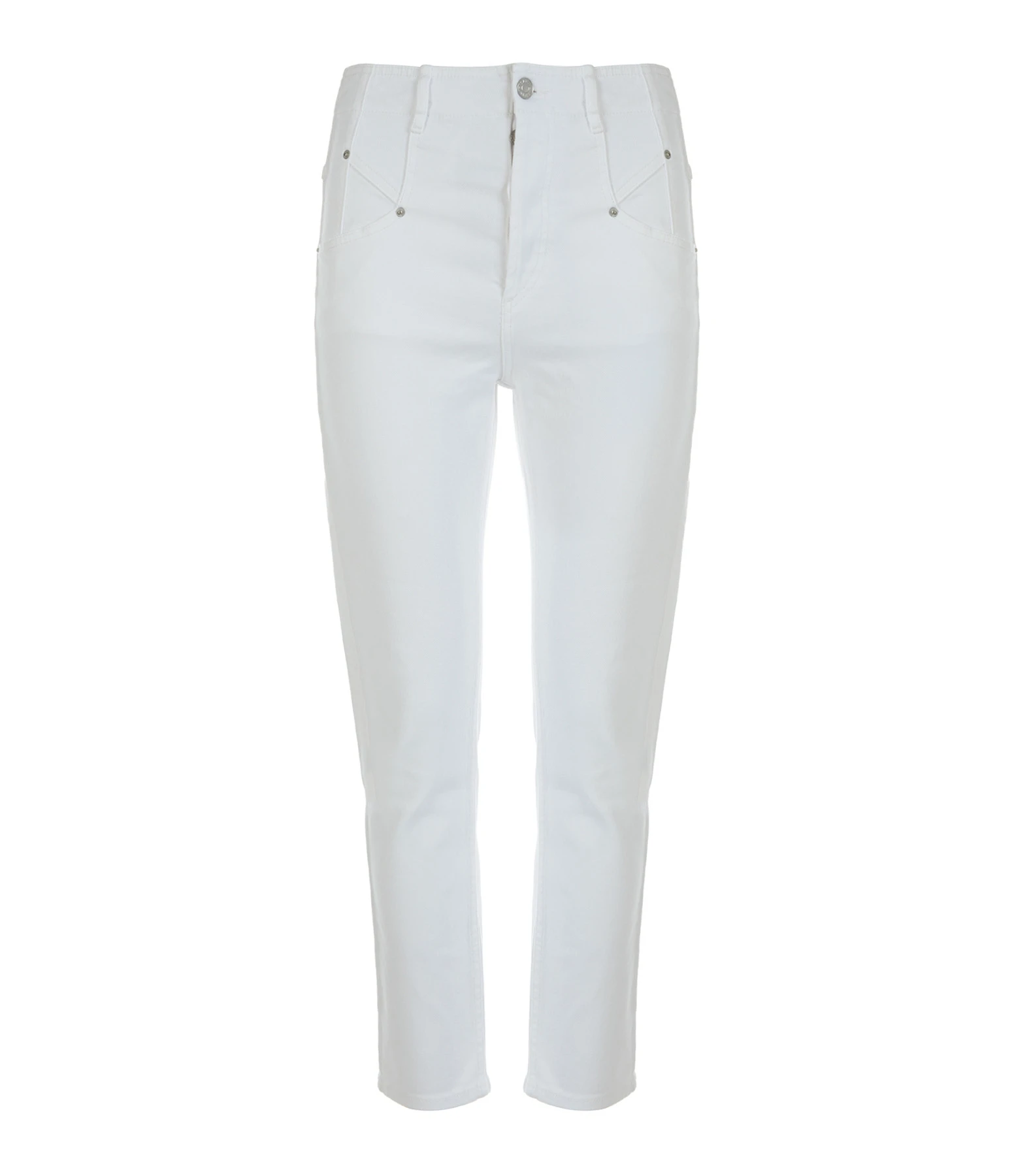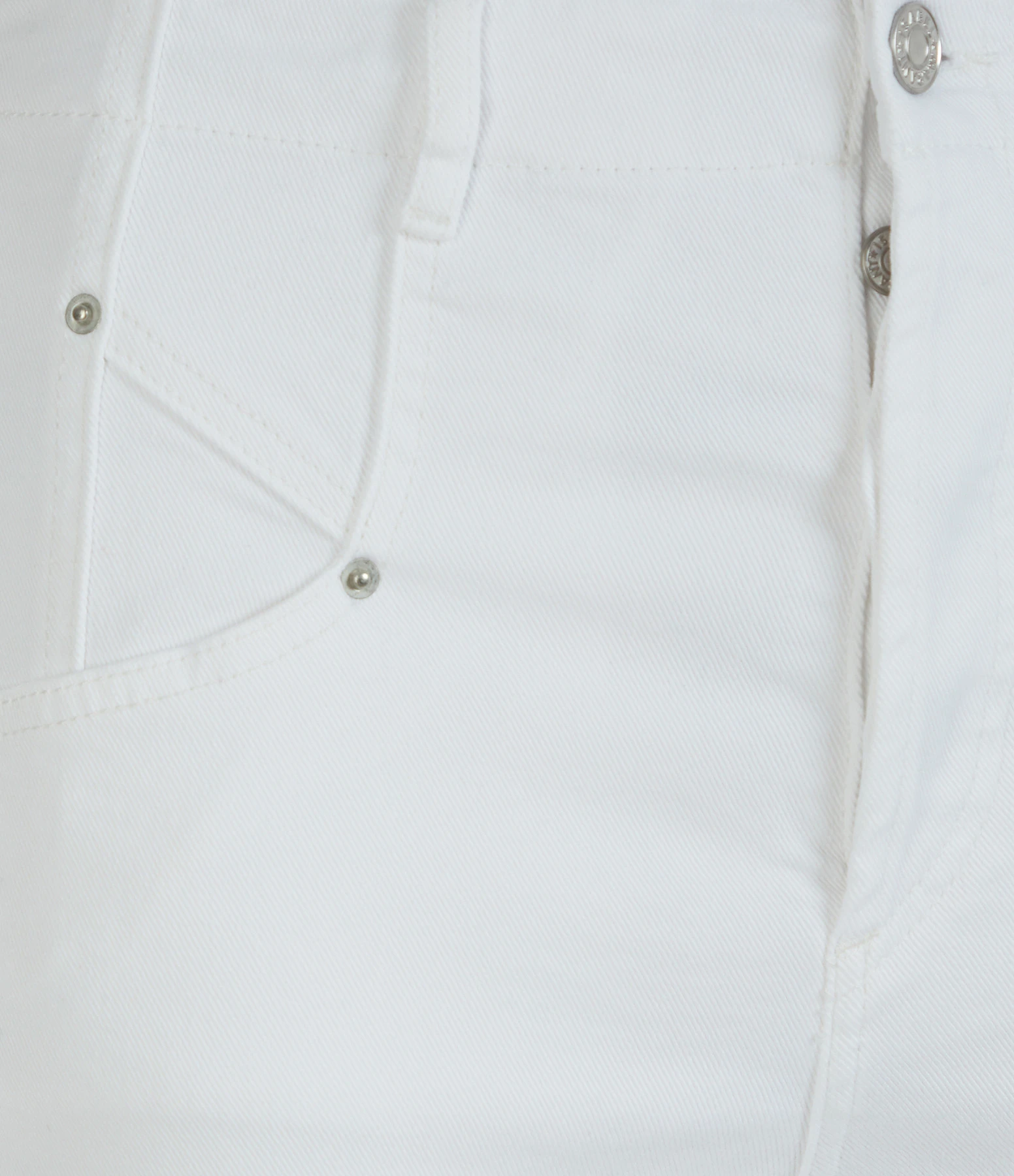 Jean droit blanc. Taille haute. Fermeture boutonnée. Quatre poches. Passants pour ceinture.