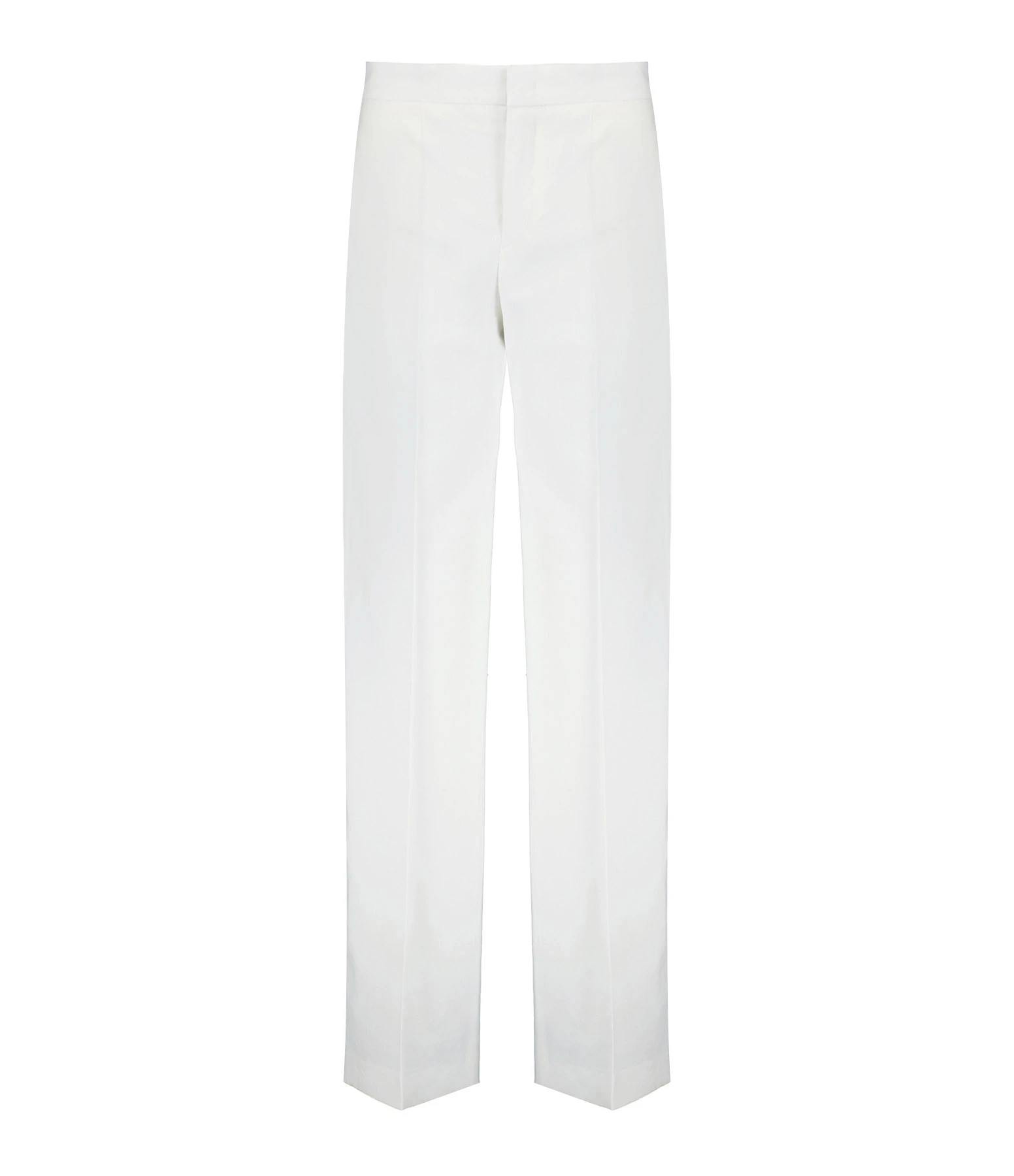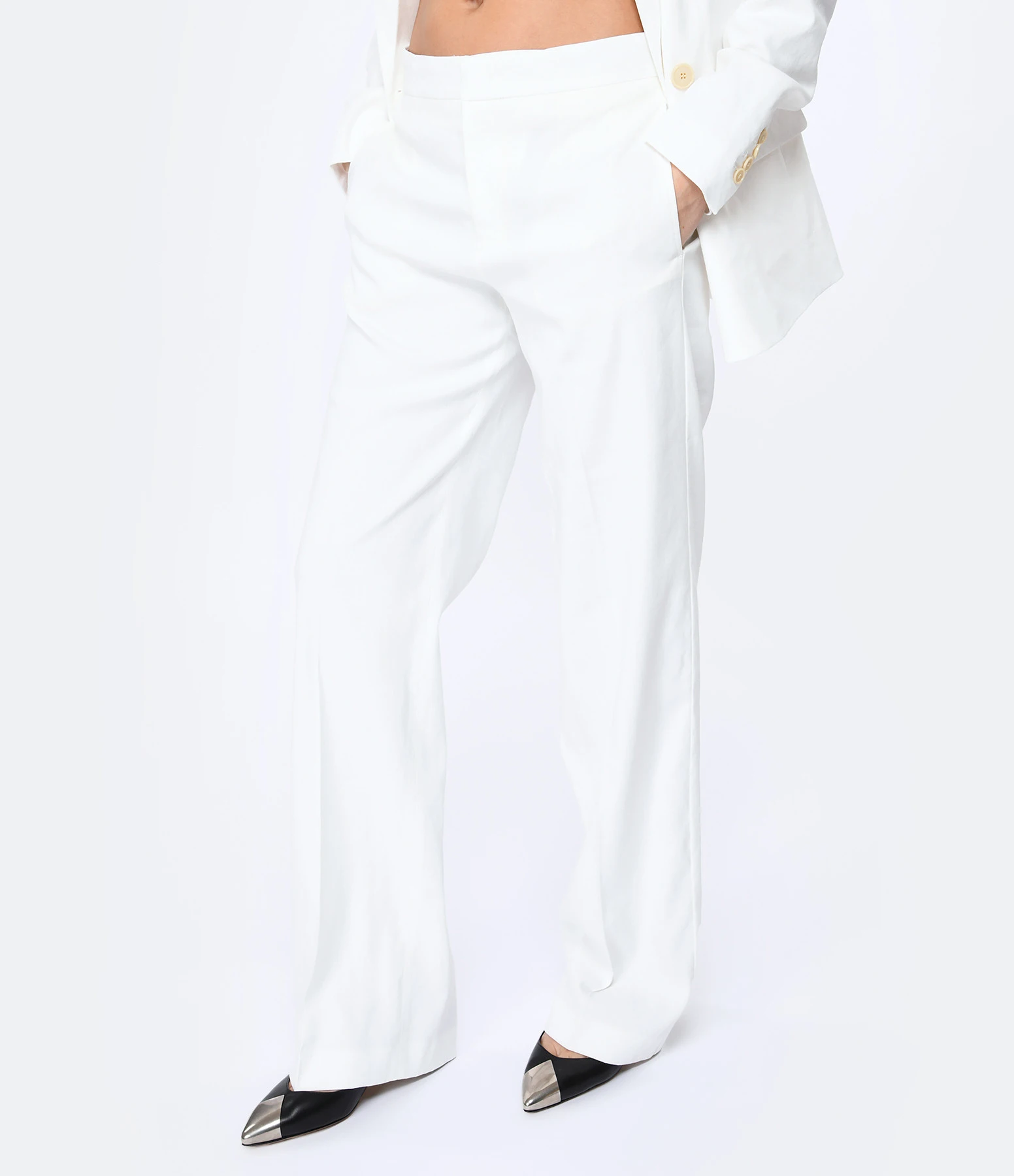 Pantalon droit en chanvre blanc. Deux poches prises dans les coutures latérales sur le devant. Deux poches passepoilées boutonnées dans le dos. Boutons écrus. Coupe droite. Base droite.