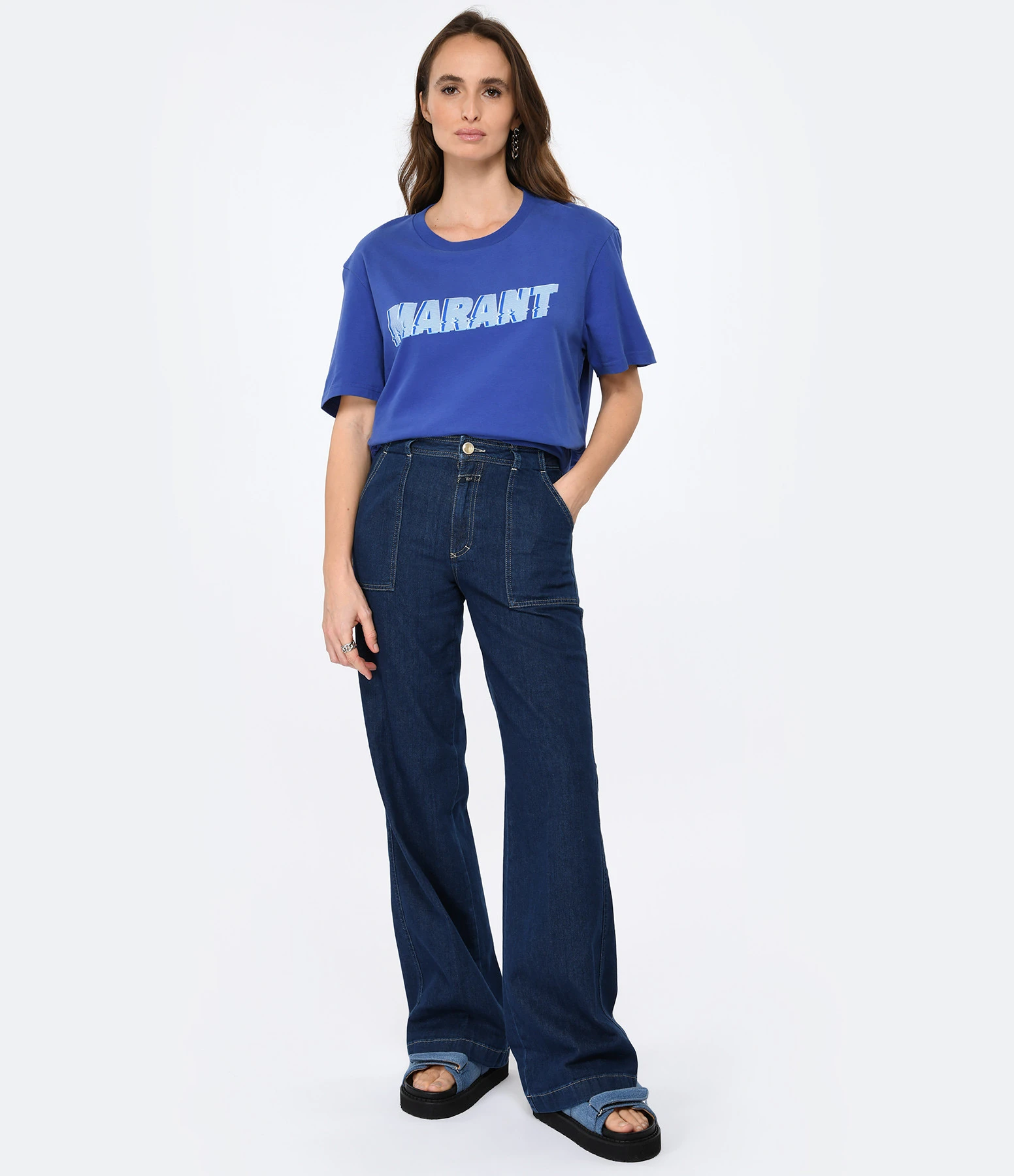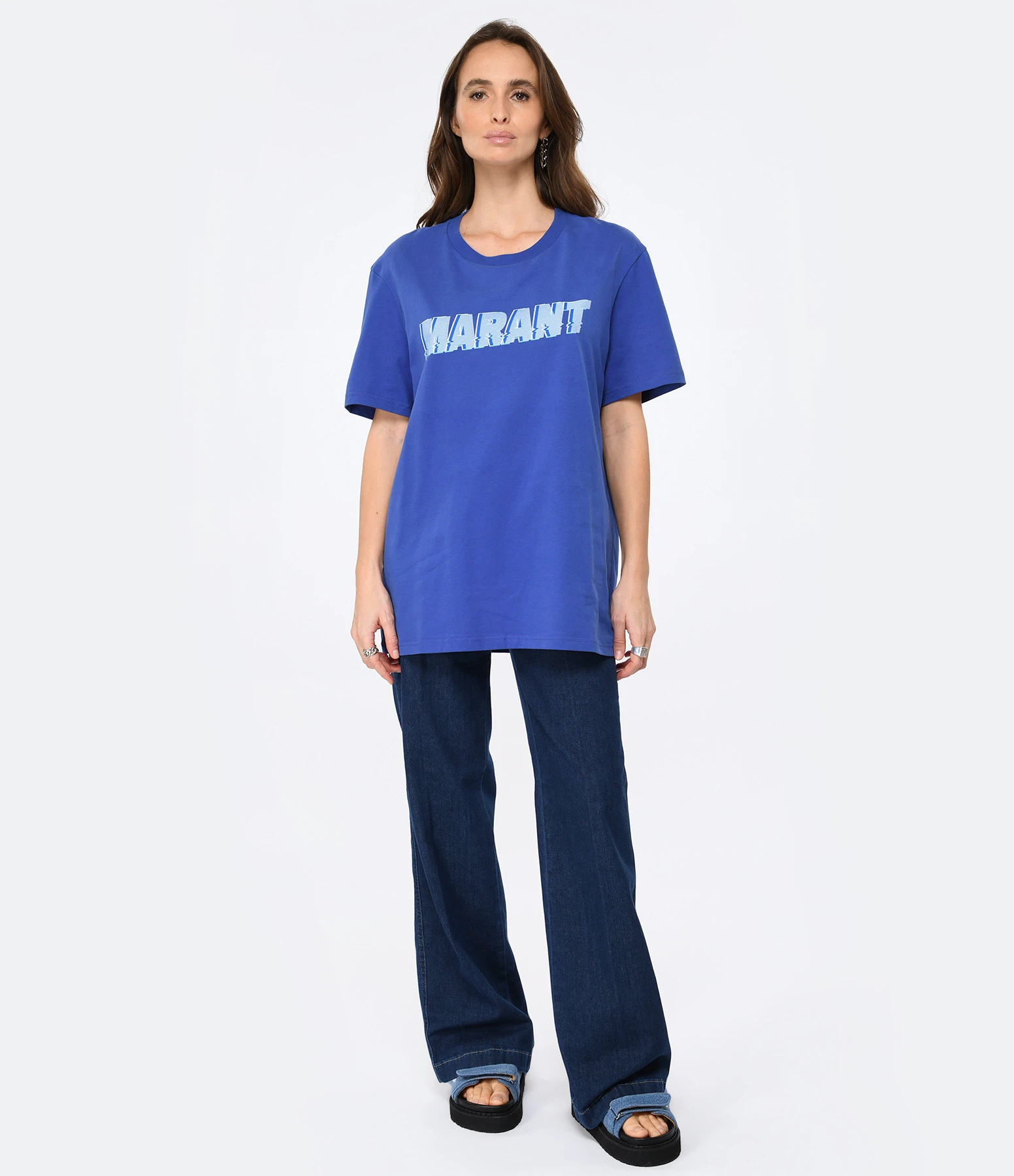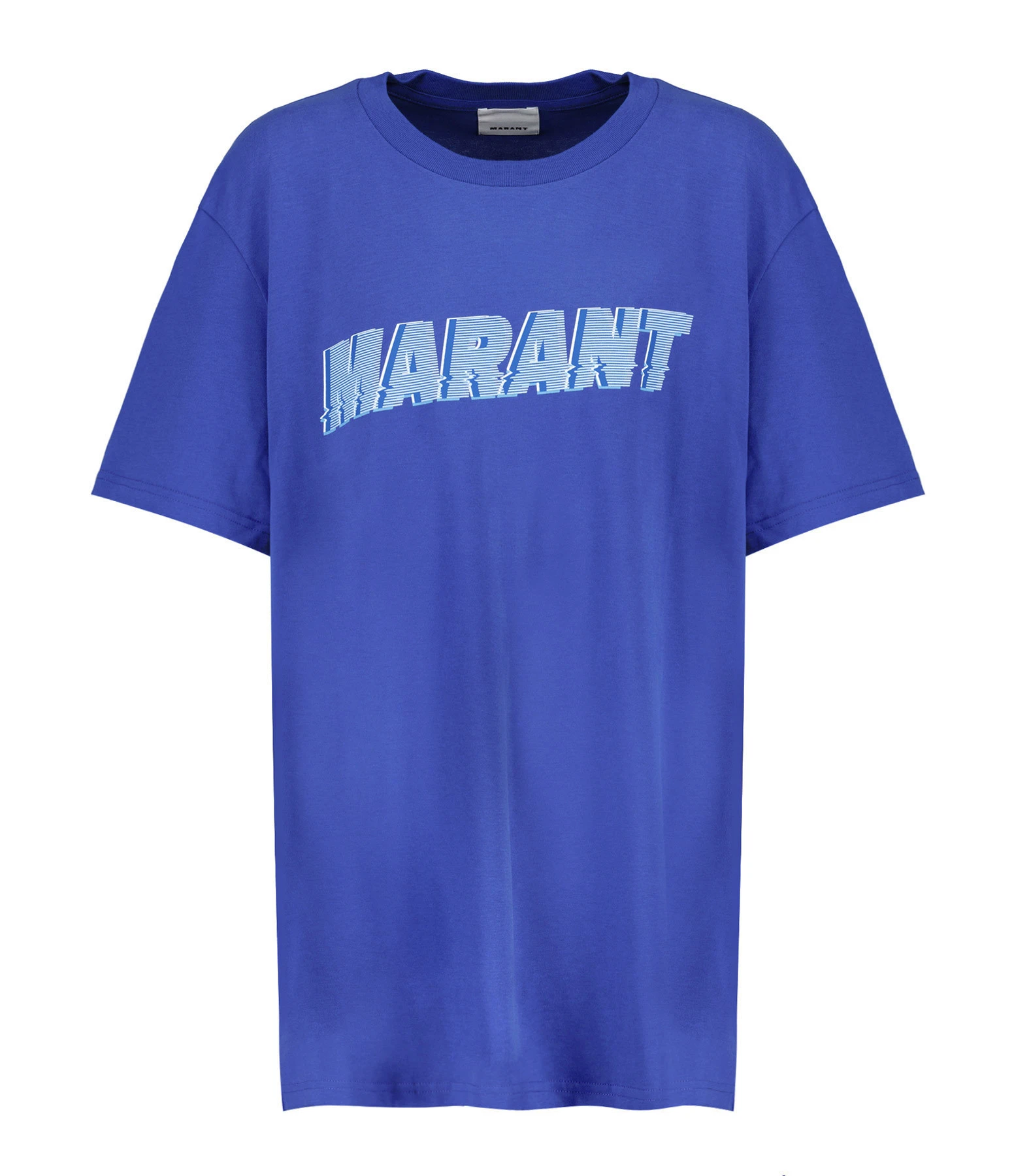 Tee-shirt en coton bleu électrique. Inscription « MARANT » bleue flockée sur le devant. Col rond. Manches courtes. Coupe droite. Base droite.