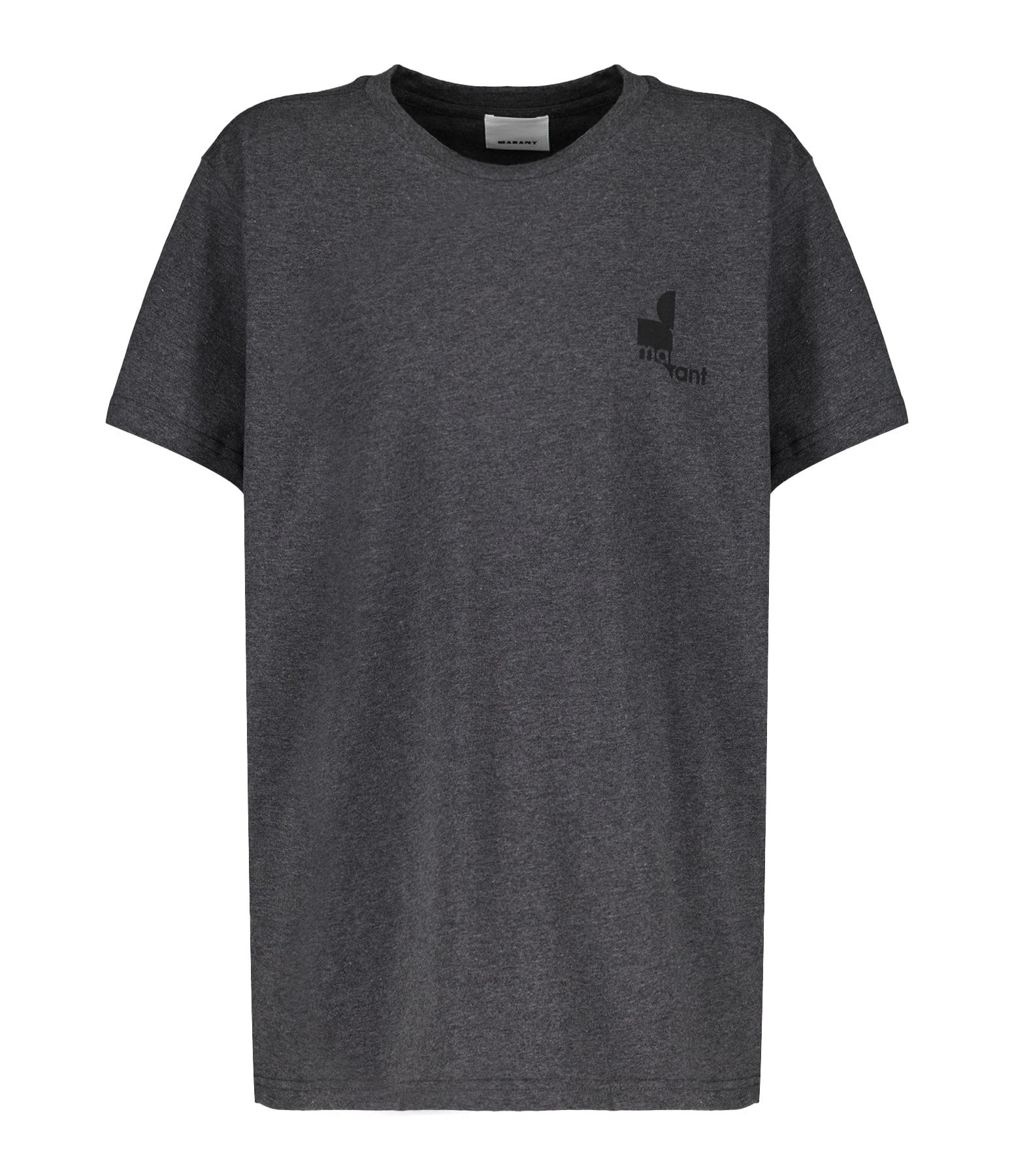 Tee-shirt en coton gris anthracite avec le logo Marant imprimé en noir sur la poitrine. Col rond côtelé. Manches courtes. Coupe droite. Base droite.