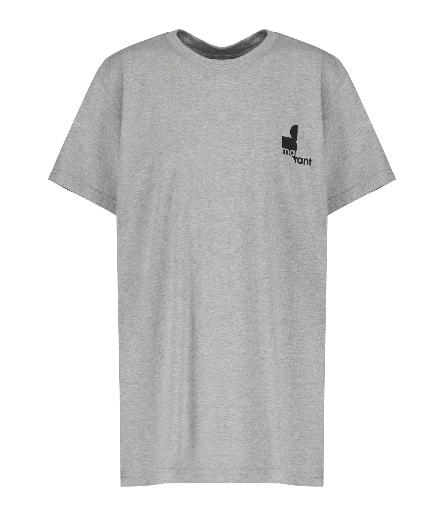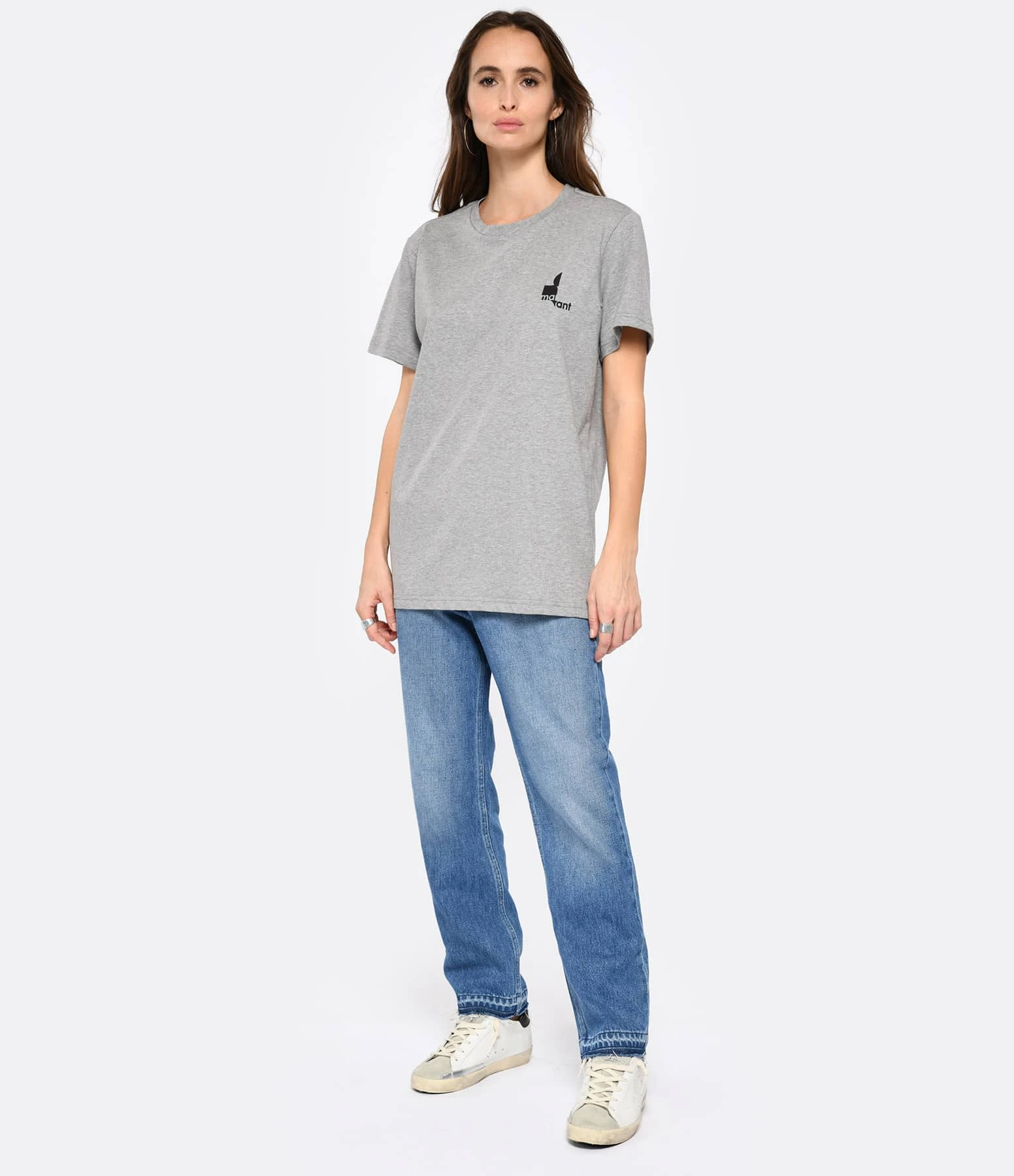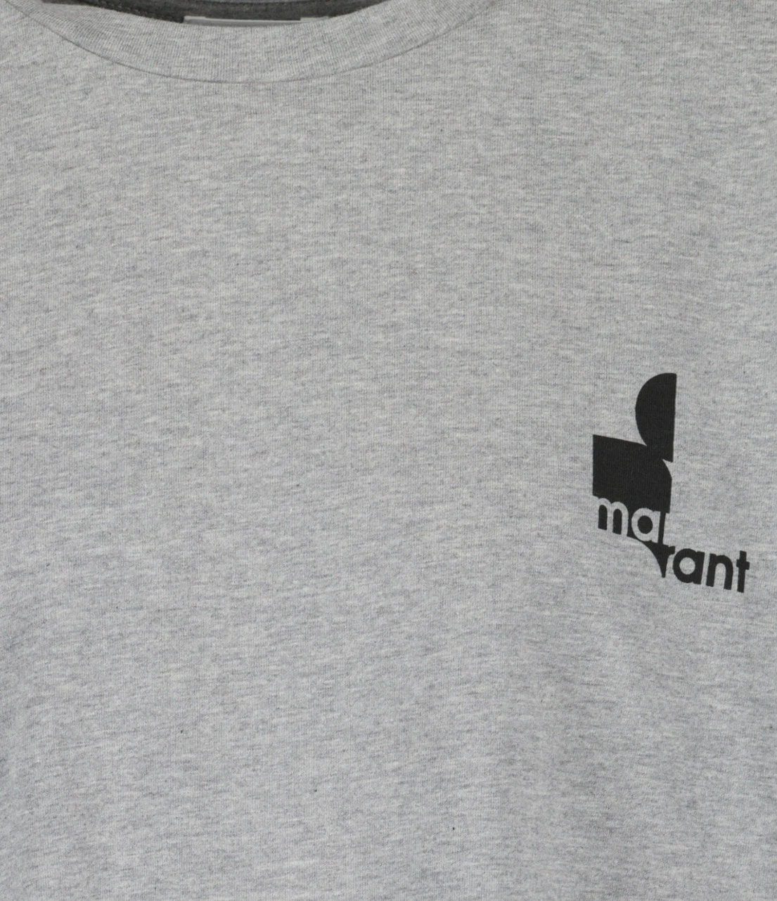 Tee-shirt en coton gris chiné avec le logo Marant imprimé en noir sur la poitrine. Col rond côtelé. Manches courtes. Coupe droite. Base droite.