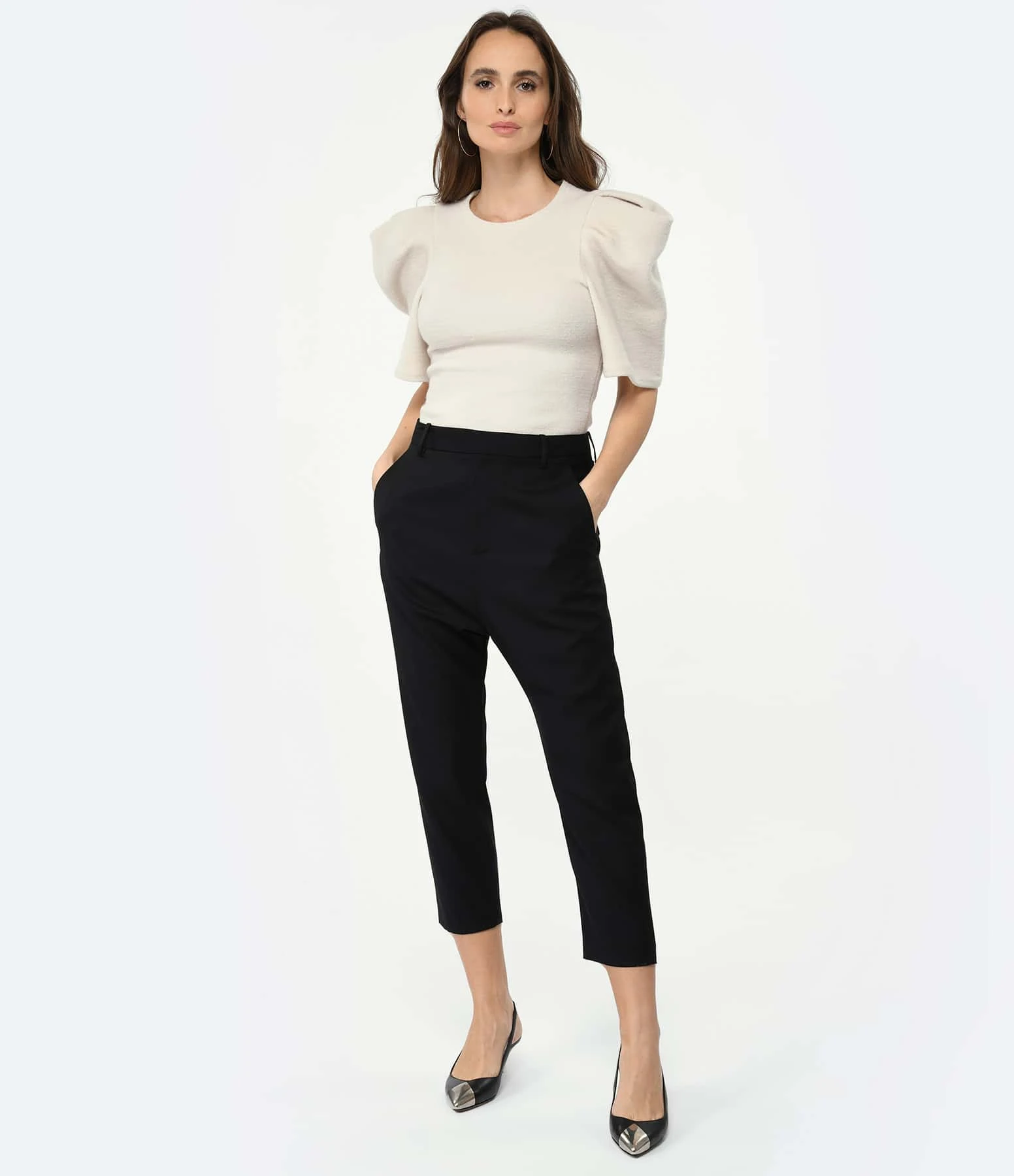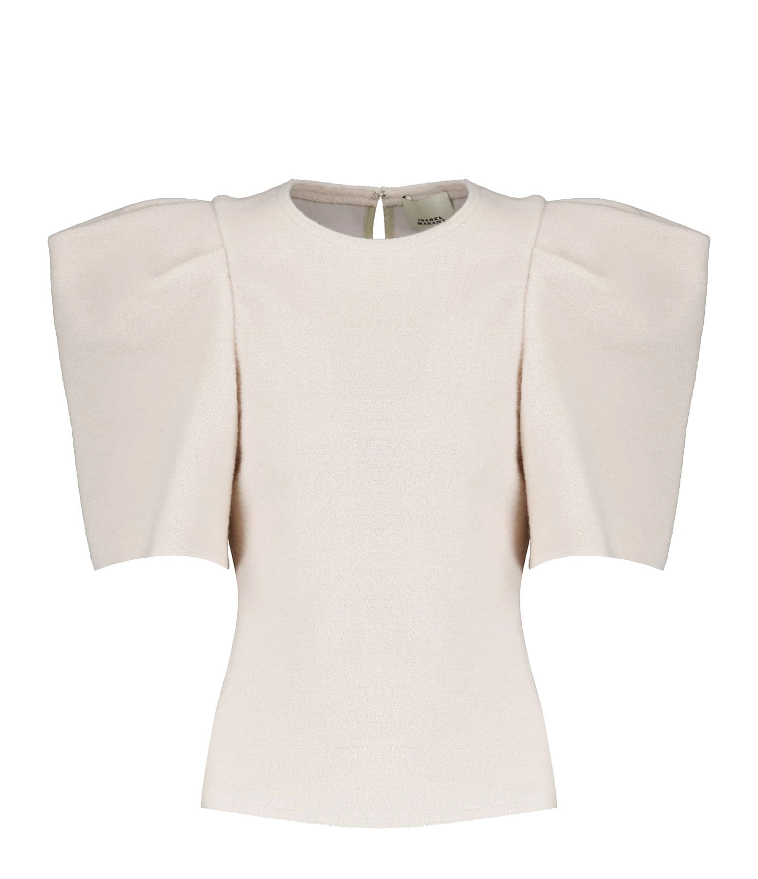 Top en laine écru. Manches courtes avec épaulettes. Fermeture par crochet au niveau de la nuque. Fermeture zippée invisible latérale. Coupe droite. Base droite.