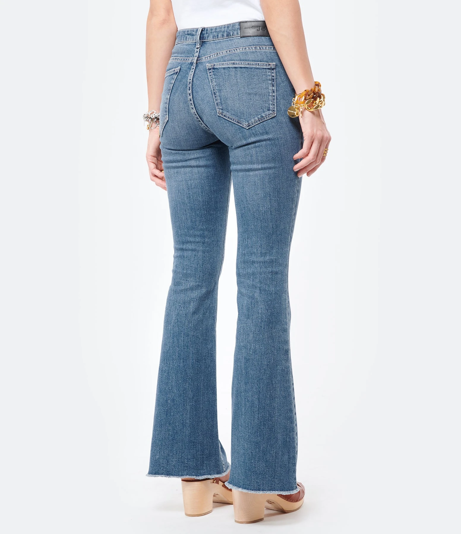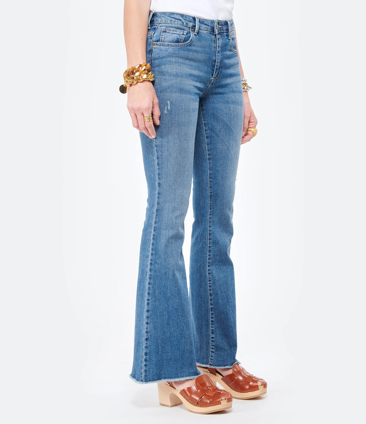 Pantalon en denim bleu clair délavé. Coupe flare. Cinq poches. Fermeture par zip et bouton gravé Jeanne Vouland. Coupé à cru en bas de jambe. Coupe flare, évasée sur le bas.