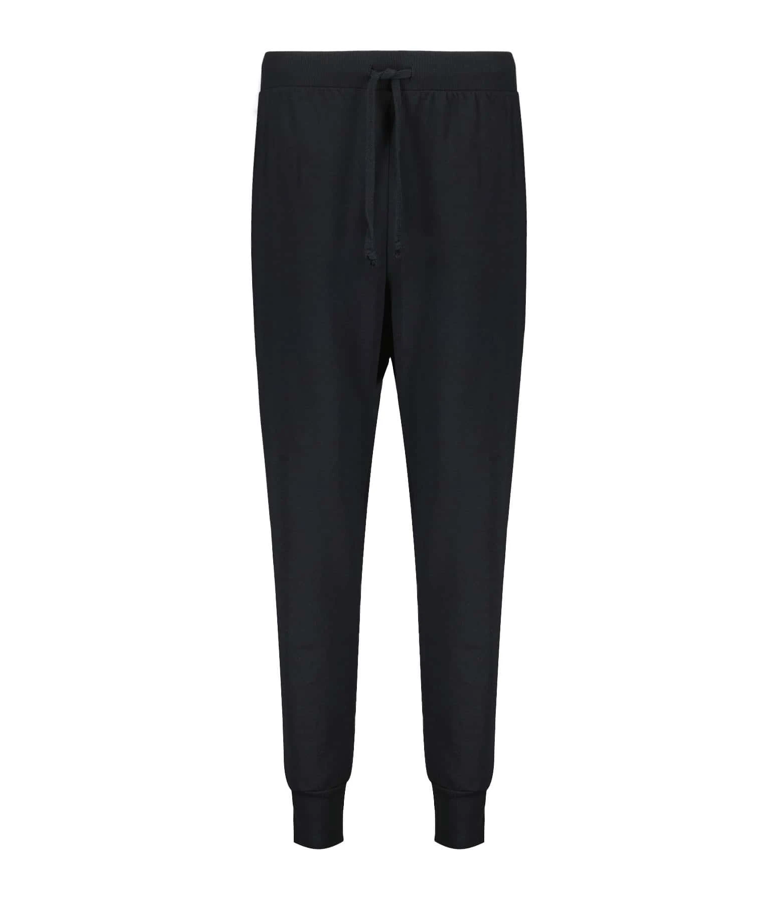 Pantalon de jogging en coton pima noir. Bas de jambes resserrés par bord côtes. Taille élastiquée avec liens de serrage. Coupe slim.