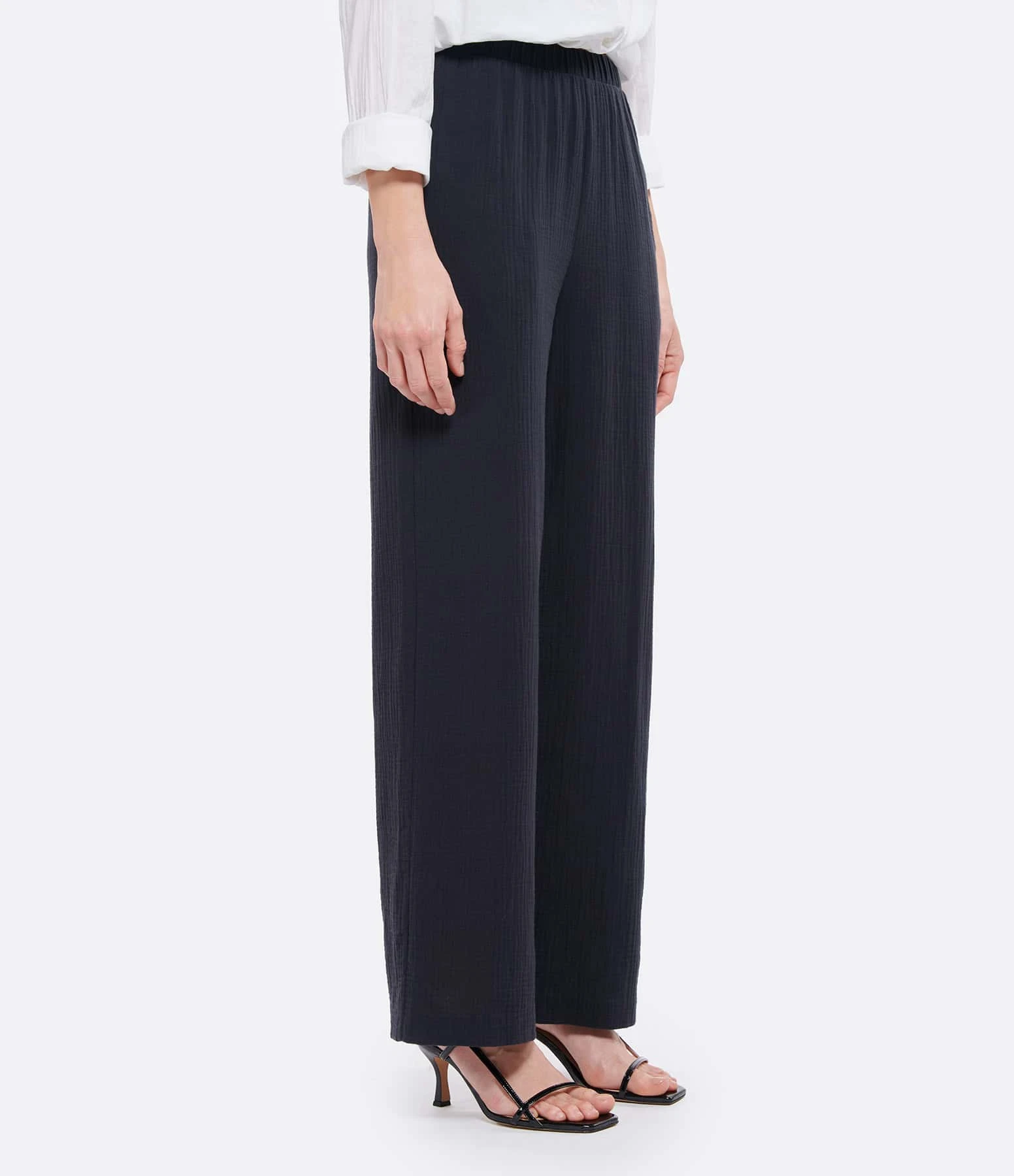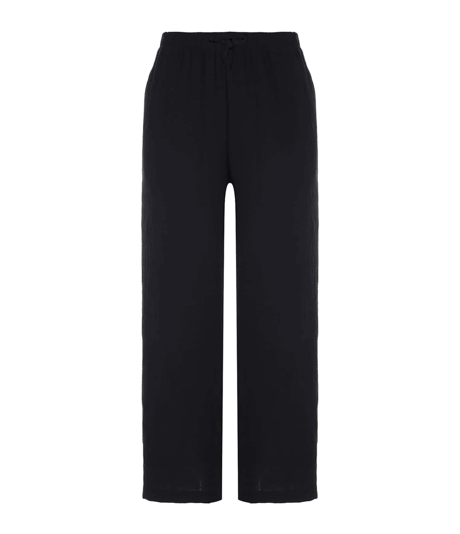Pantalon en gaze de coton noir. Taille élastiquée avec liens de serrage. Deux poches fendues. Coupe large.