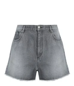 Short en denim gris. Taille haute avec passants pour ceinture. Fermeture par zip et bouton. Cinq poches. Bords frangés. Coupe droite.