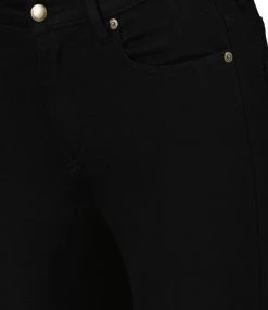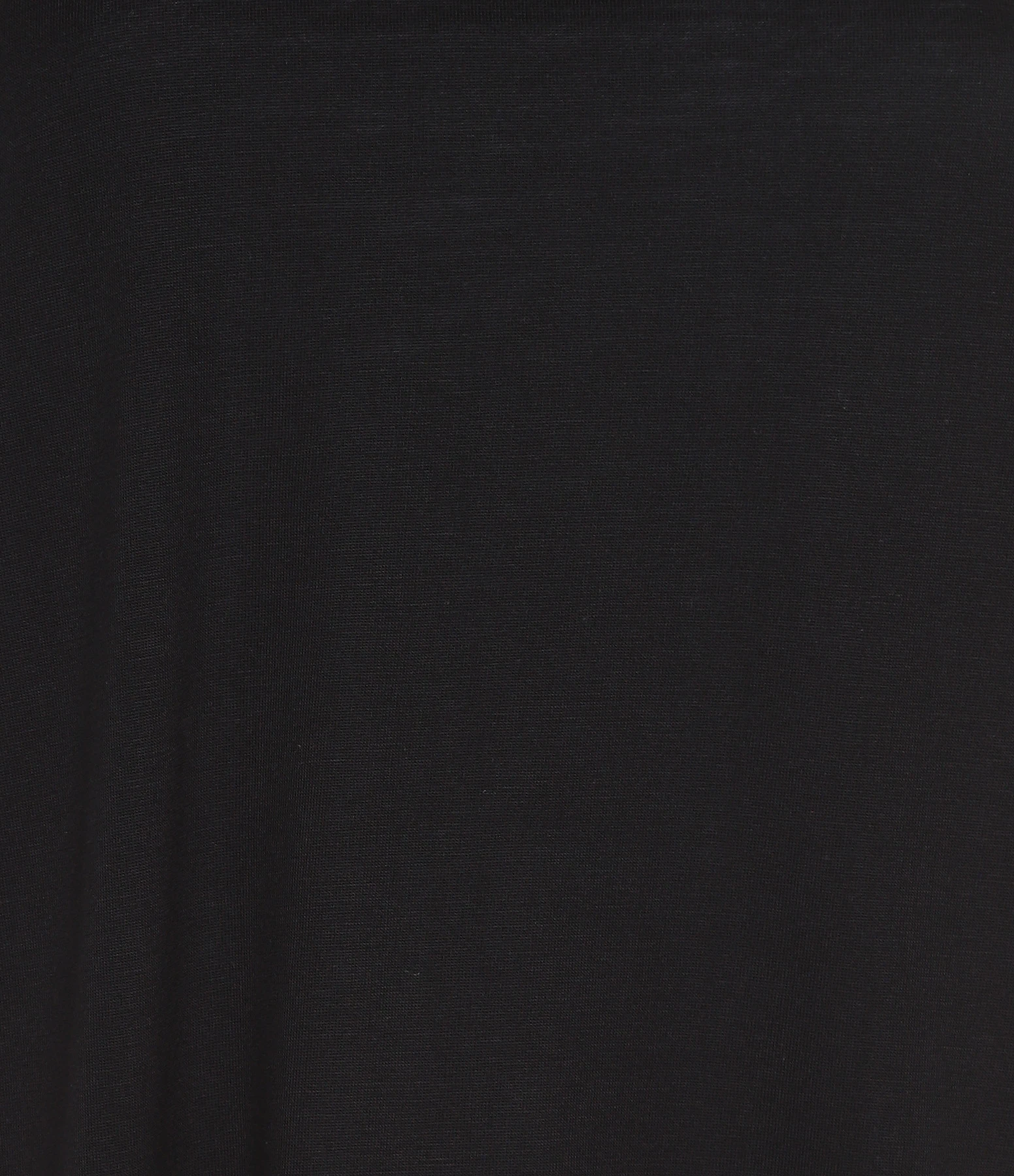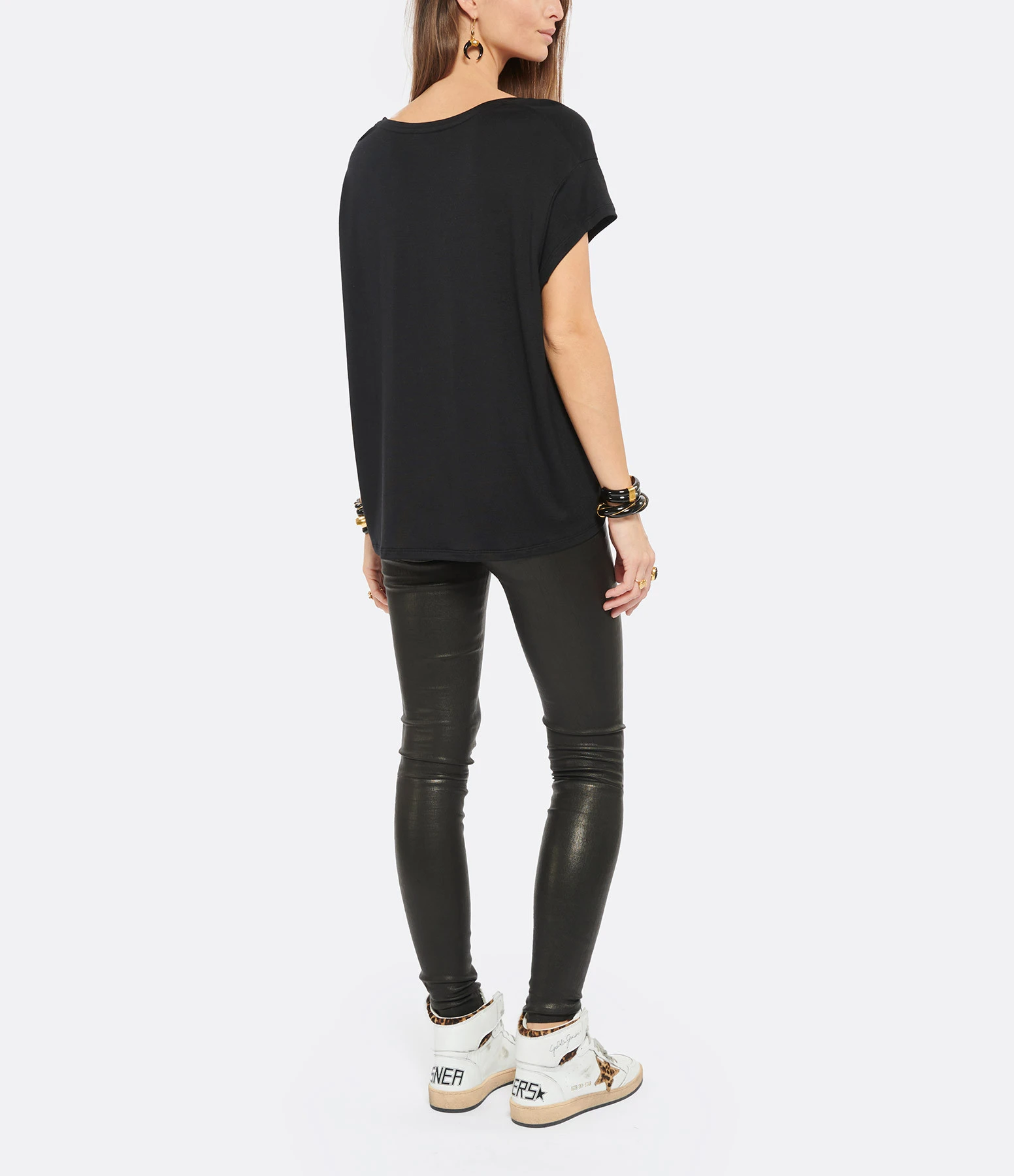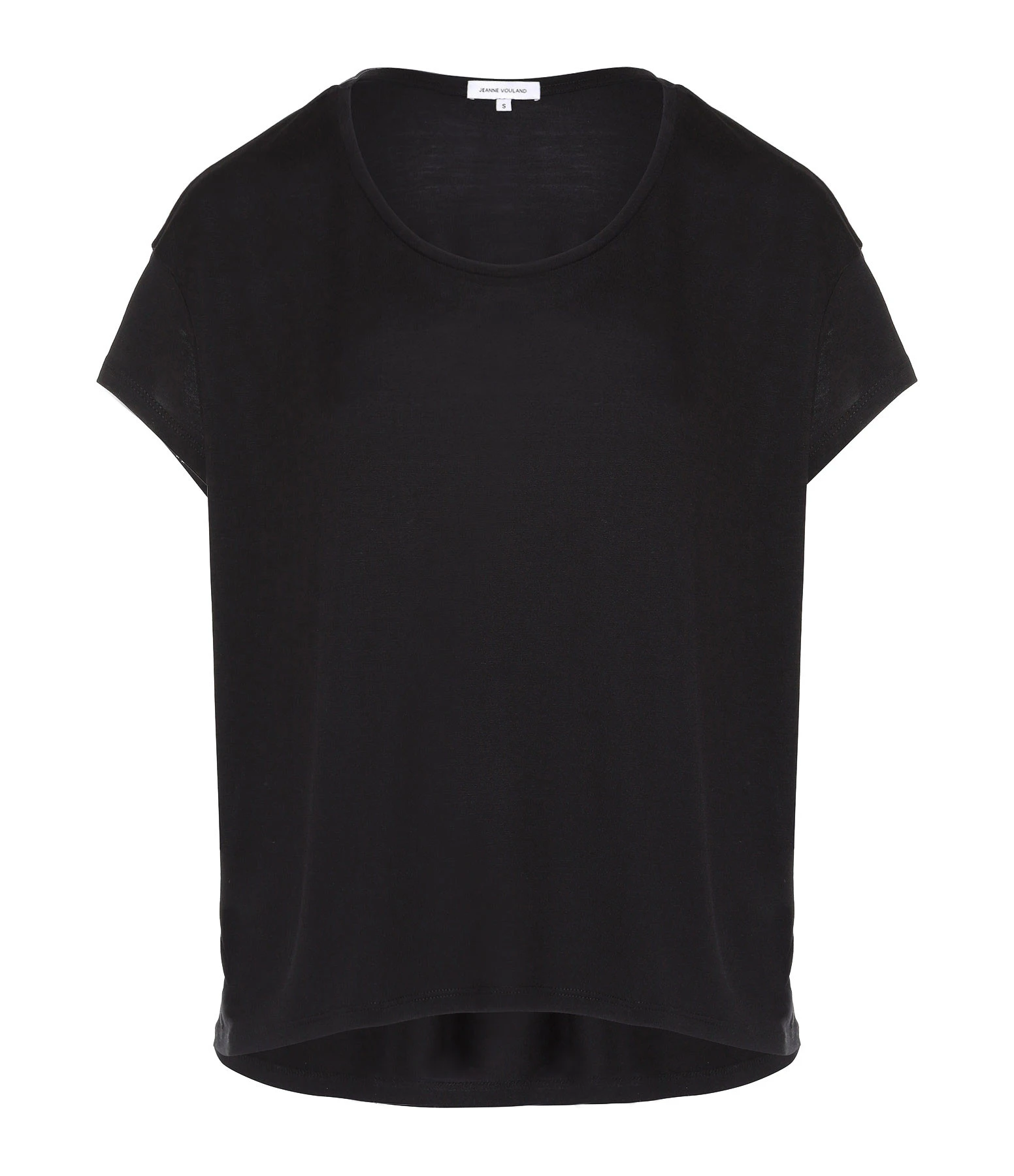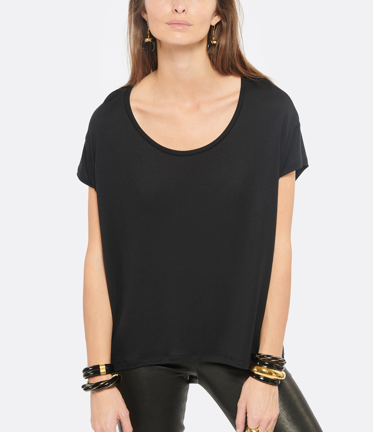 Tee-shirt noir en lyocell pour femme. Col rond. Manches courtes. Base droite avec broderie « JV » ton sur ton sur le côté gauche. Non doublé.