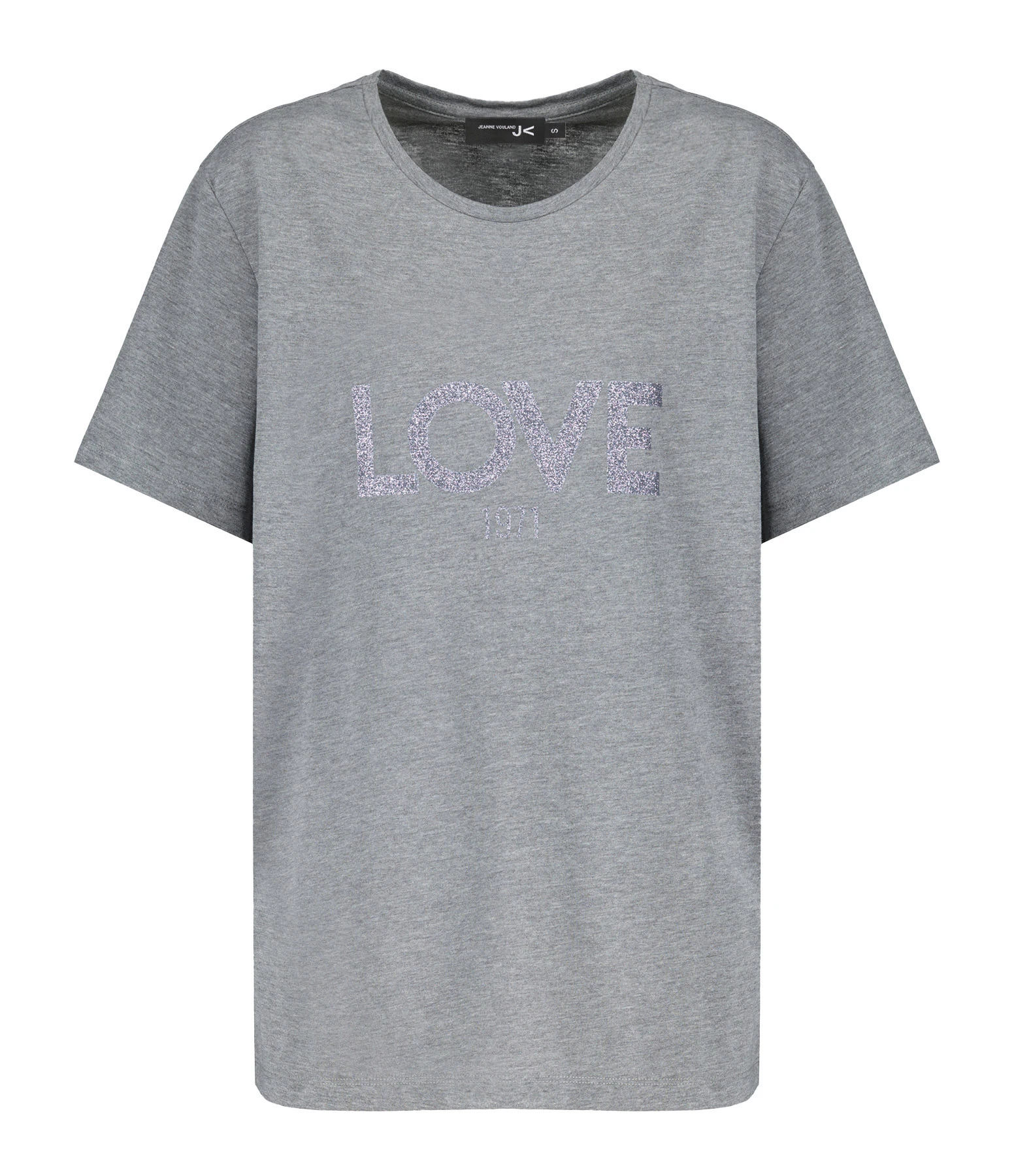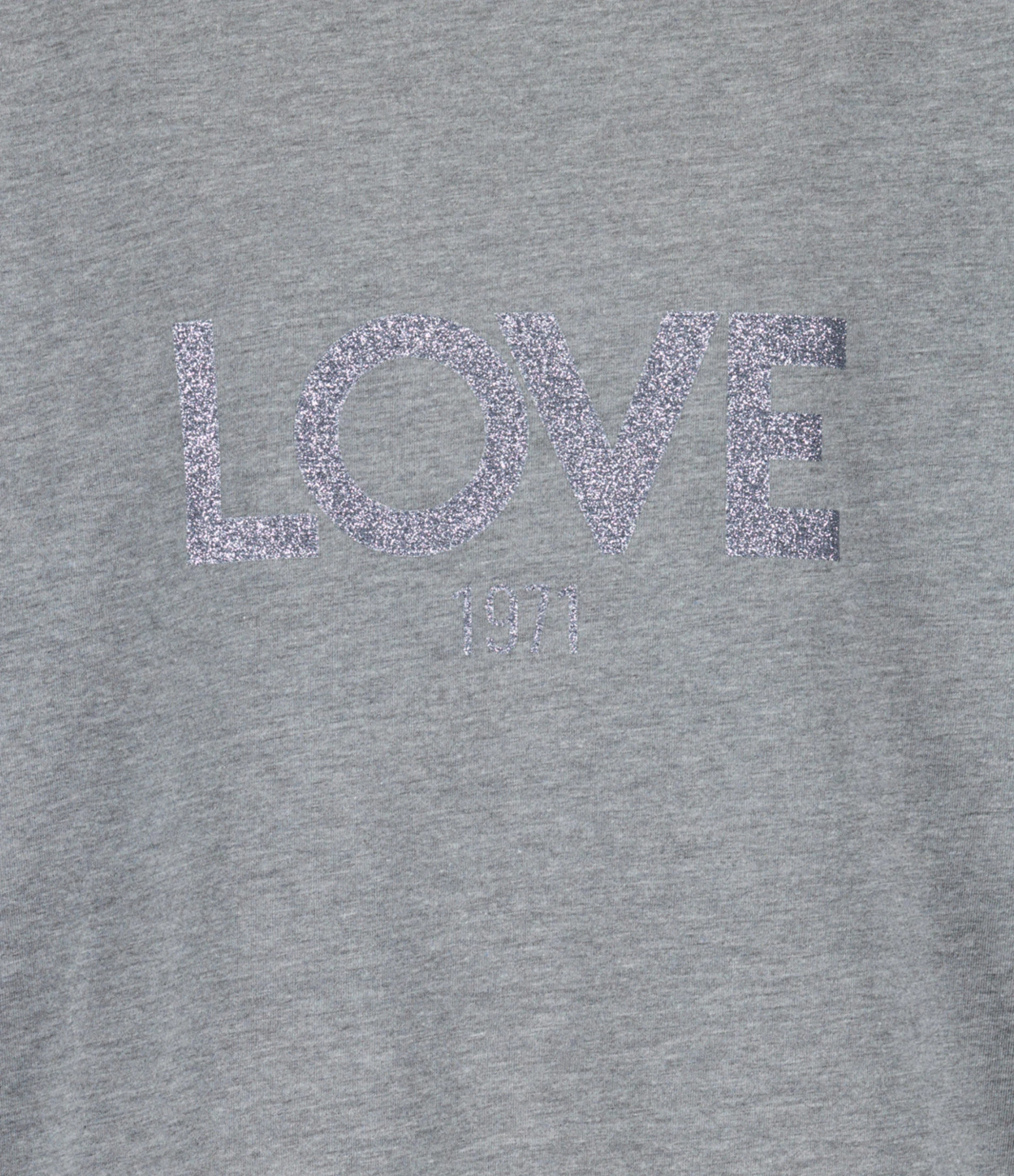 Tee-shirt gris en coton. Inscription « LOVE 1971 » flockée en paillettes argentées sur le devant. Col rond. Manches courtes. Coupe droite. Base droite.