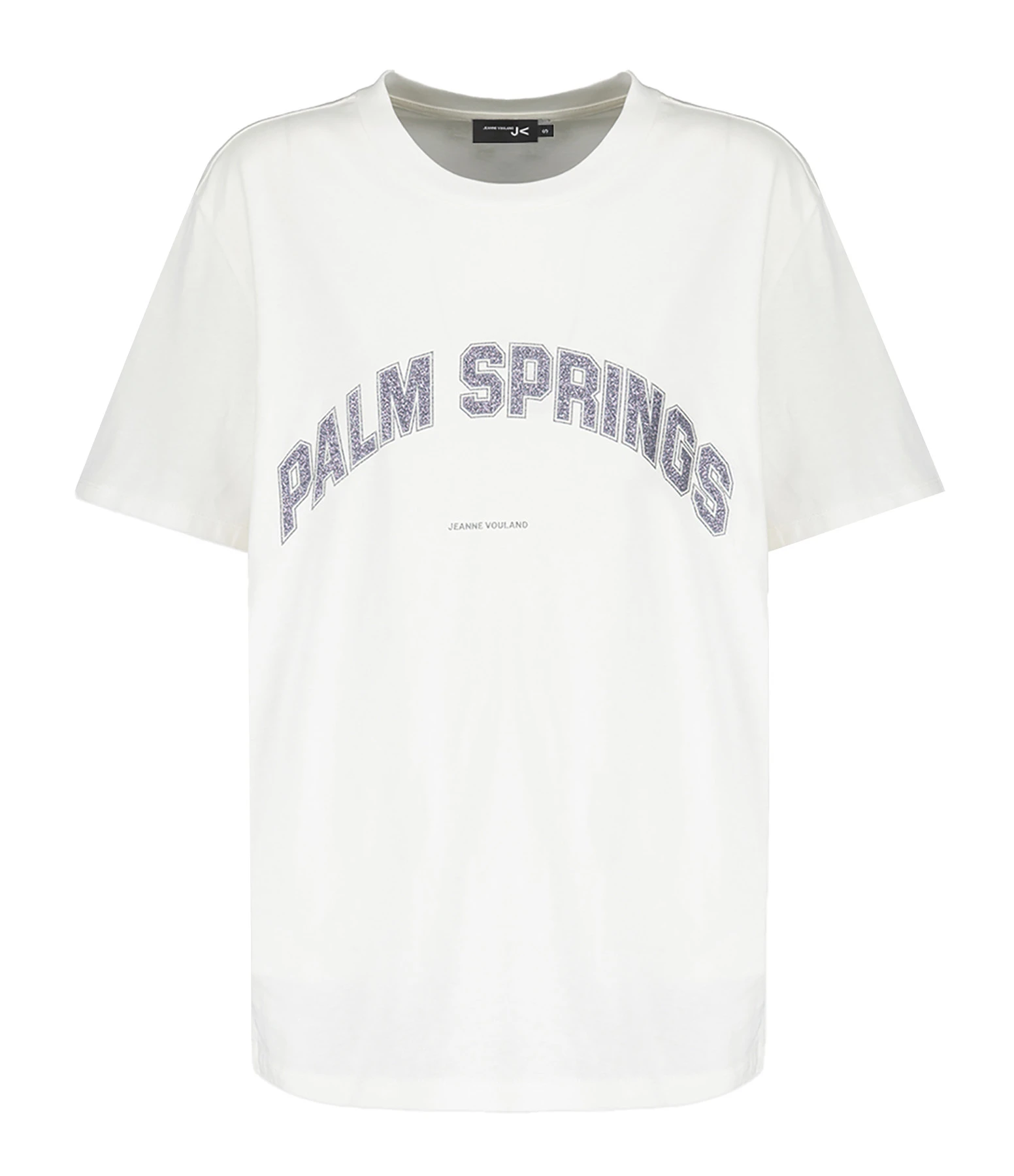 Tee-shirt blanc en coton biologique. Inscription « PALM SPRINGS » flockée en paillettes argentées sur le devant. Col rond. Manches courtes. Coupe droite. Base droite.