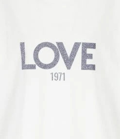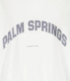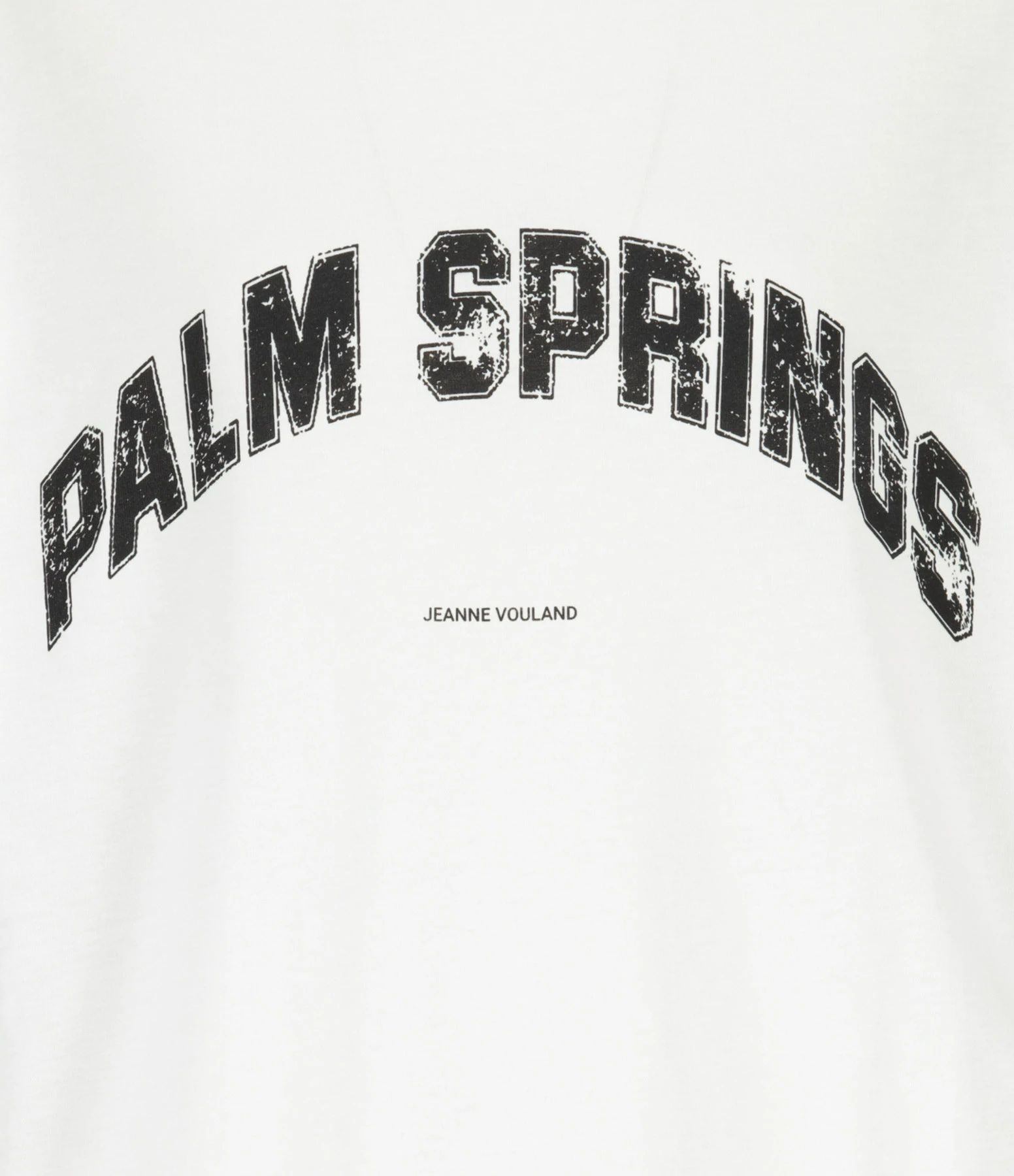 Tee-shirt blanc en coton biologique. Inscription « PALM SPRINGS » flockée en noir sur le devant. Col rond. Manches courtes. Coupe droite. Base droite.