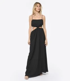 Robe longue à panneaux froncés en coton noir. Décolleté profond en V avec un jeu de découpe. Dos échancré en V avec liens à nouer. Sans manches. Fines bretelles. Deux poches prises dans les coutures latérales. Cordons de serrage à nouer au niveau des coutures latérales. Coupe large. Base droite.