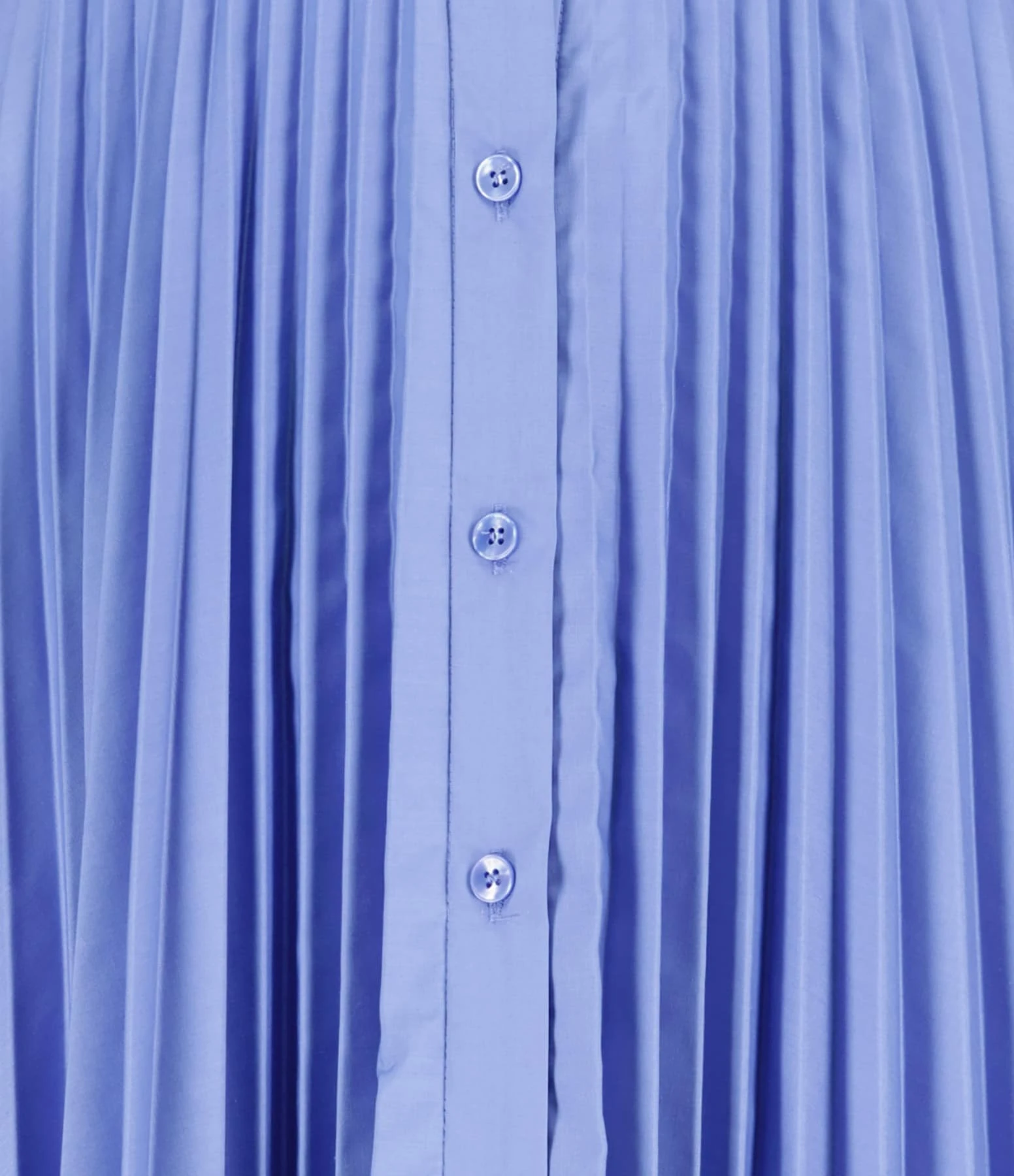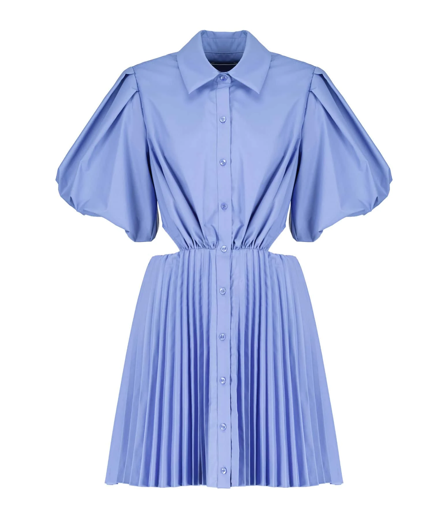 Robe courte bleu. Col chemise. Manches courtes ballon. Fermeture boutonnée sur le devant. Boutons bleus nacrés. Jeu de découpes au niveau de la taille froncée. Pli creux dans le dos. Deux poches prises dans les coutures latérales sur le devant. Coupe buste droite. Jupe plissée et évasée. Base droite. Doublée.