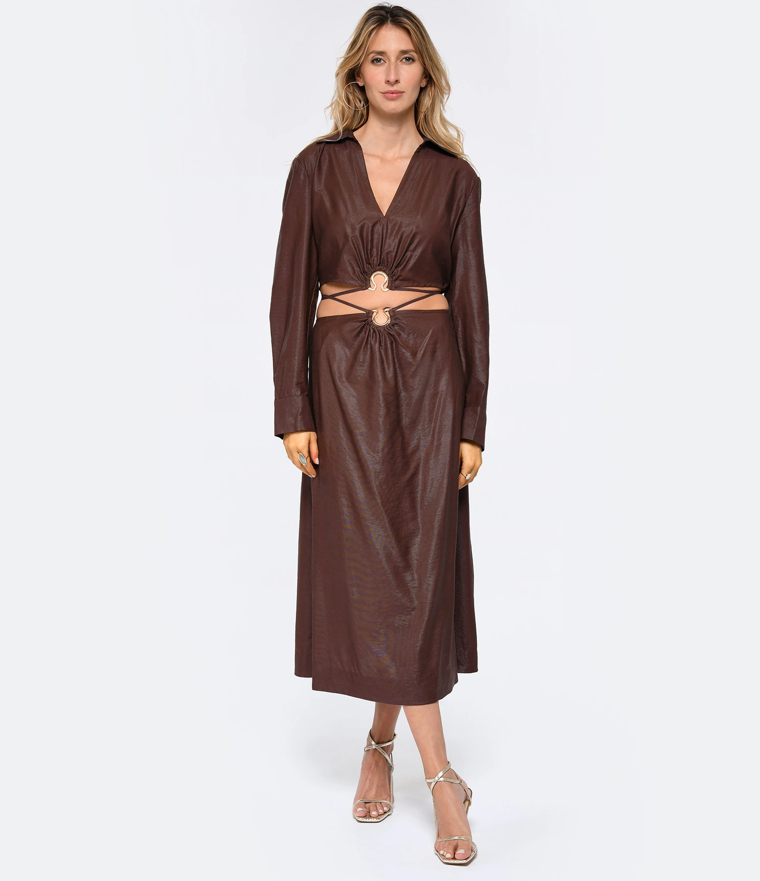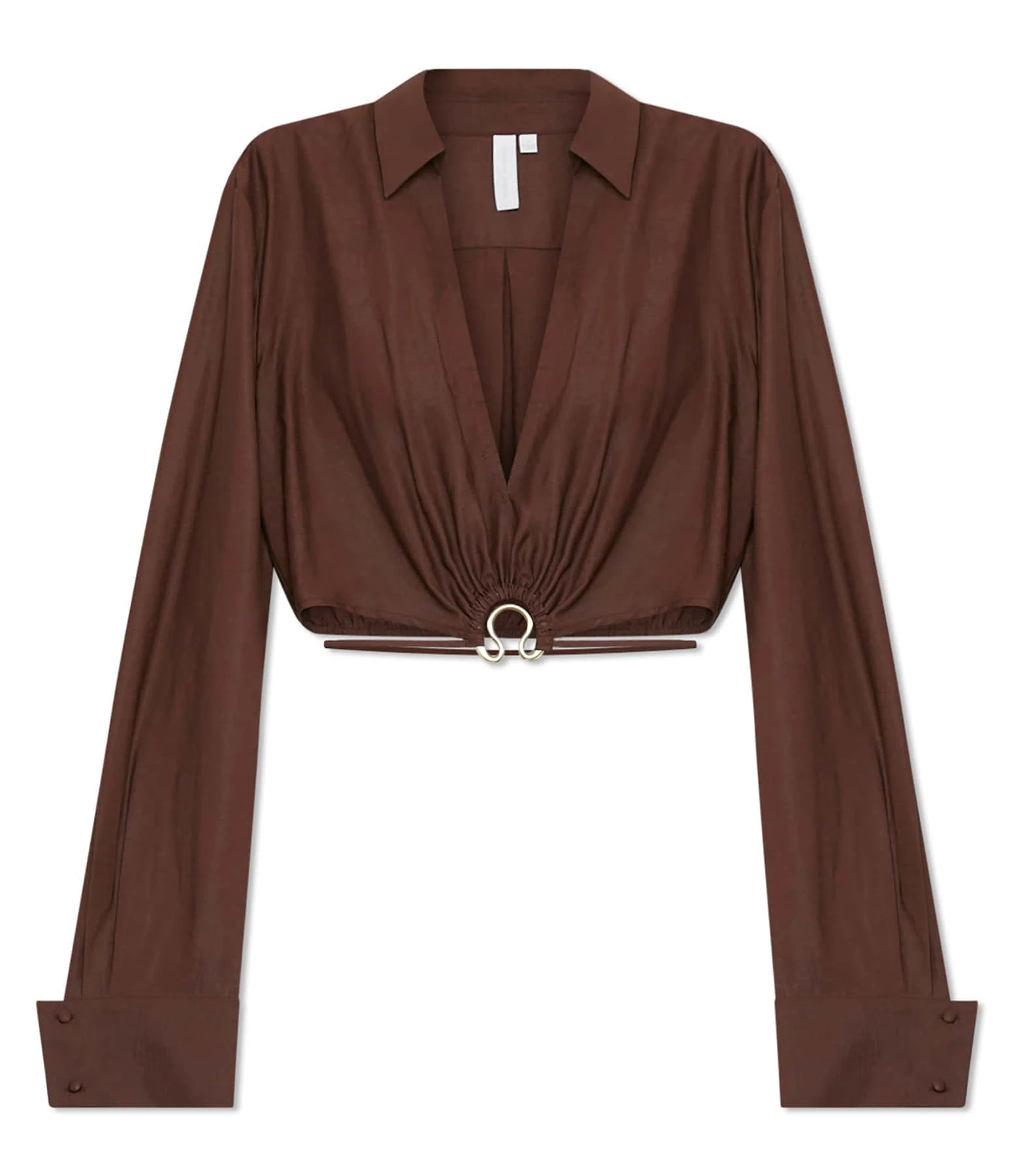 Crop top en satin marron se démarquant par un anneau métallique doré sur le devant. Col chemise avec décolleté en V. Manches longues avec fentes et poignets boutonnés. Pli creux dans le dos. Coupe droite. Longueur raccourcie. Base droite élastiquée et froncée dans le dos avec liens de serrage sur le devant.