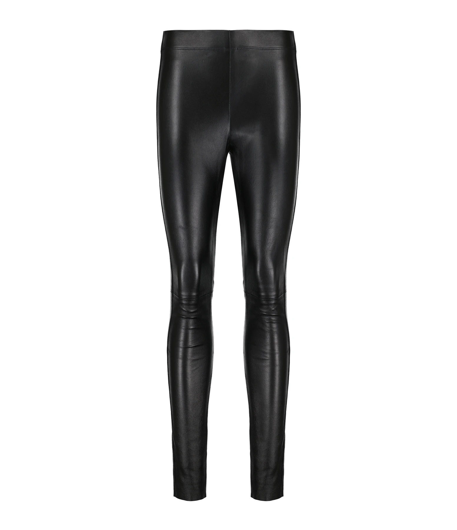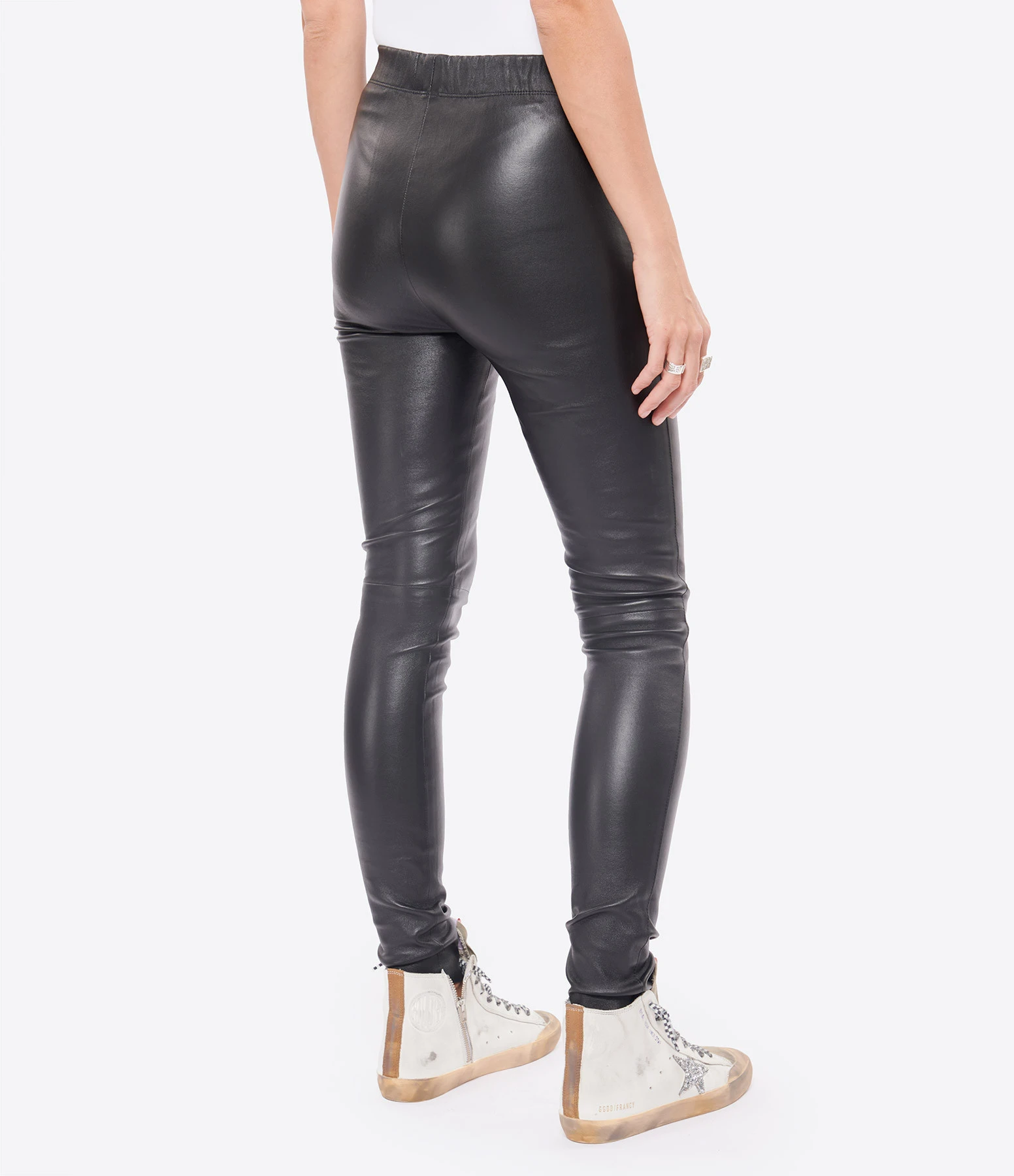 Pantalon legging en cuir noir. Taille haute élastiquée. Coupe skinny. Base droite avec bords francs.