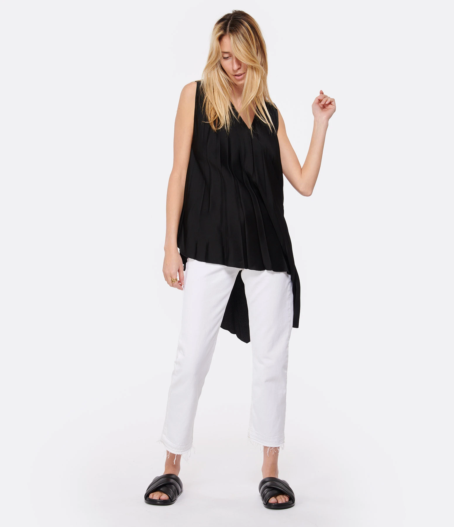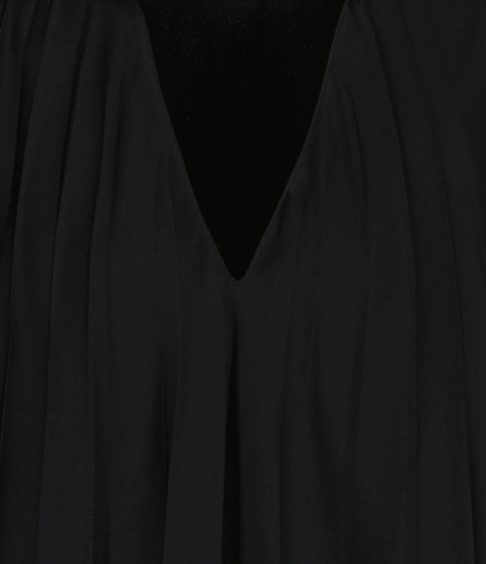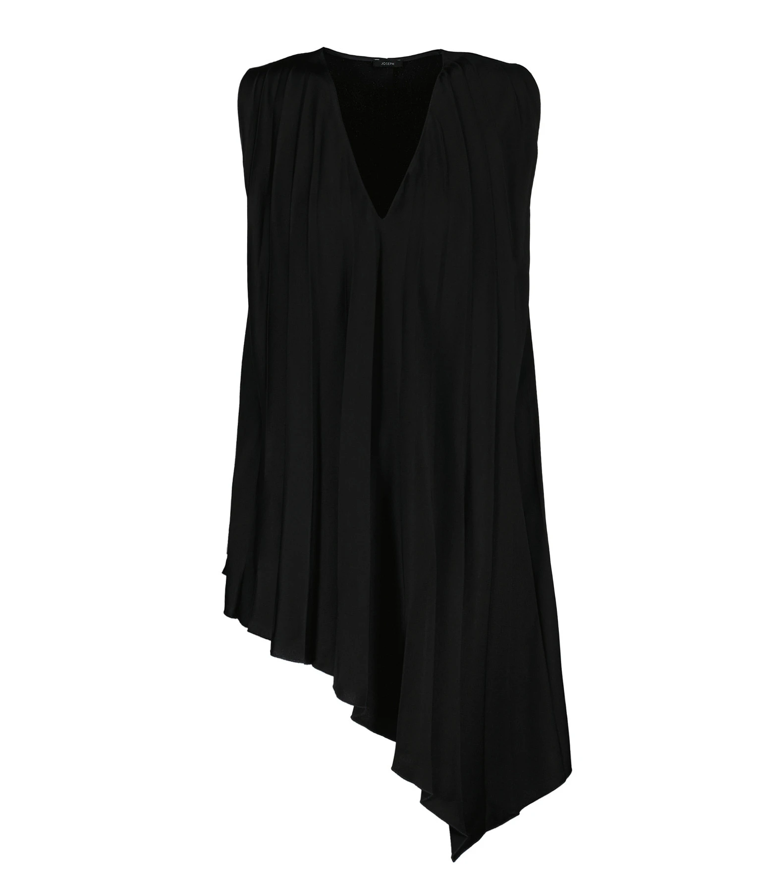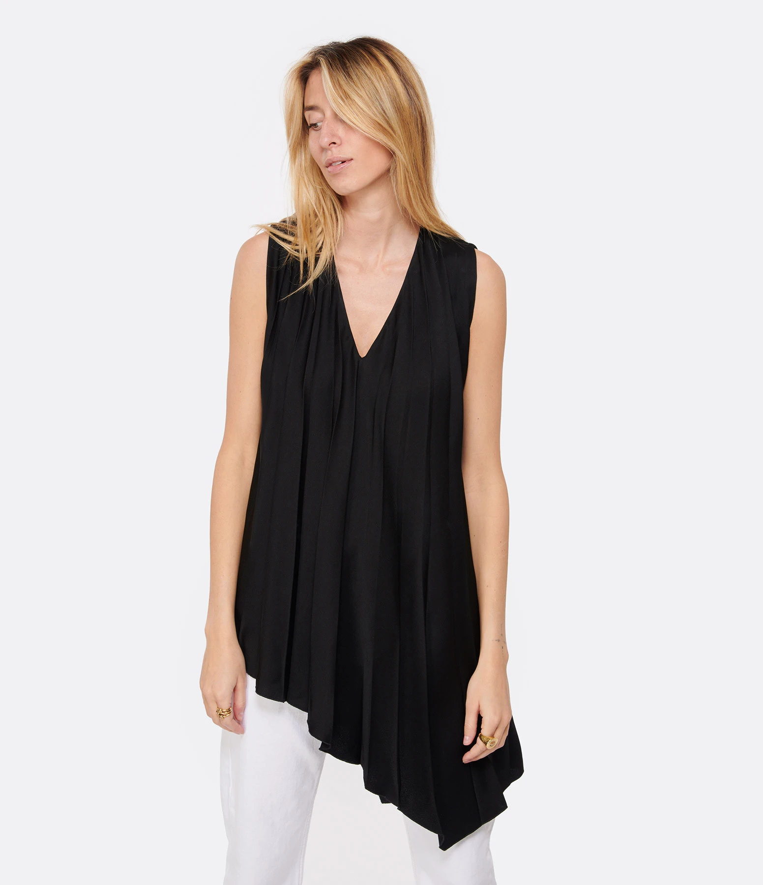 Top sans manches plissé noir. Col en V. Coupe asymétrique. Non doublée.