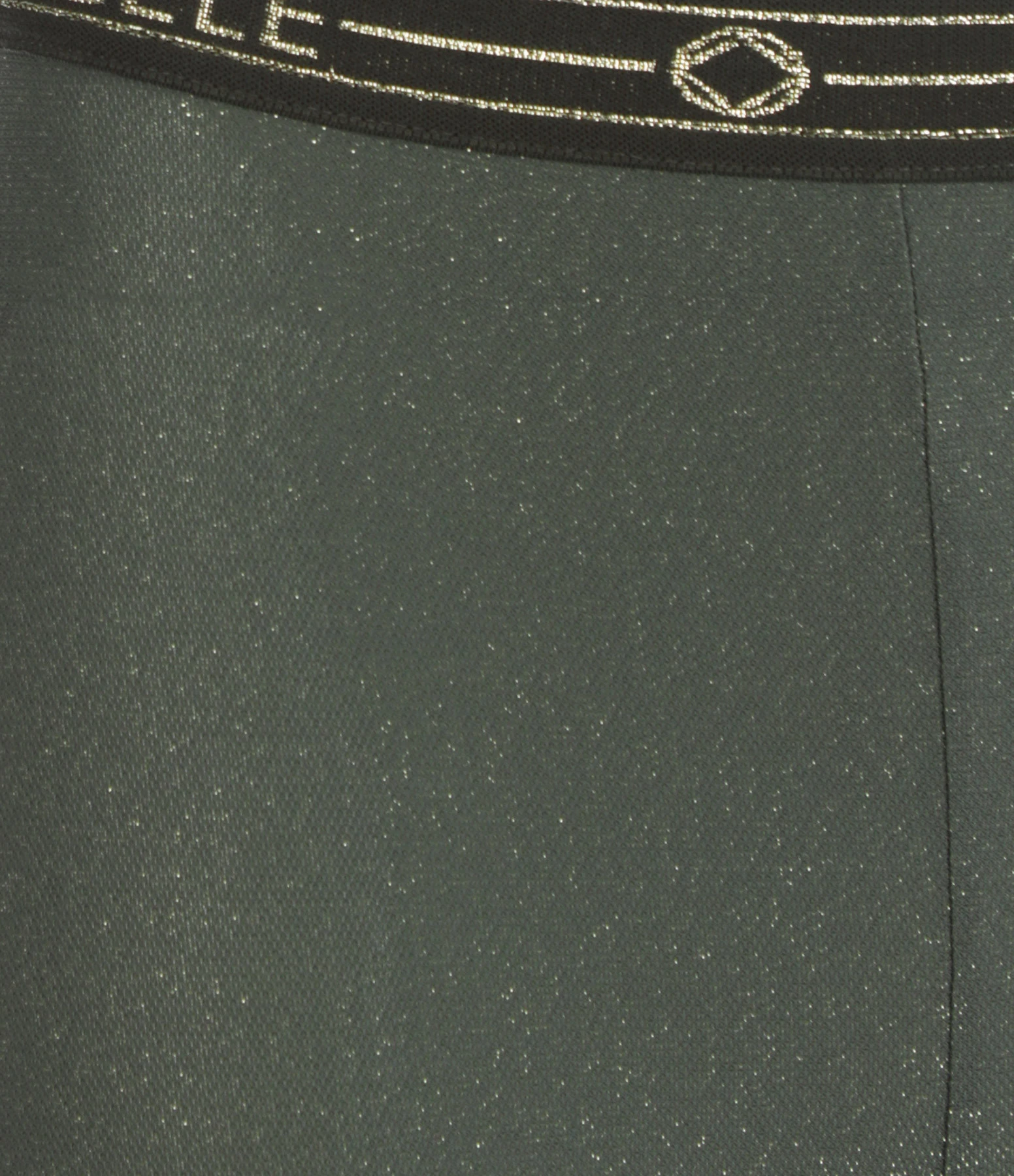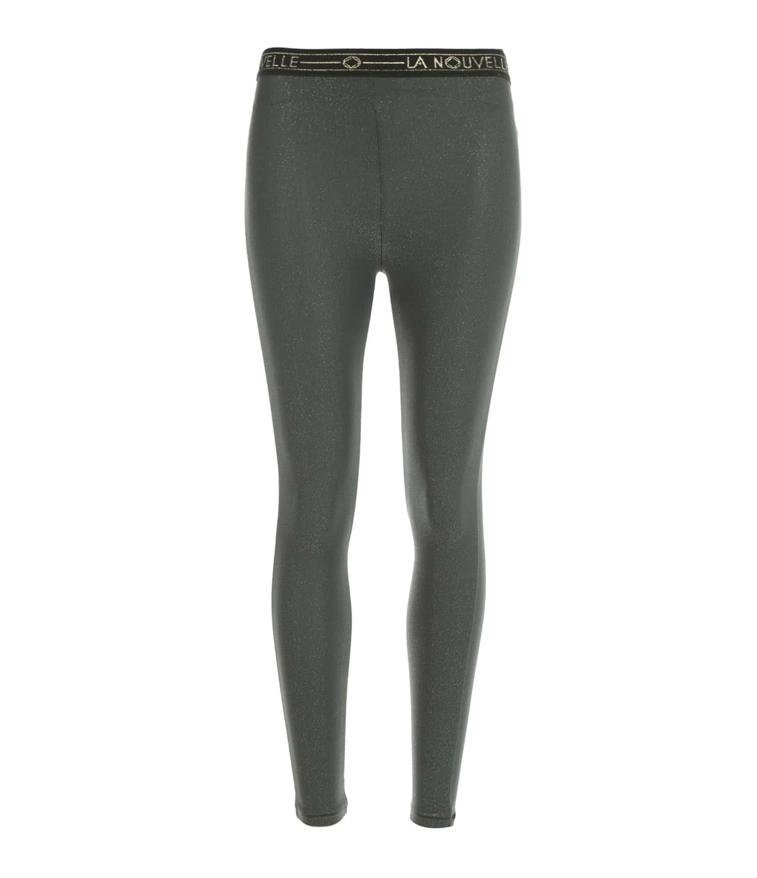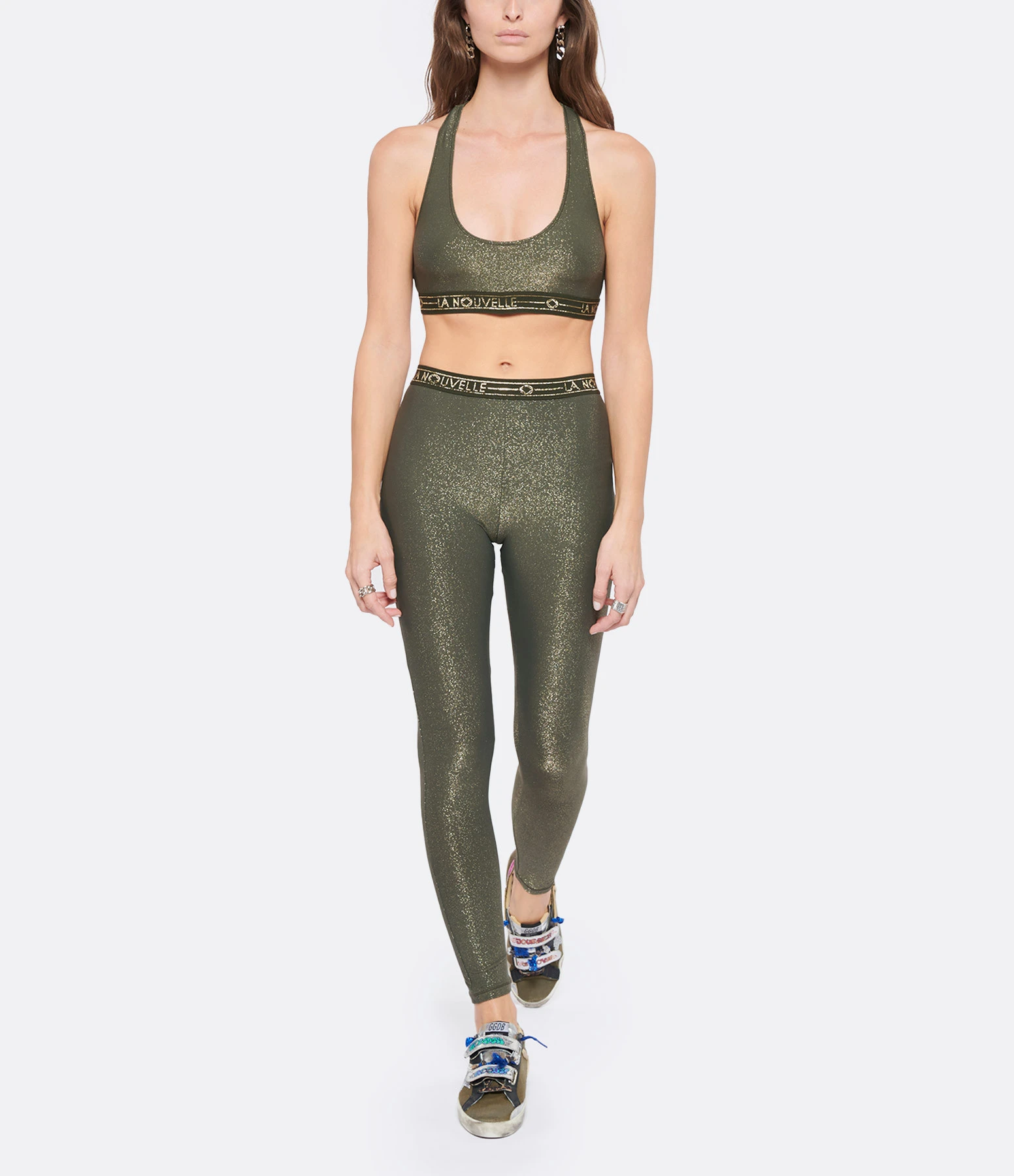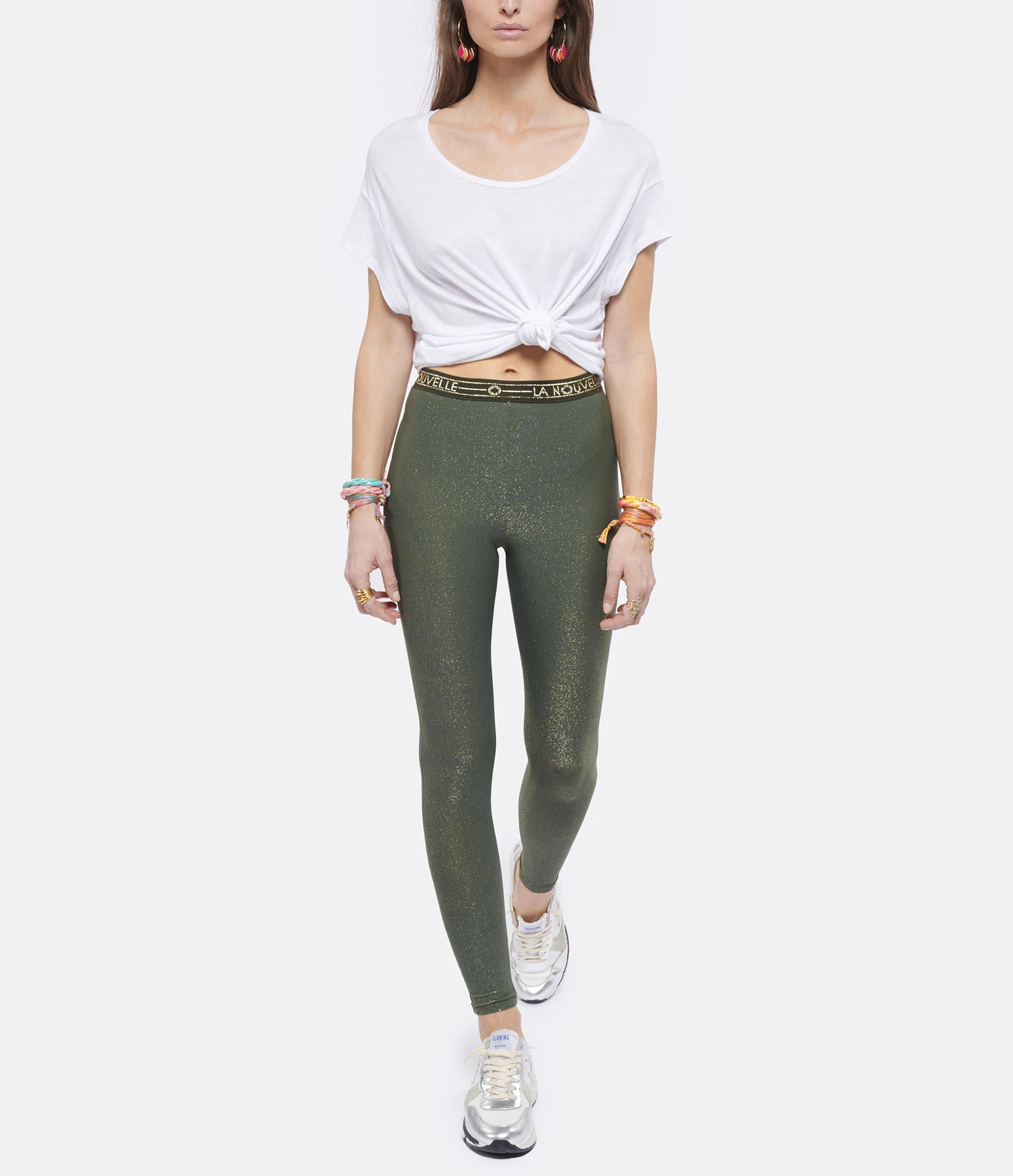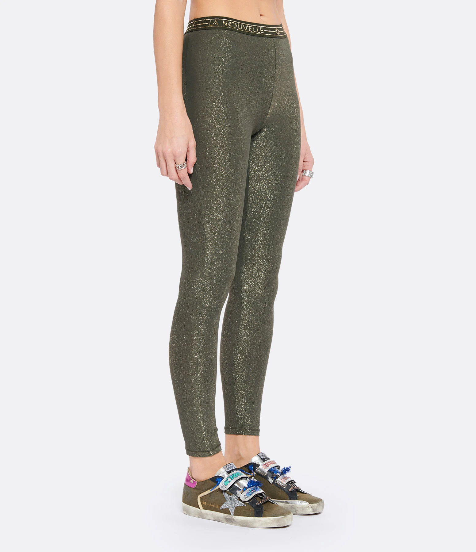 Legging kaki pailleté doré. Bande élastique au niveau de la taille avec inscription pailletée « La Nouvelle ».