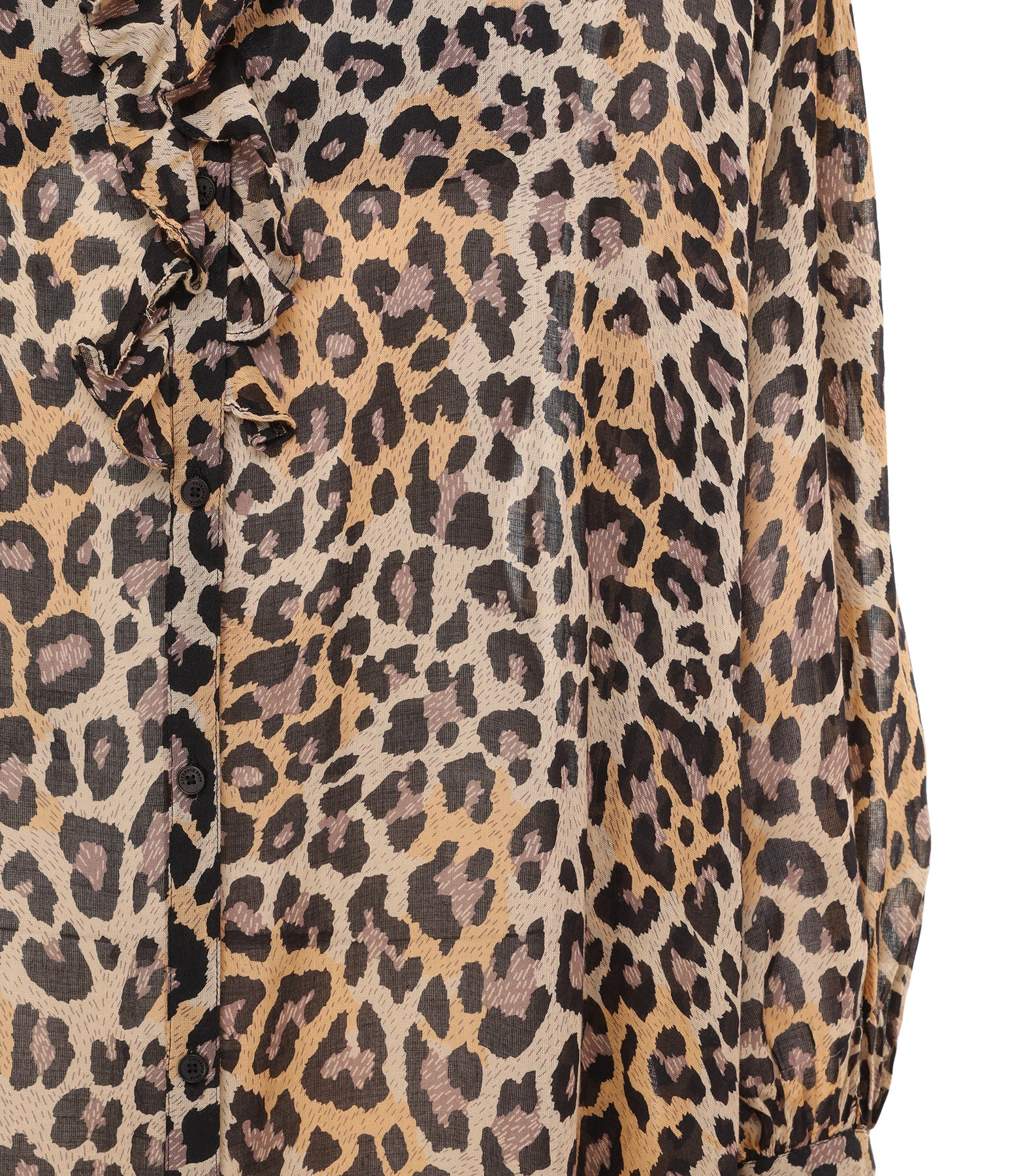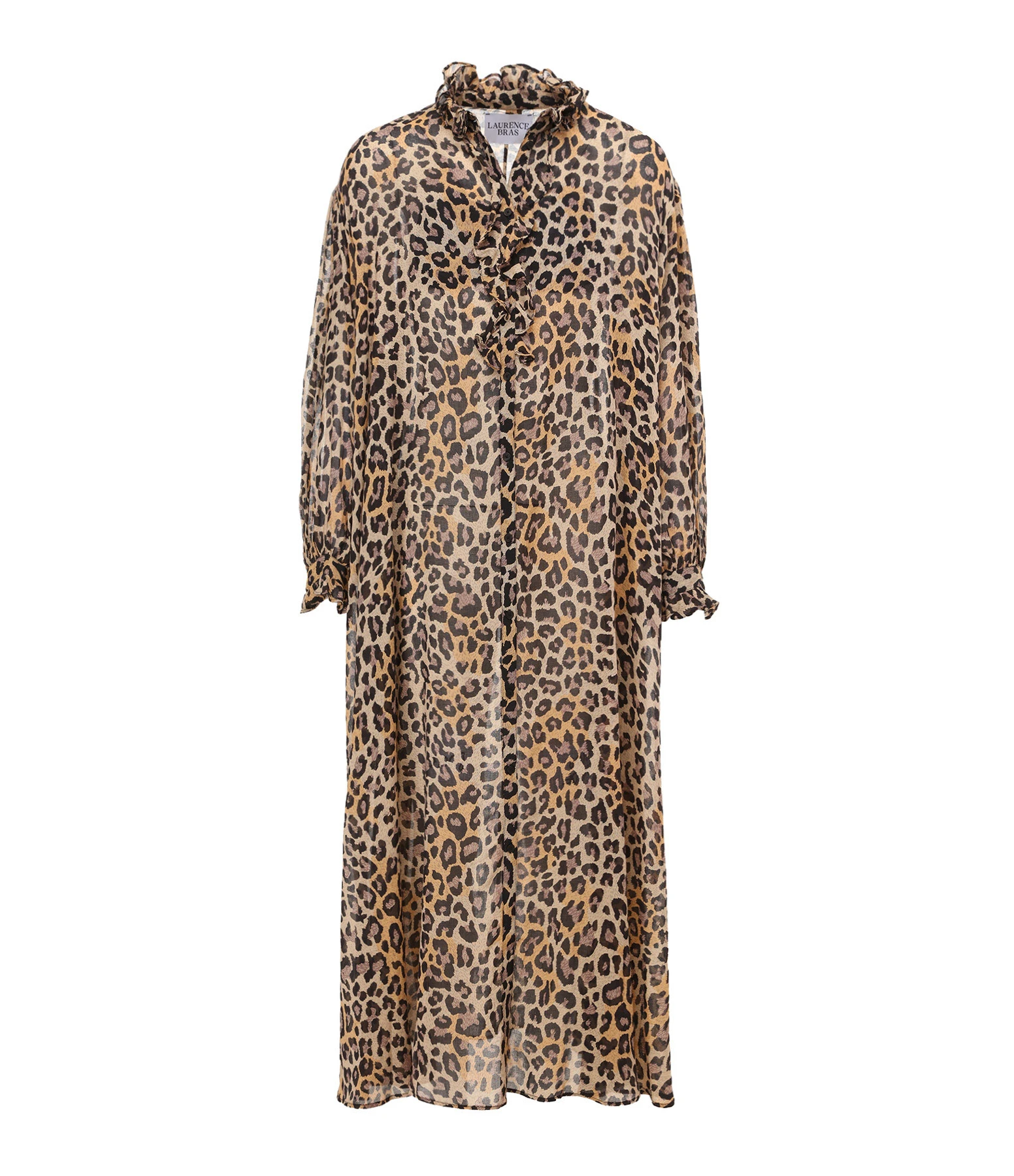 Robe longue fluide à imprimé léopard sur fond marron. Manches longues bouffantes avec poignets volantés. Effet de transparence. Fermeture par boutons sur le devant. Col volanté. Coupe large. Base droite.