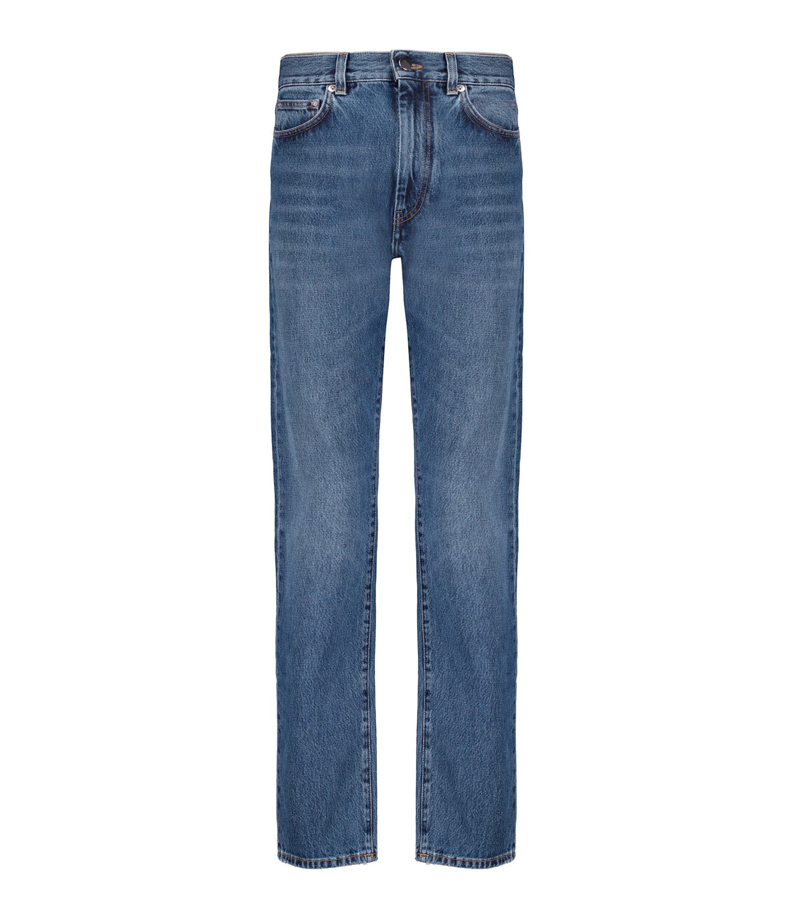 Pantalon en denim de coton bleu délavé. Passants pour ceinture. Braguette zippée et boutonnée. Boutons et rivets métalliques argentés. Deux poches italiennes et une poche à gousset. Deux poches plaquées dans le dos. Jacron blanc dans le dos. Coupe droite. Base droite avec effet usé.