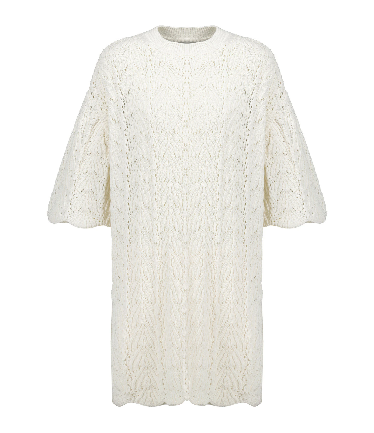 Robe courte en coton crocheté ivoire. Col rond côtelé. Manches trois-quarts évasées. Coupe droite. Base légèrement ondulée.