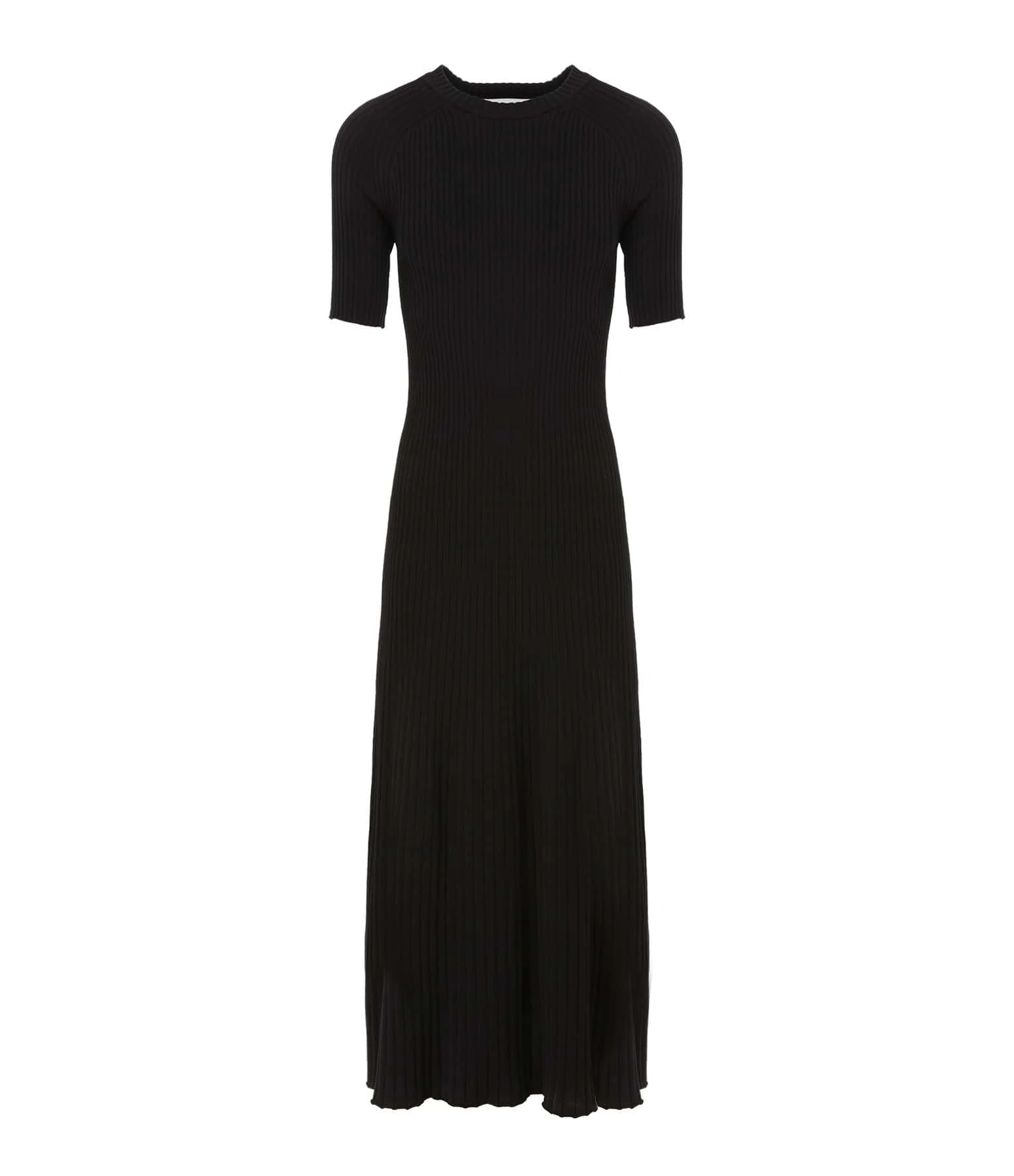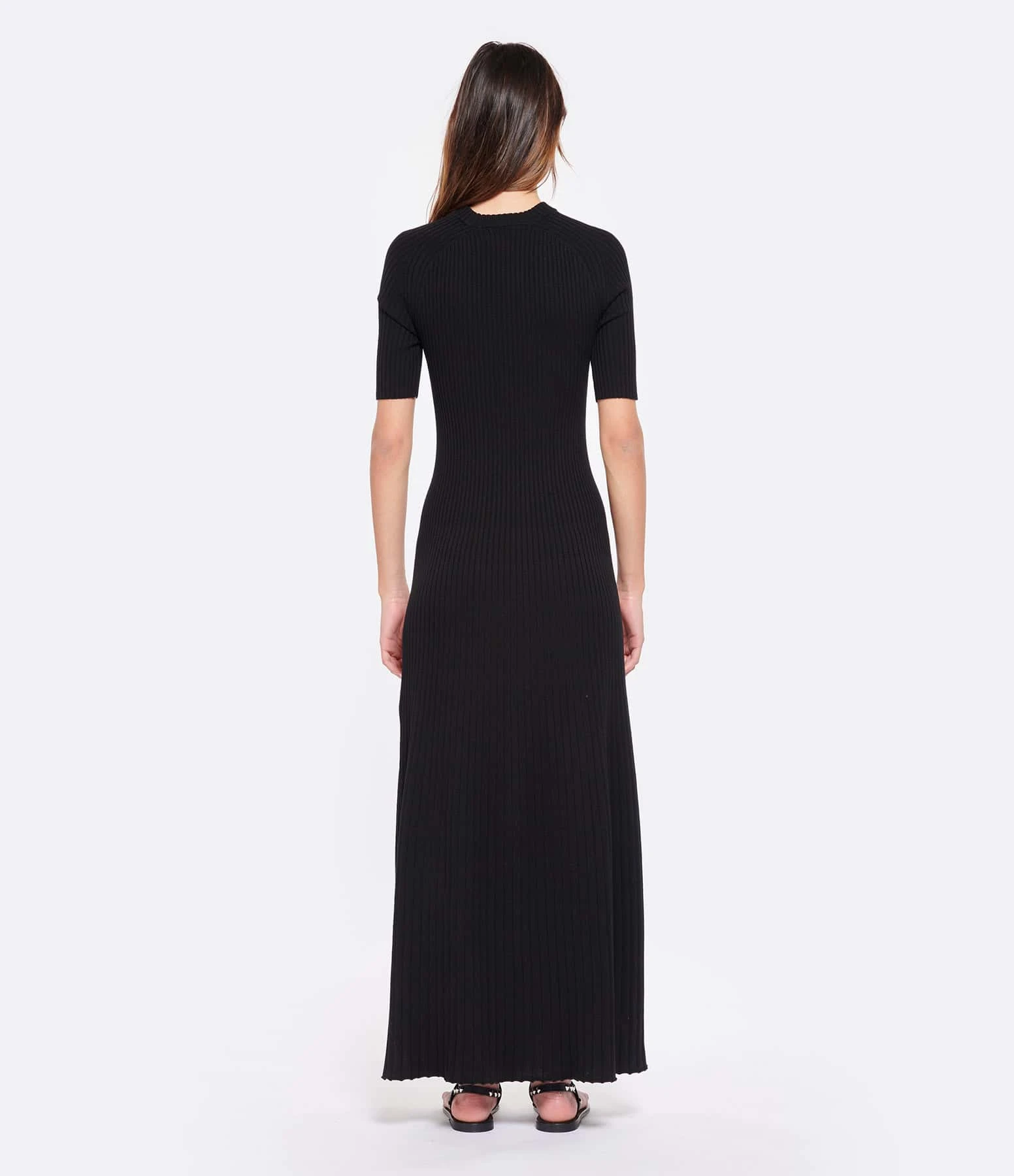 Robe longue côtelée noire. Manches courtes. Col rond. Coupe ajustée puis évasé. Base droite.