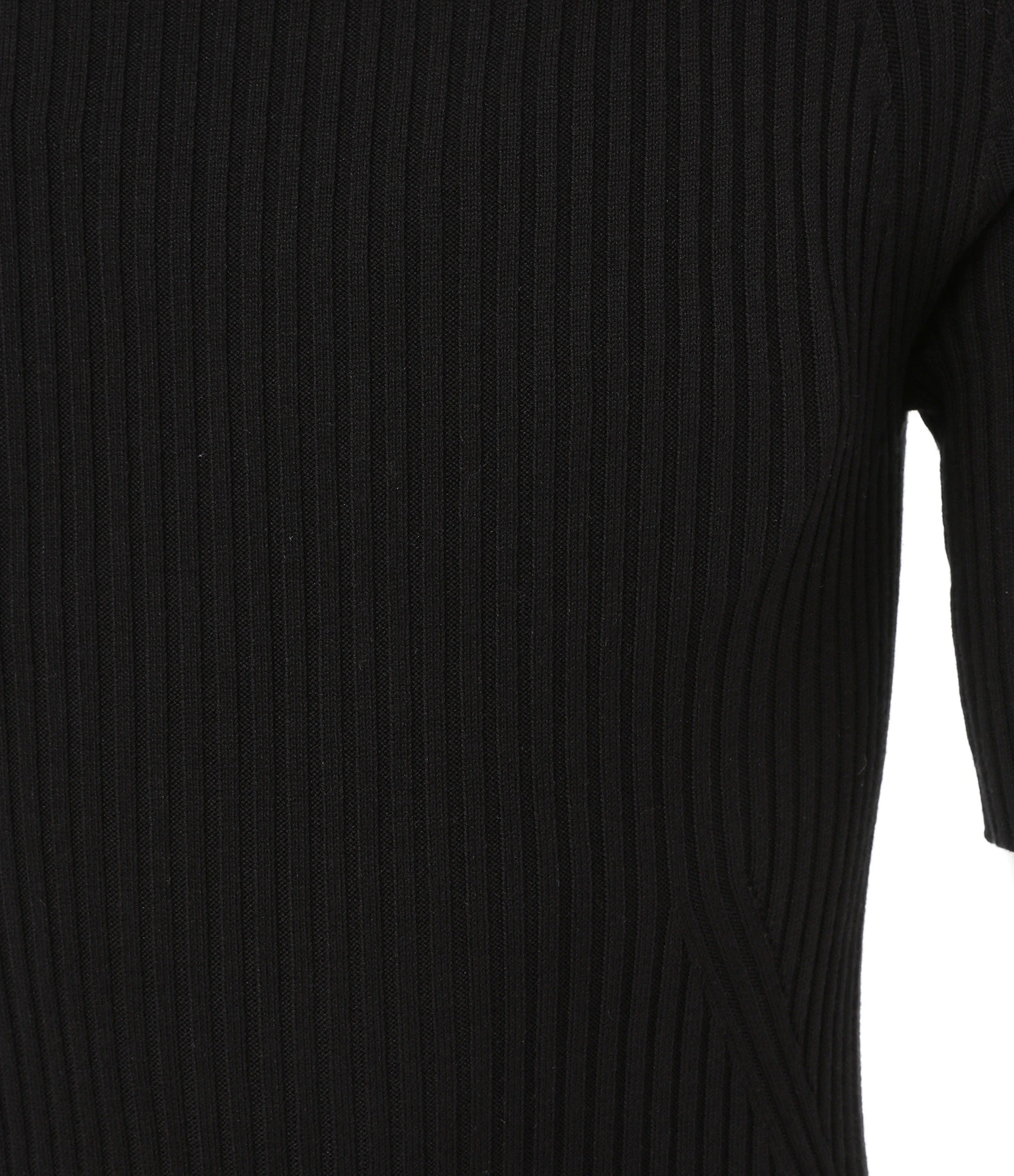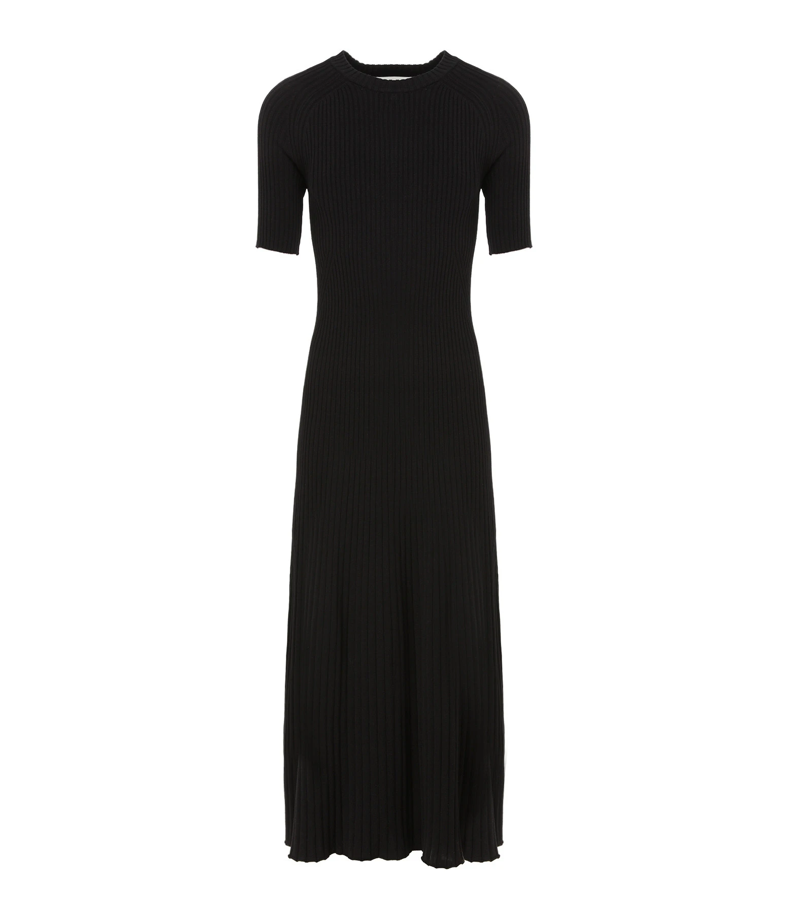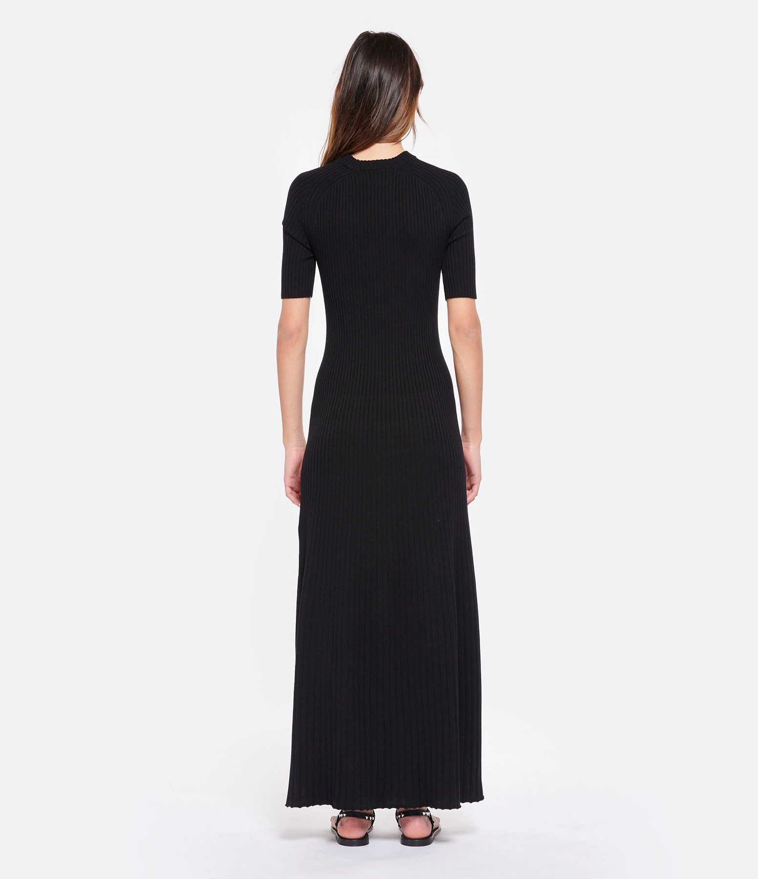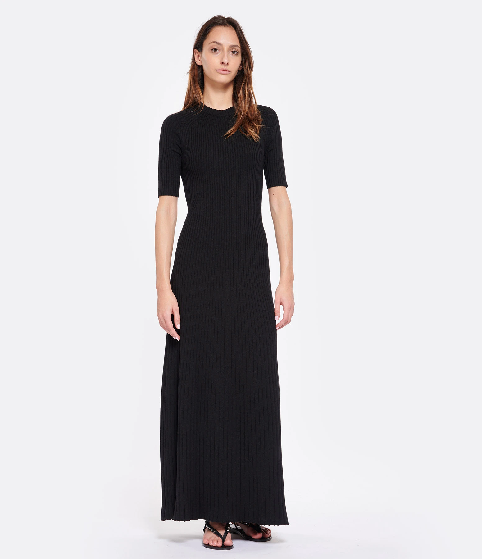 Robe longue côtelée noire. Manches courtes. Col rond. Coupe ajustée puis évasé. Base droite.